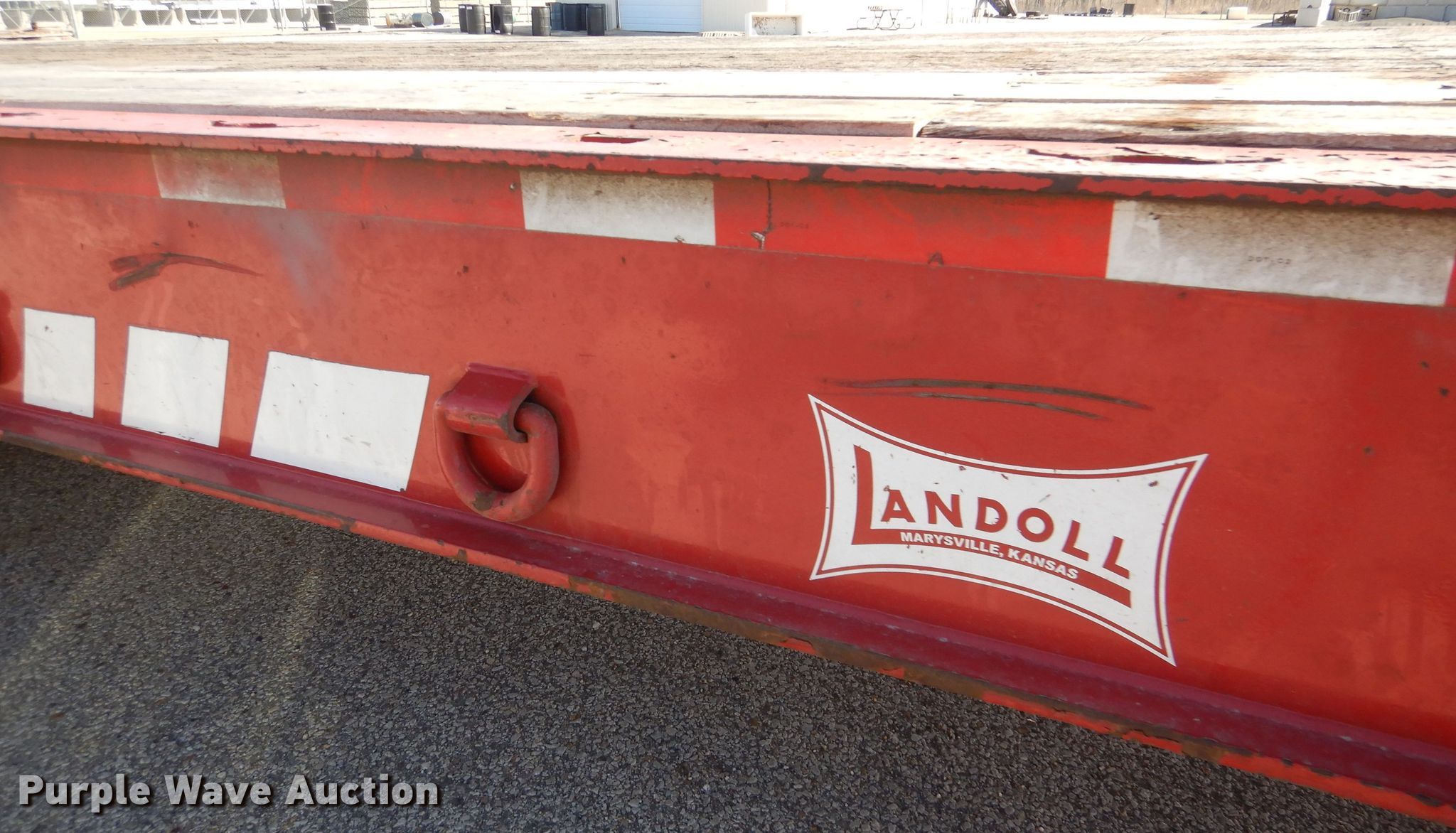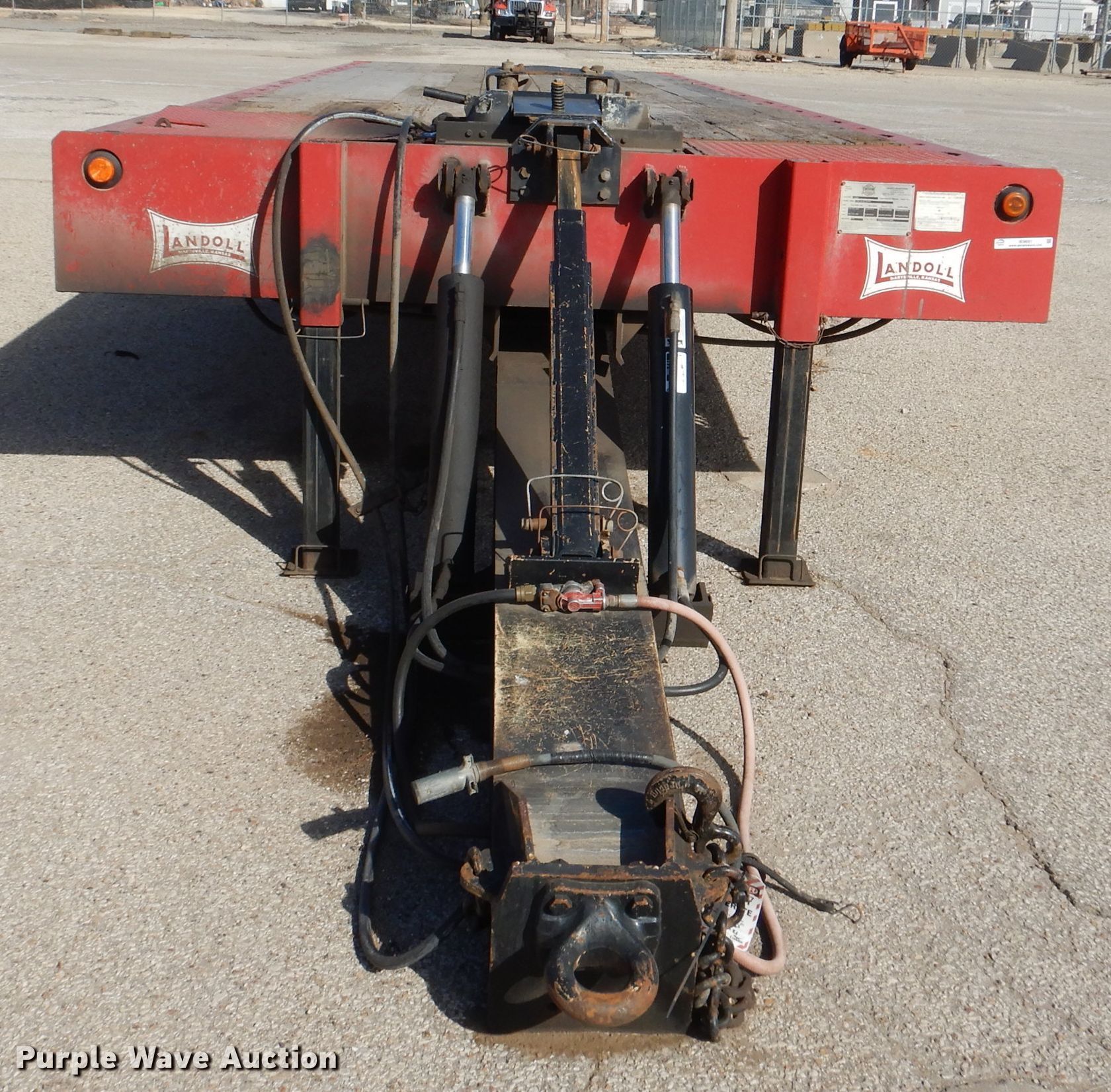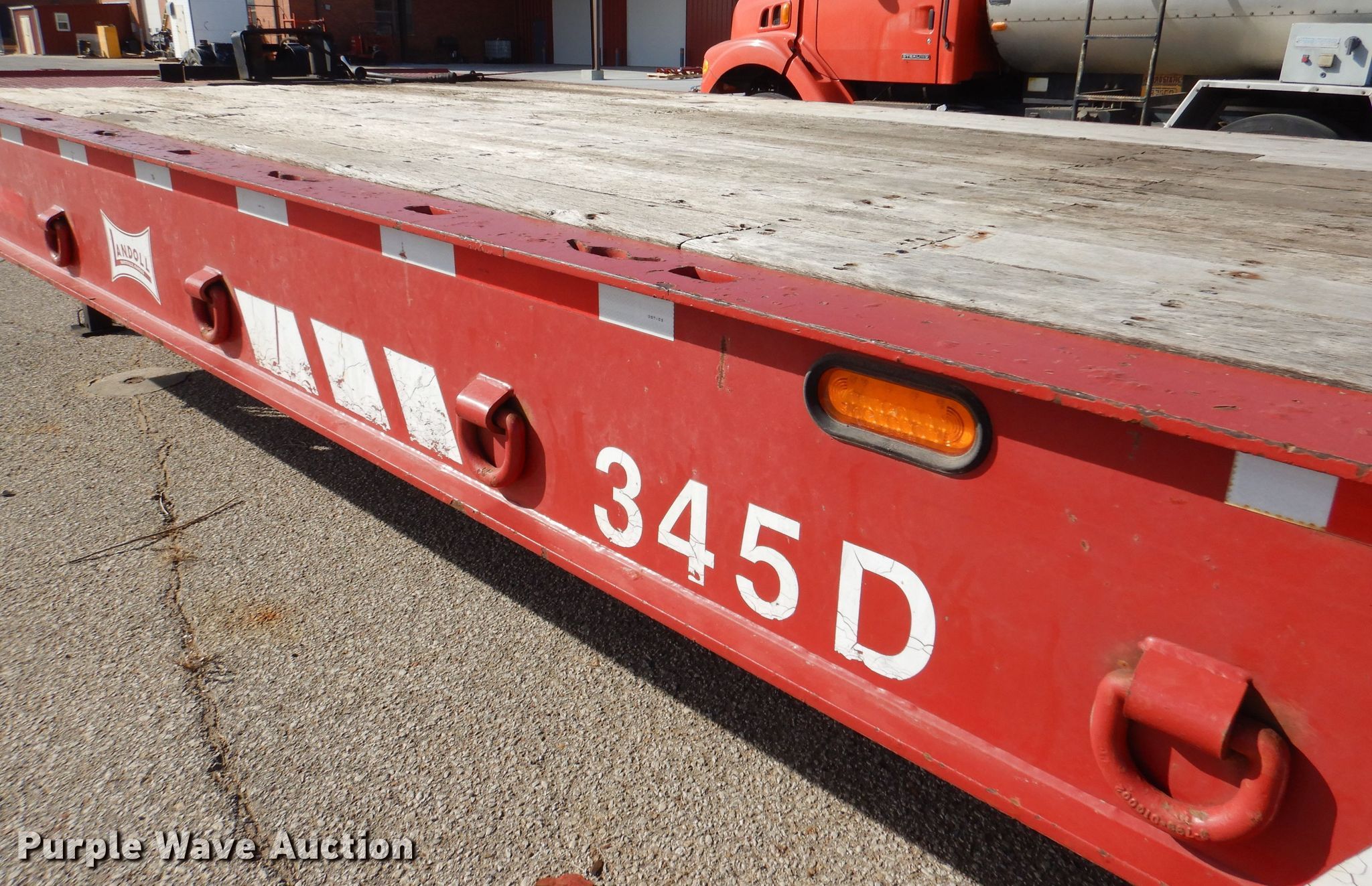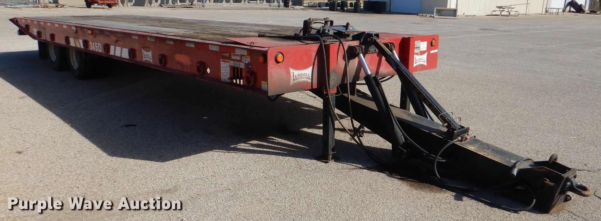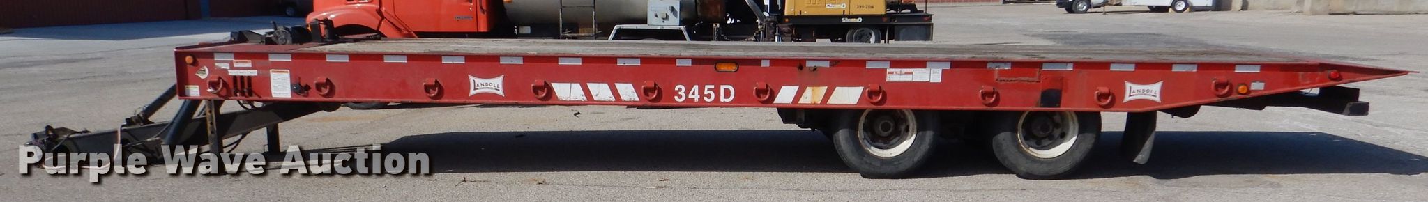 2008 Landoll 345D tilt deck equipment trailer. VIN: 1LH345JH781D16862, KDOT ID: 777-2057. Dimensions Overall: 38' L x 102" W, Deck: 31' L x 102" W. Operational Deck type: Wood, Winch Dayton, Capacity: 12,000 lbs, Hydraulic controls: Manual. Chassis Hitch: Pintle, Landing gear: Dual, Suspension: Spring, Brakes: Air, Axles: Tandem, GVWR: 50,000 lbs, GAWR: 17,640 lbs. Tires Steel wheels, Size: 10R17.5. Notes Rust hole in frame, (2) knobs broken, Non-operational unit. Kansas title. Titles will be distributed after confirmation of payment and removal. Kansas Department of Transportation - Salina. 1006 North 3rd. Salina, KS 67401
