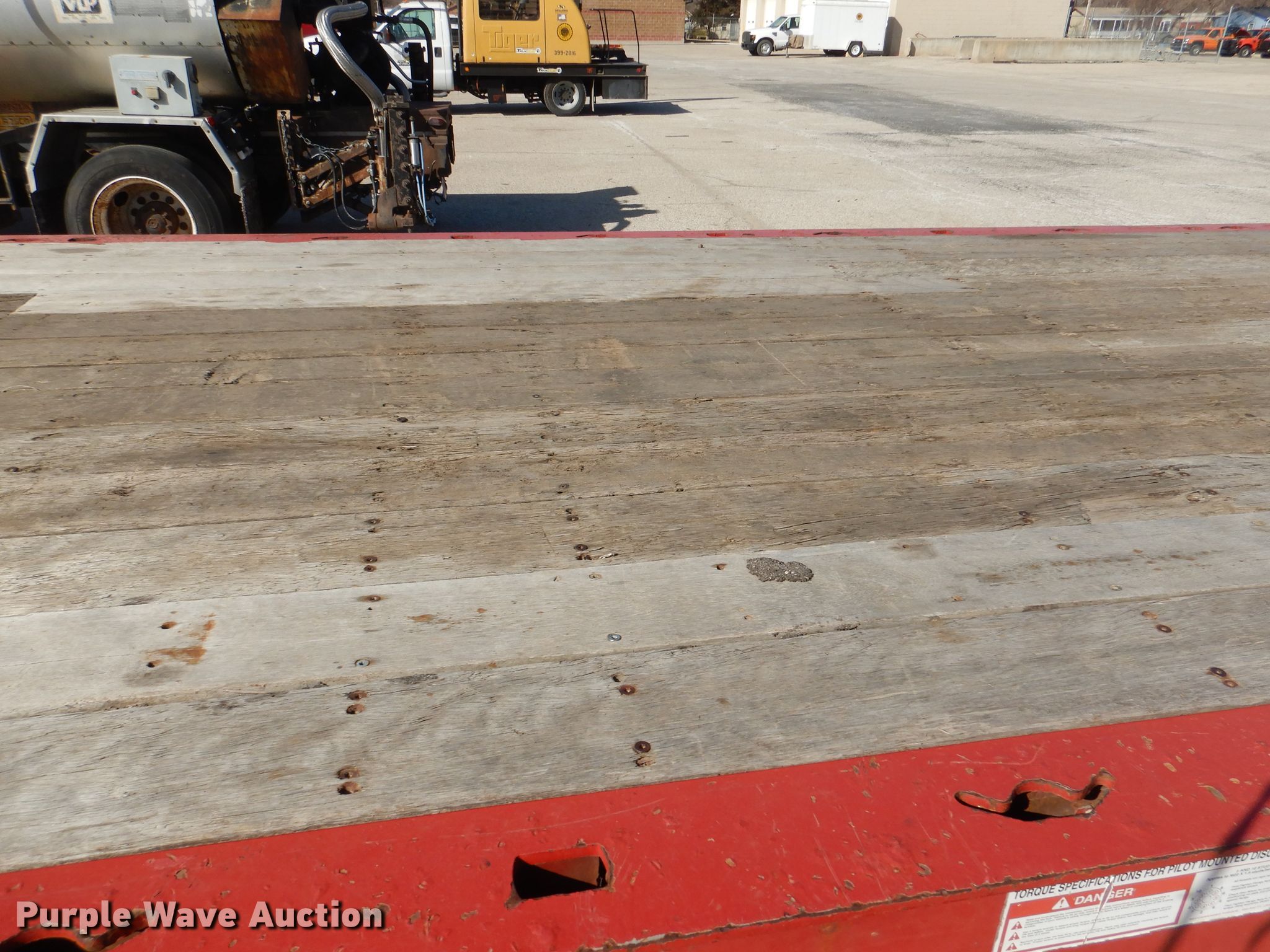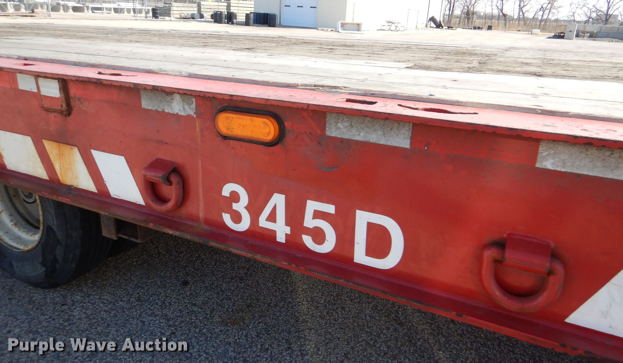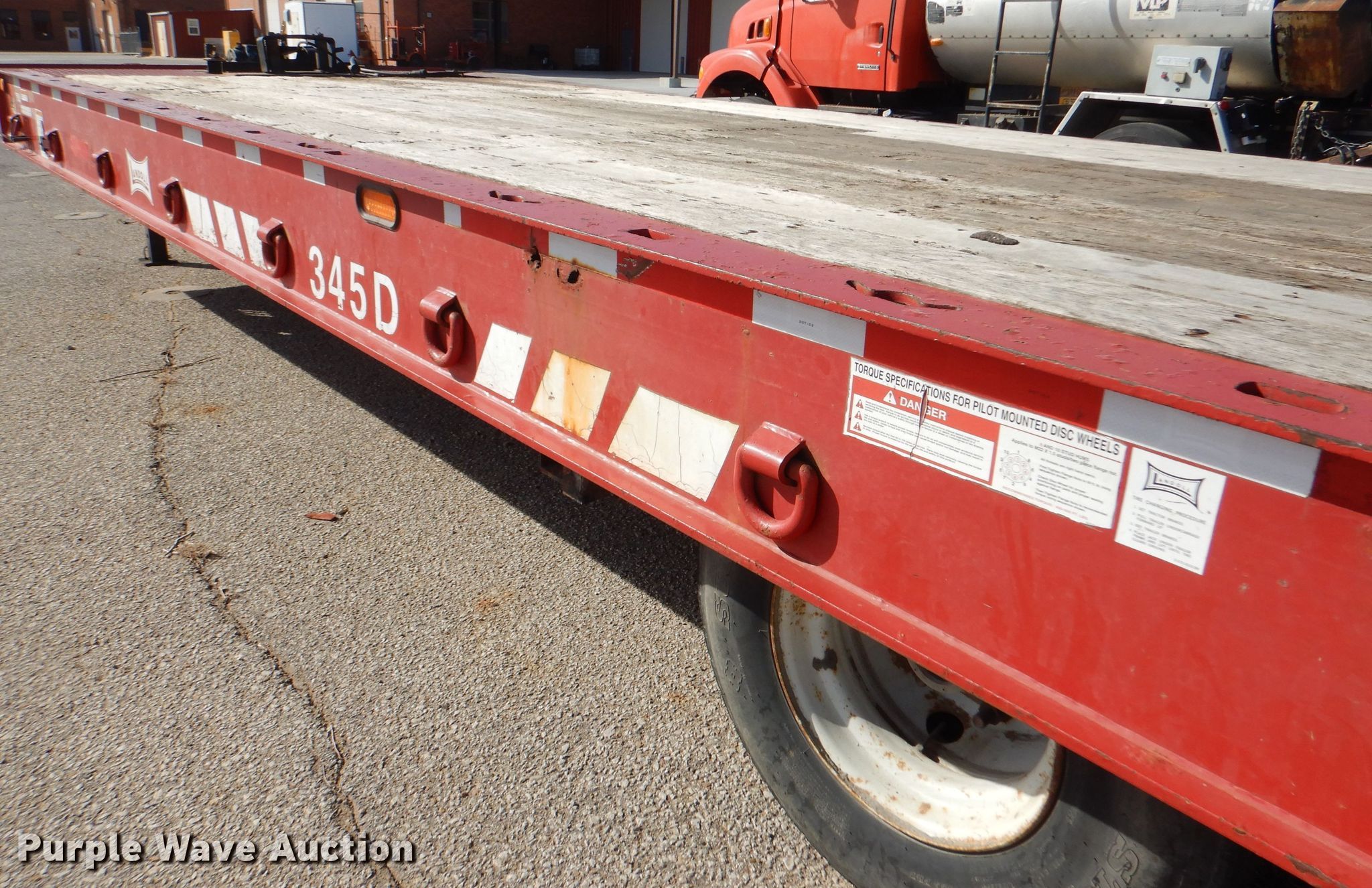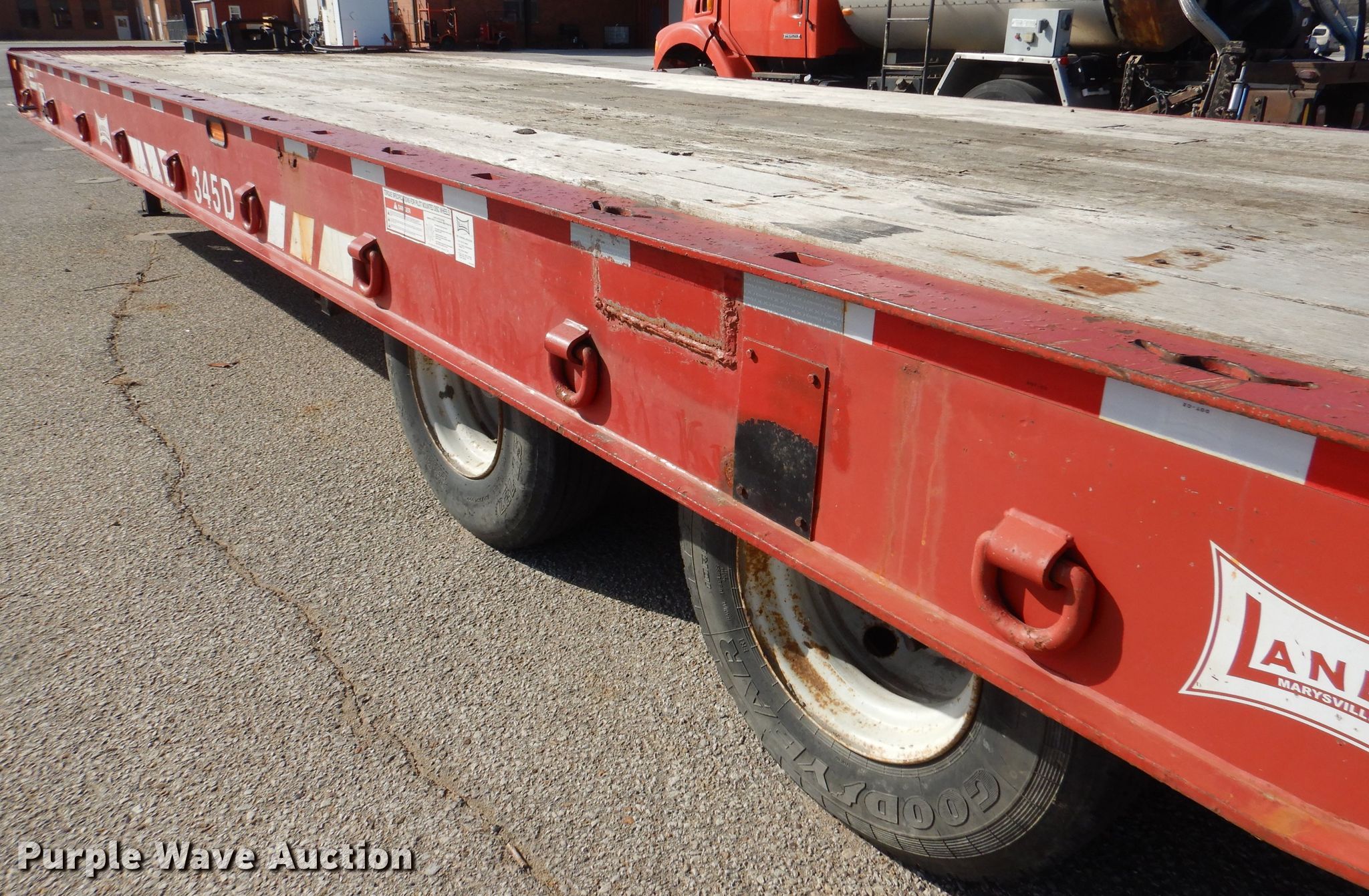 2008 Landoll 345D tilt deck equipment trailer. VIN: 1LH345JH781D16862, KDOT ID: 777-2057. Dimensions Overall: 38' L x 102" W, Deck: 31' L x 102" W. Operational Deck type: Wood, Winch Dayton, Capacity: 12,000 lbs, Hydraulic controls: Manual. Chassis Hitch: Pintle, Landing gear: Dual, Suspension: Spring, Brakes: Air, Axles: Tandem, GVWR: 50,000 lbs, GAWR: 17,640 lbs. Tires Steel wheels, Size: 10R17.5. Notes Rust hole in frame, (2) knobs broken, Non-operational unit. Kansas title. Titles will be distributed after confirmation of payment and removal. Kansas Department of Transportation - Salina. 1006 North 3rd. Salina, KS 67401