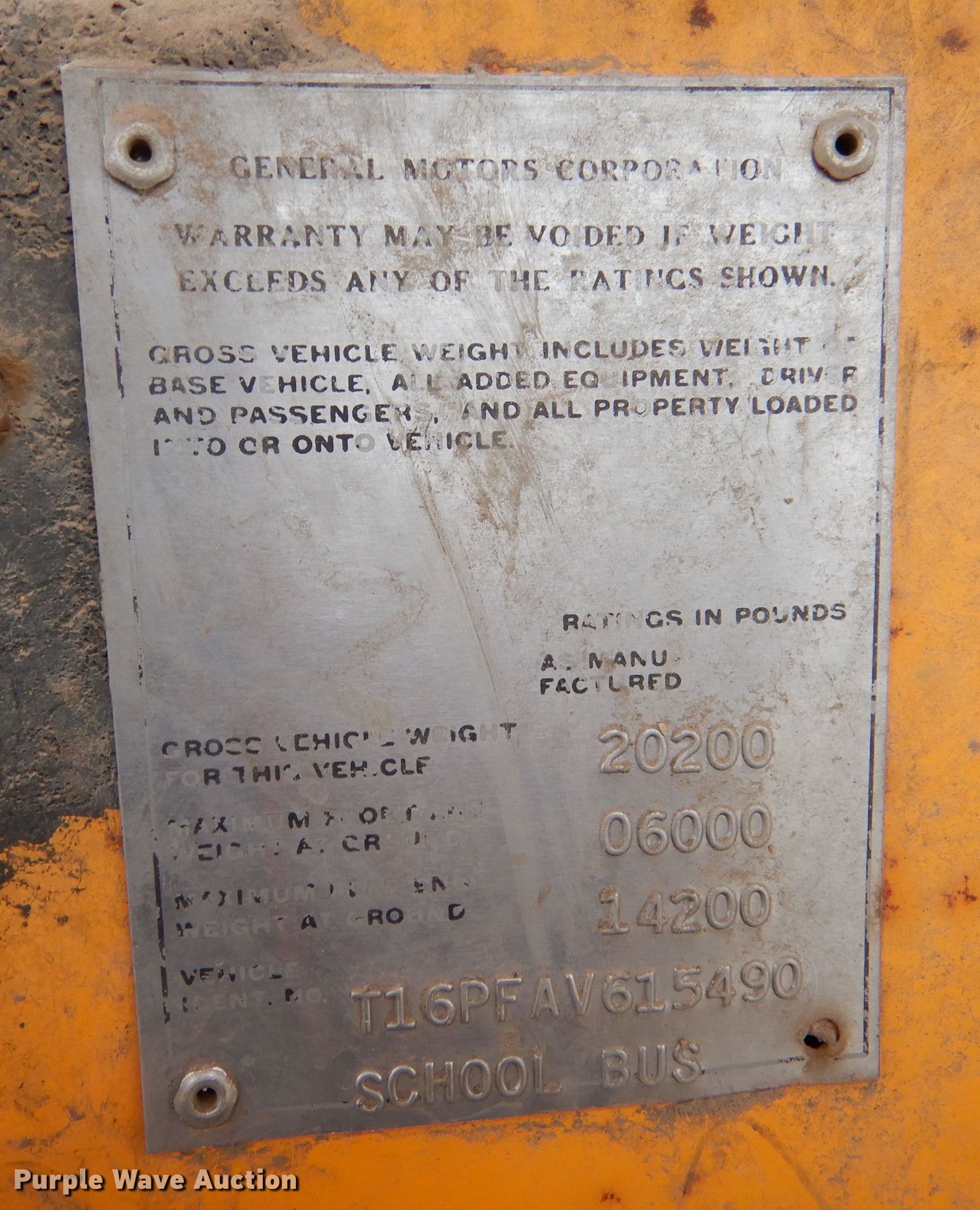 1980 GMC Wayne Lifeguard school bus. Miles: 49,326 on odometer Actual mileage unknown, VIN: T16PFAV615490. Engine No engine. Transmission No transmission. Chassis Axles: Single, Suspension: Spring, Brakes: Hydraulic, GVWR: 20,200 lbs. Tires Size: 8.25R20. Notes Approx. 14 2" x 6" boards 7' L to 9' L, Approx. 25 2" x 6" boards 15' L to 16' L, Approx. 23 sheets of plywood, (4) spools of wire, Windshield chipped or cracked, Parts missing , Unit must be towed or hauled, Non-operational unit. Kansas antique title. Timken, KS 67575