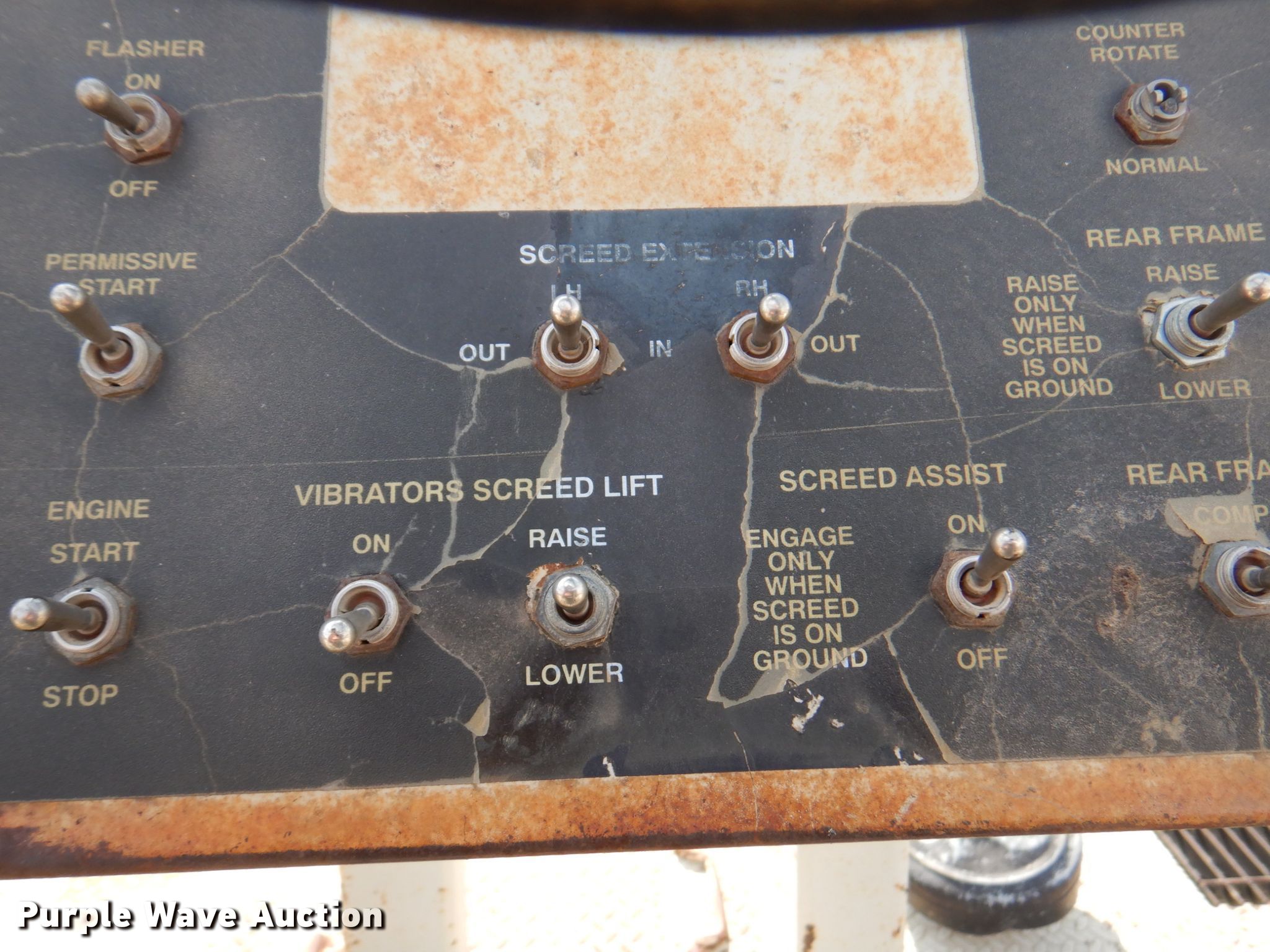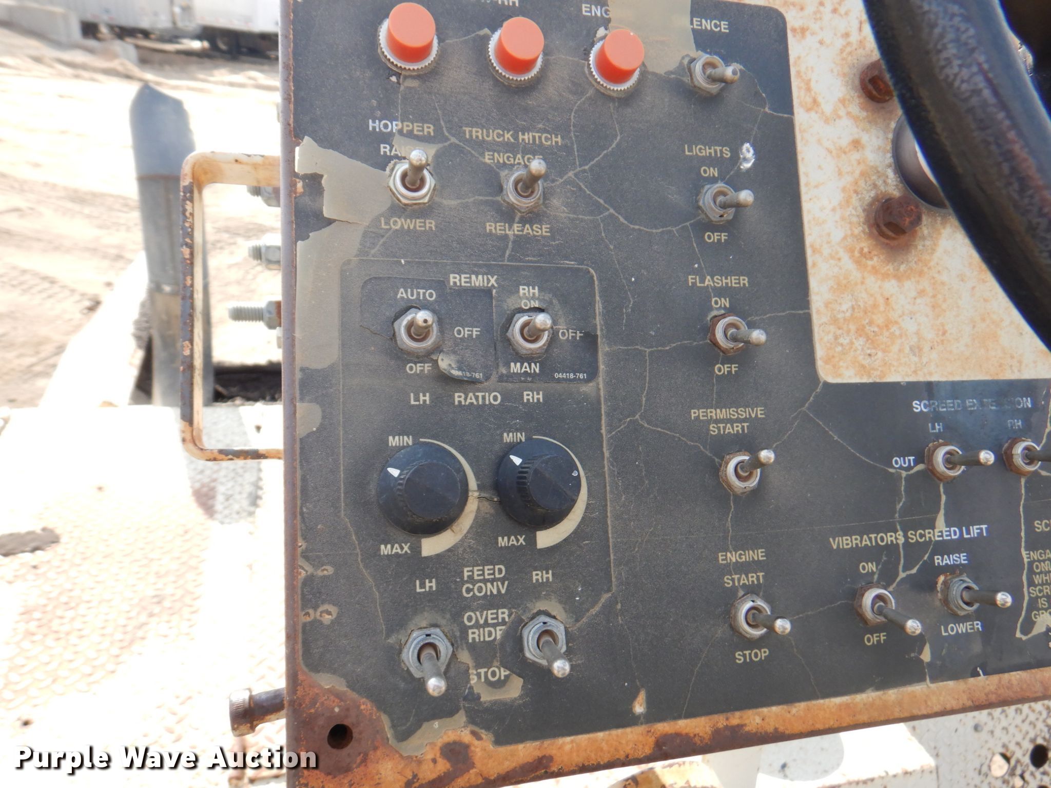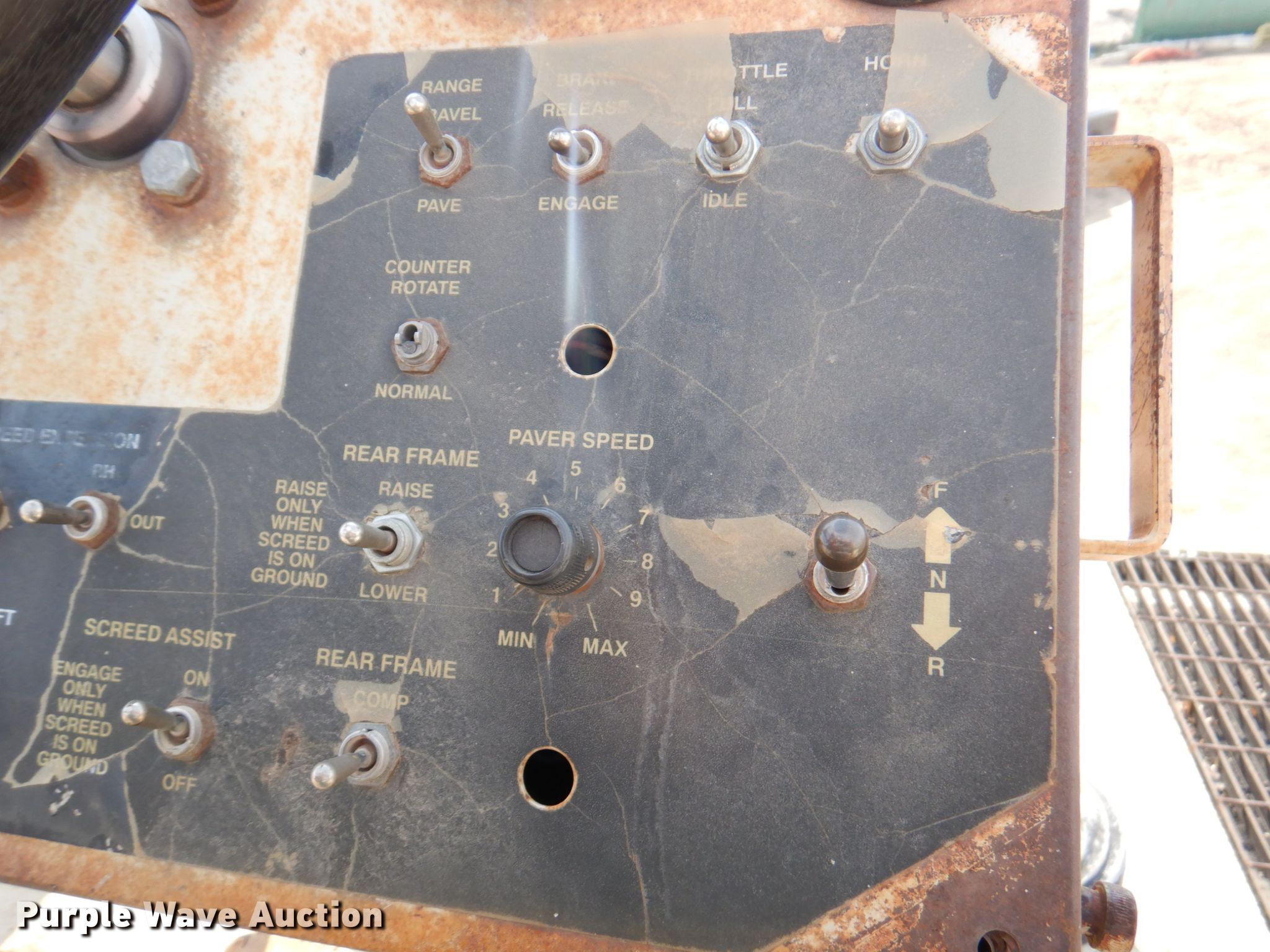 Cedarapids CR461RXR screed. Hours: 8,995 on meter, Serial: 48512. Engine Cummins, Displacement: 5.9L, Cylinders: 6, Fuel type: Diesel. Transmission Hydrostatic, 2F - 2R. Operational Screed Cedarapids Stretch 20, Paving width: 10' to 20' Quantity: 4, Screed heater: Diesel, Ground level remote. Tracks Width: 18", Rubber. Notes Right side screed extension cylinder leak. Sunflower Paving Inc.. 4185 NE Seward Ave. Topeka, KS 66616