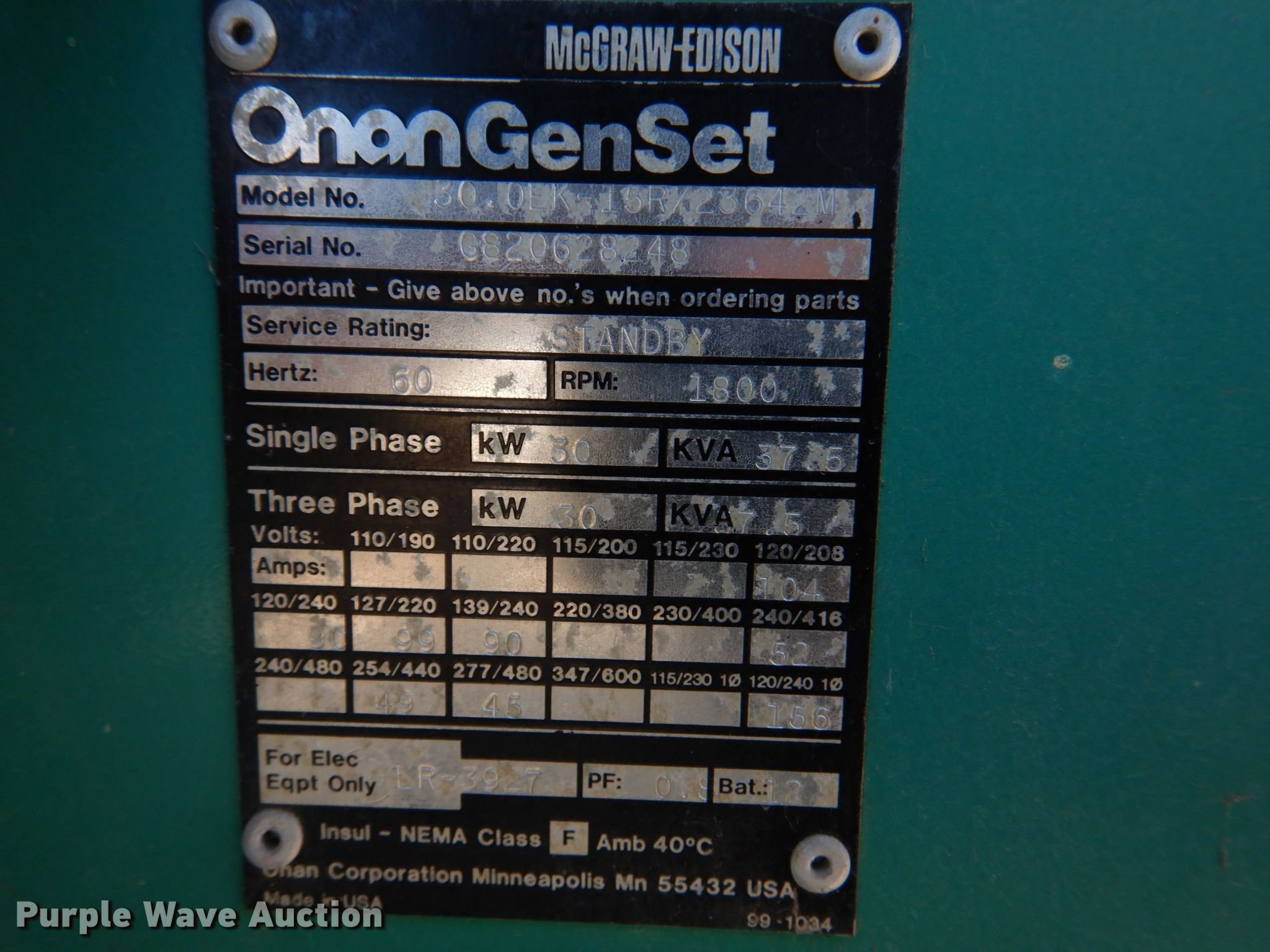Onan 30 GenSet generator. Hours: 2,018 on meter, Serial: G820628248. Engine Ford, Cylinders: 6, Fuel type: LPG. Operational Generator Onan 30.0EK-15/23642M, kVA: 37.5, kW: 30, Phase: Single, Three, Electric start. Notes No battery, Unknown operating condition. GRM Networks. 1001 Kentucky St. Princeton, MO 64673