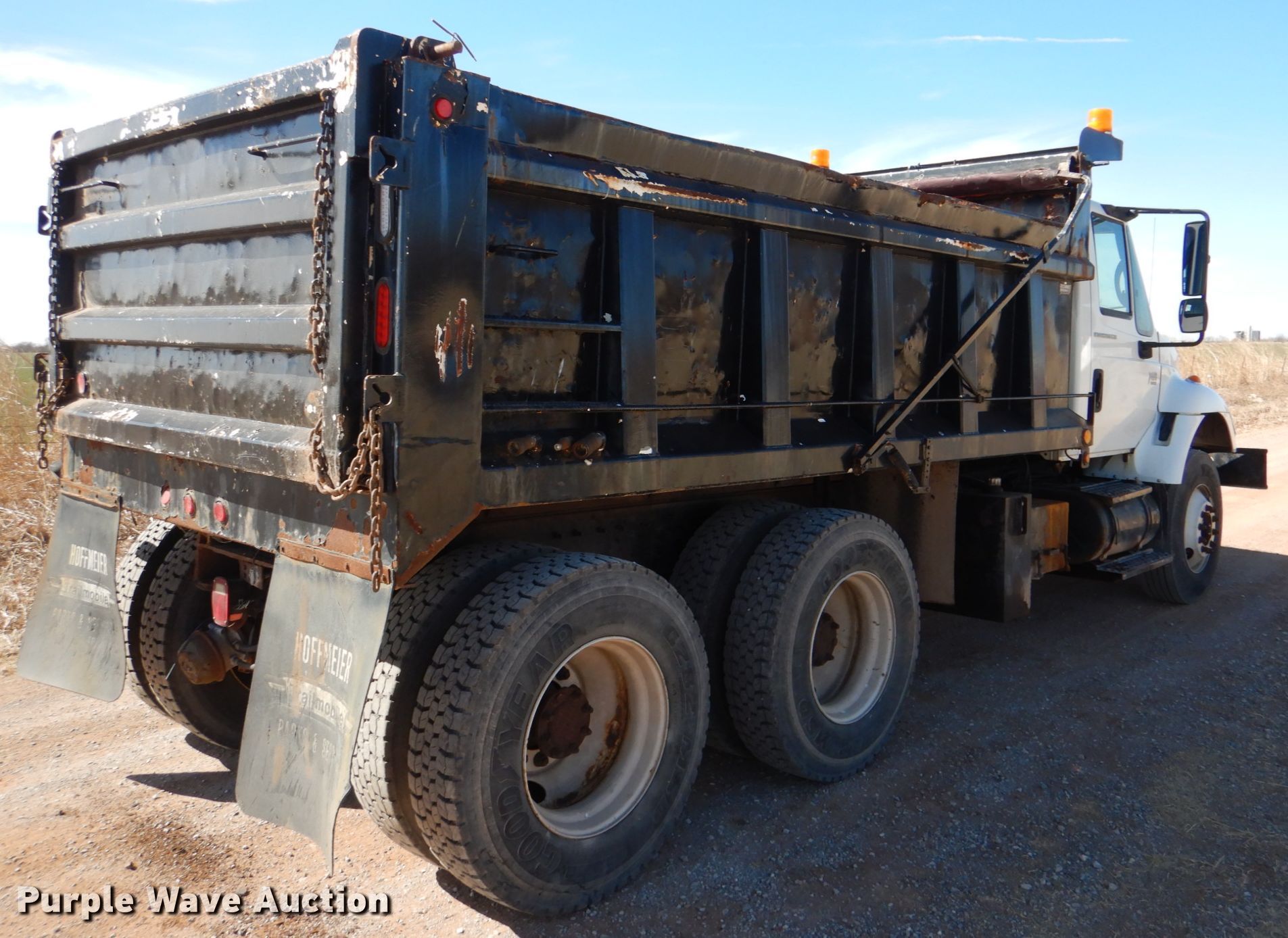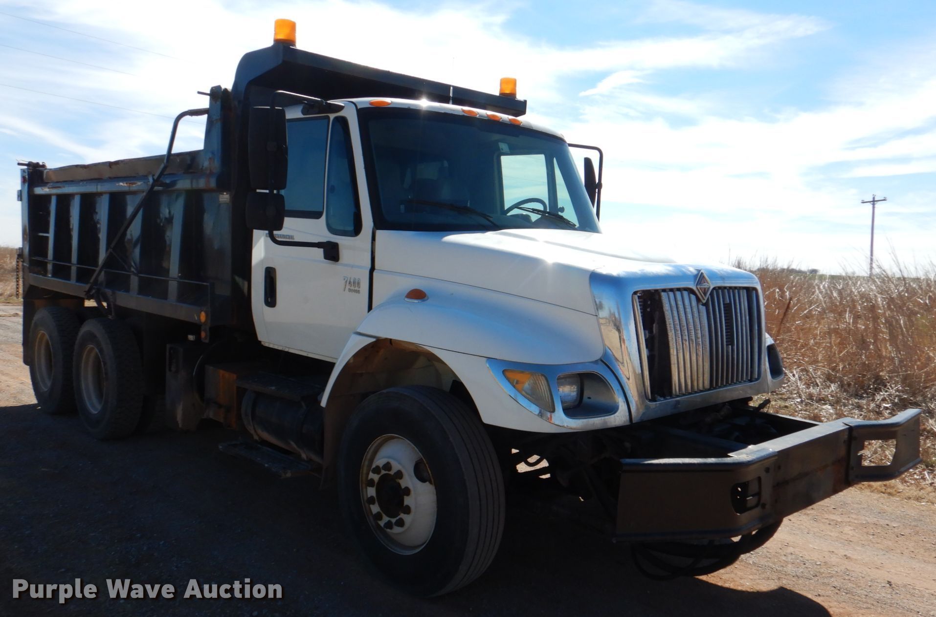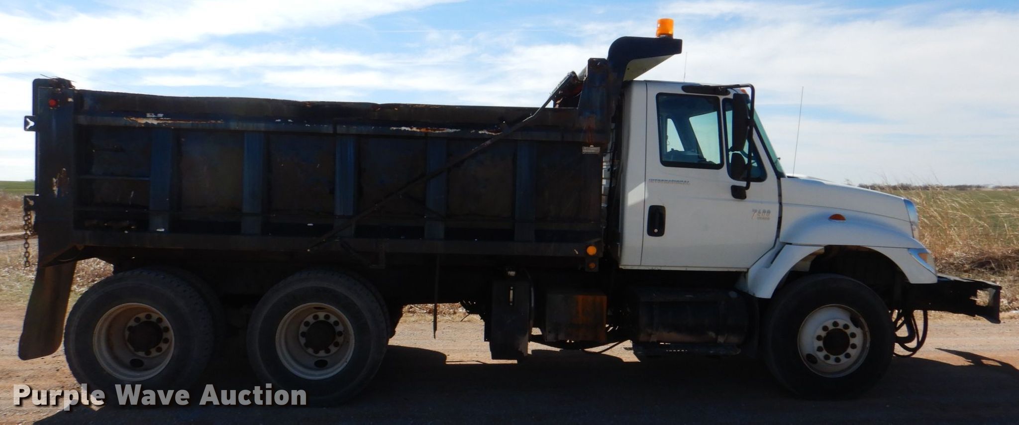 2005 International 7400 dump truck. Miles: 98,316 on odometer, Hours: 5,866 on meter, VIN: 1HTWGAAR15J038186. Engine International DT466, Displacement: 7.6L, Cylinders: 6, Fuel type: Diesel. Transmission Automatic. Chassis Axles: Tandem, Suspension: Spring over walking beam, Brakes: Air, PTO, Front mount PTO. Interior AC, Heat. Operational Dump bed 14' L x 8' W, Side height: 40", Side board height: 6", Bed type: Steel, Roll tarp, Ram: Single , End gate: Manual. Tires Size: 11R22.5. Notes Dash warning indicator: Check engine, ABS. Oklahoma title. 4E Farms. 186969 NS 2590 Rd. Hastings, OK 73548