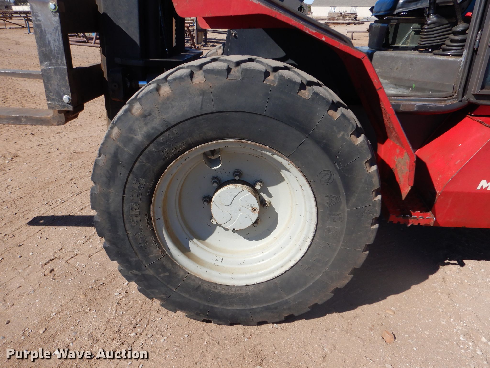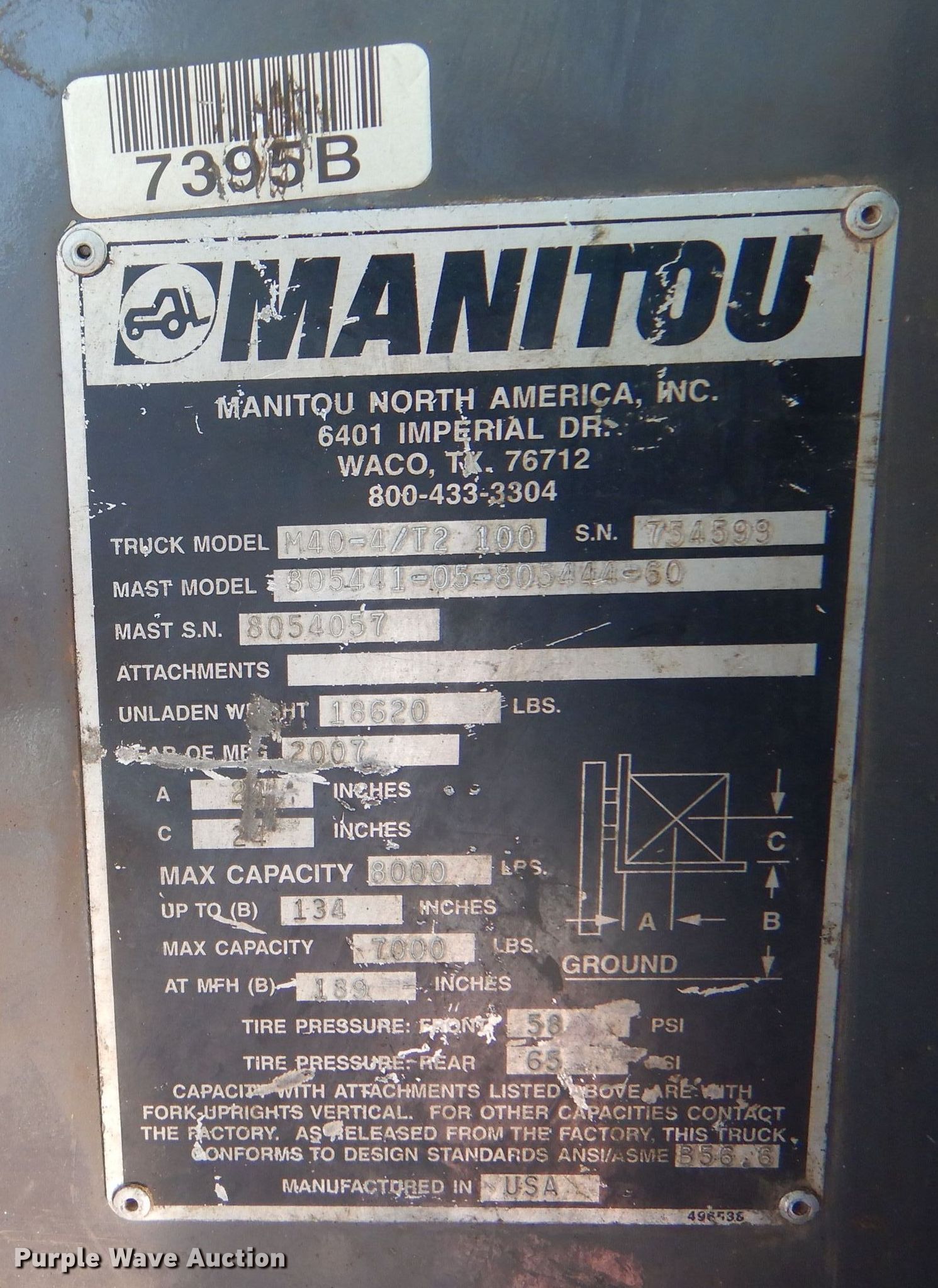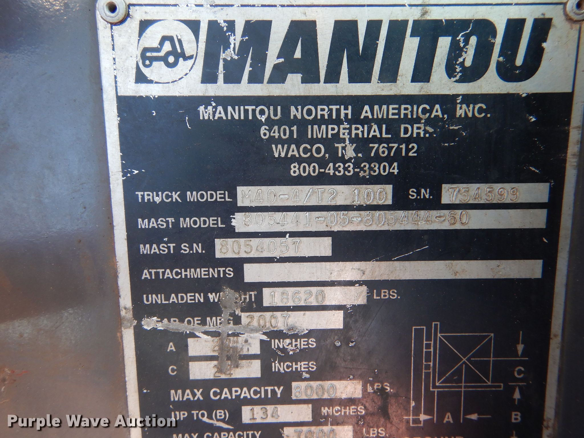 2007 Manitou M40-4 forklift. Hours: 16,484 on meter, Serial: 754599. Engine Perkins, Cylinders: 4, Fuel type: Diesel. Transmission Shuttle shift, 4F - 4R. Chassis Four wheel drive, Differential lock. Operators station EROPS Heat. Operational Maximum lift capacity: 8,000 lbs, Maximum lift height: 189", Mast stages: 3, Side shift, Mast tilt, Fork length: 70". Tires Front: 15.5R25, Rear: 12-16.5. Notes Glass cracked. Double F Pump & Supply. Great Bend, KS 67530