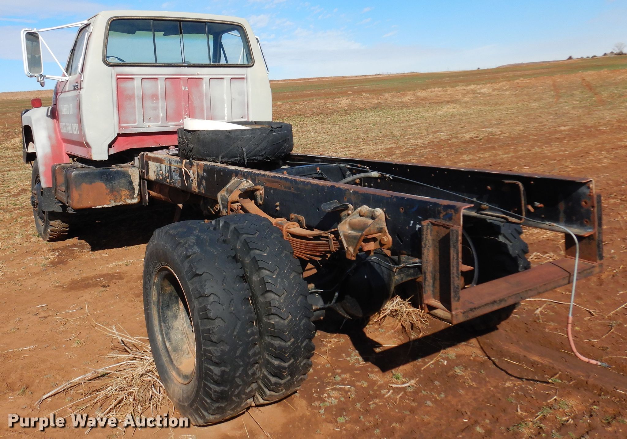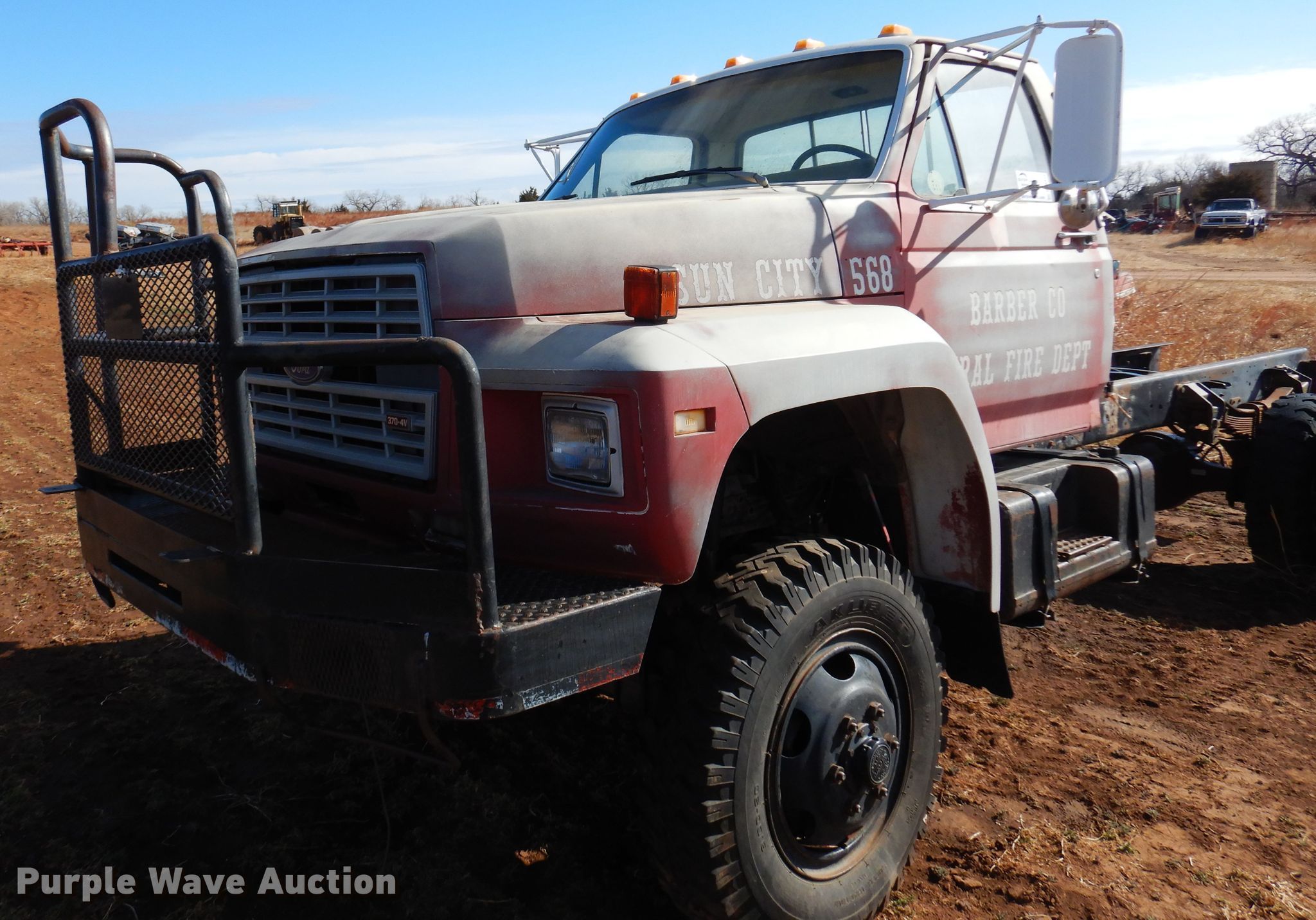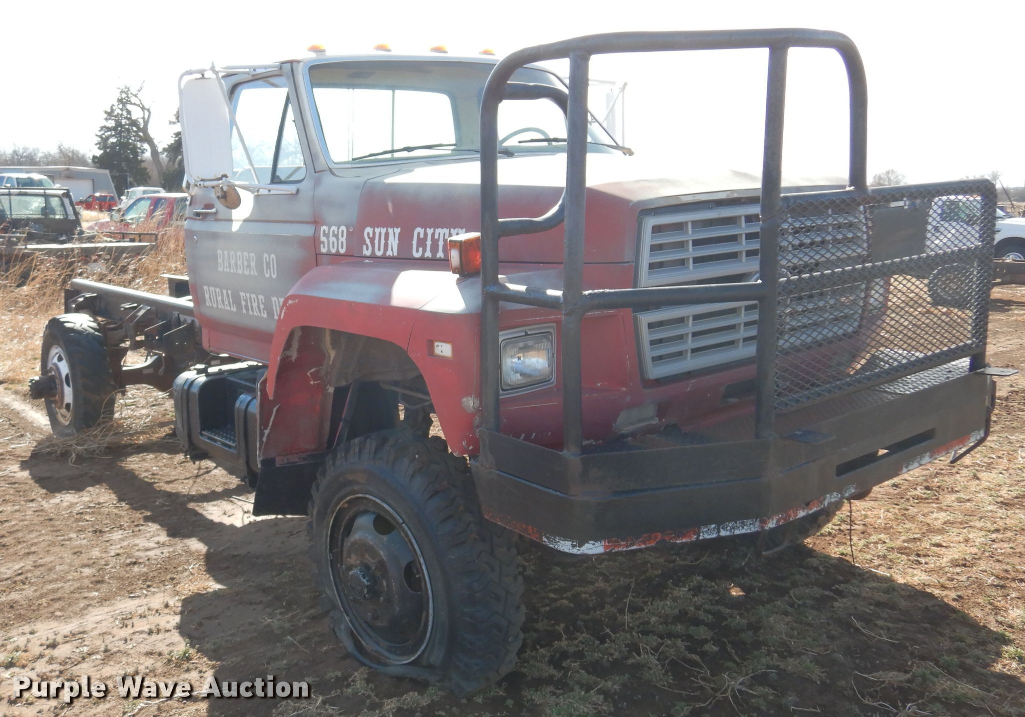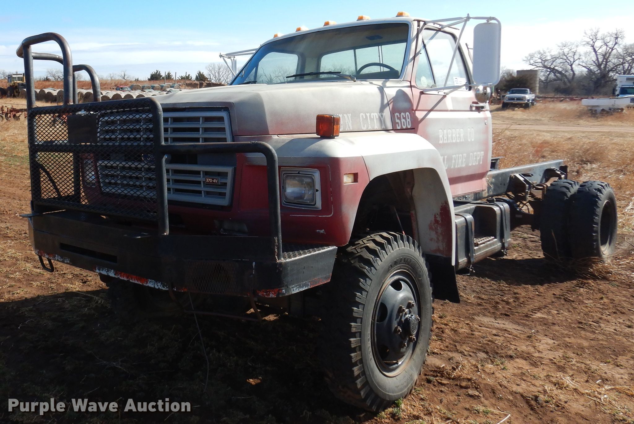 1986 Ford F700 truck cab and chassis. Miles: 77,368 on odometer, VIN: 1FDNF77H8GVA15878. Engine Displacement: 6.1L, Cylinders: 8, Fuel type: Gas. Transmission Manual, Speed: 5. Chassis Four wheel drive, Axles: Single, Suspension: Spring, Brakes: Hydraulic, Truck chassis: 12' 4" L. Interior Heat. Features Fuel tank: Dual. Tires Size: 9.00R20. Notes Engine issues, Transmission issues, Dead battery, Non-operational unit. Kansas title. Barber County Fire. Medicine Lodge, KS 67104