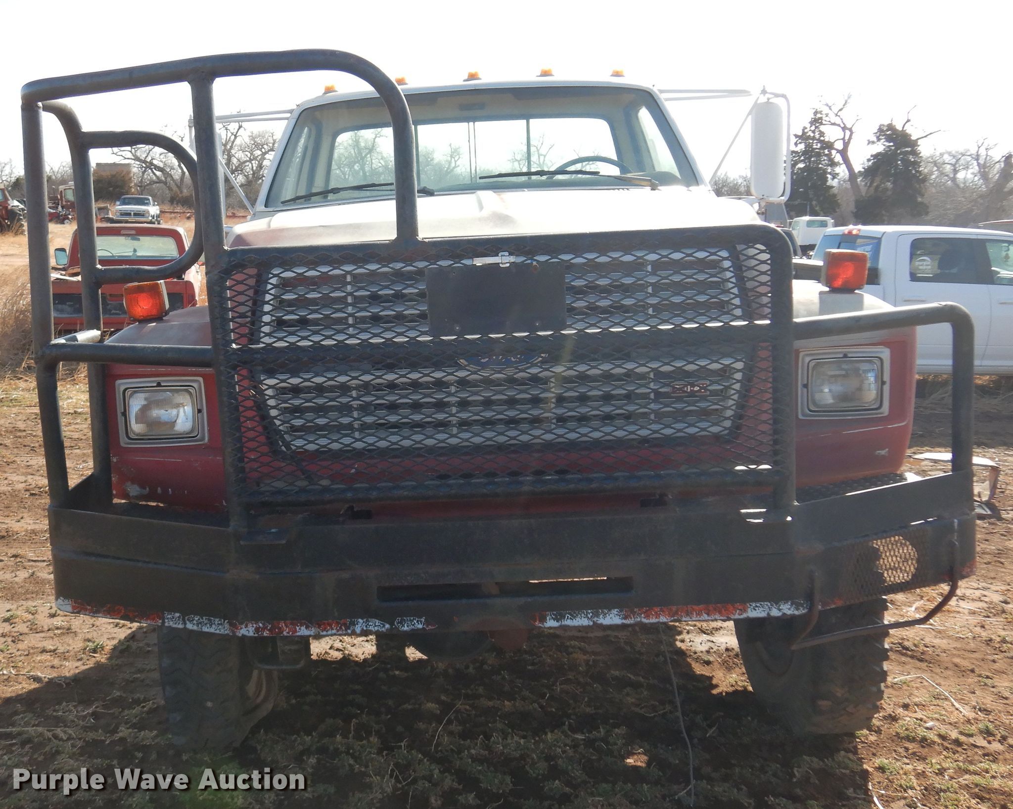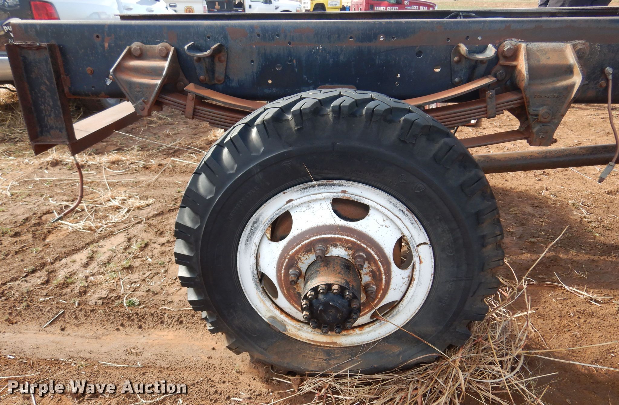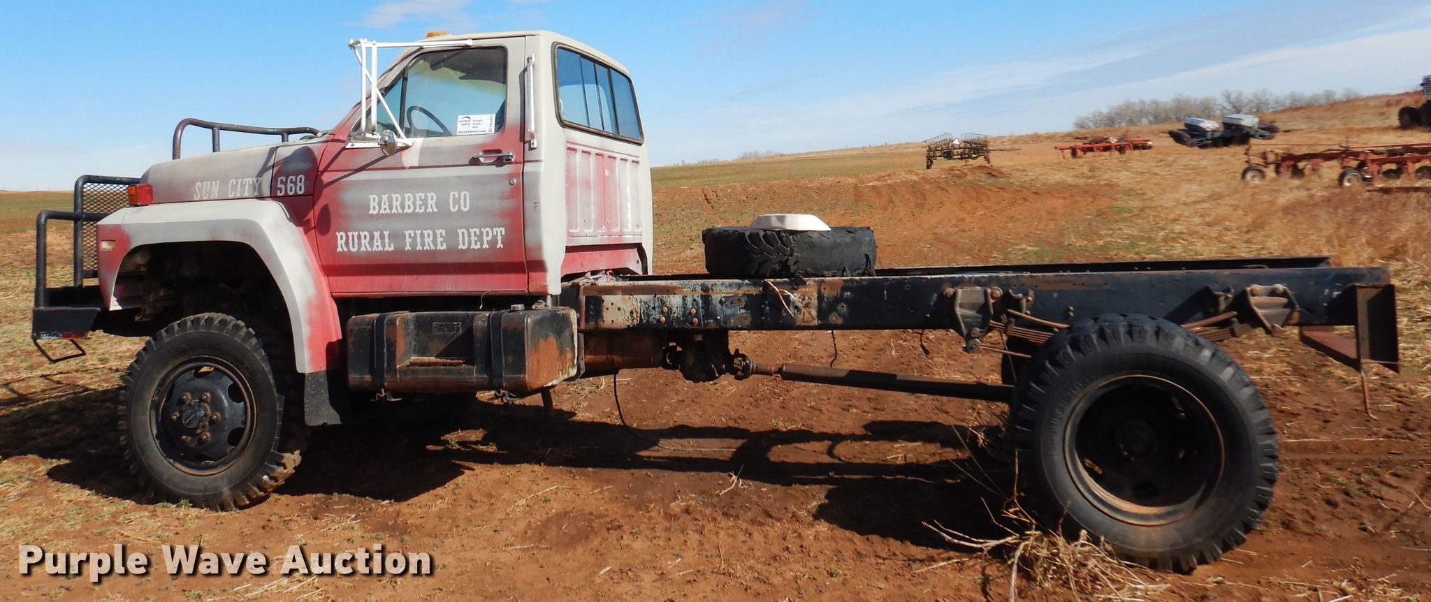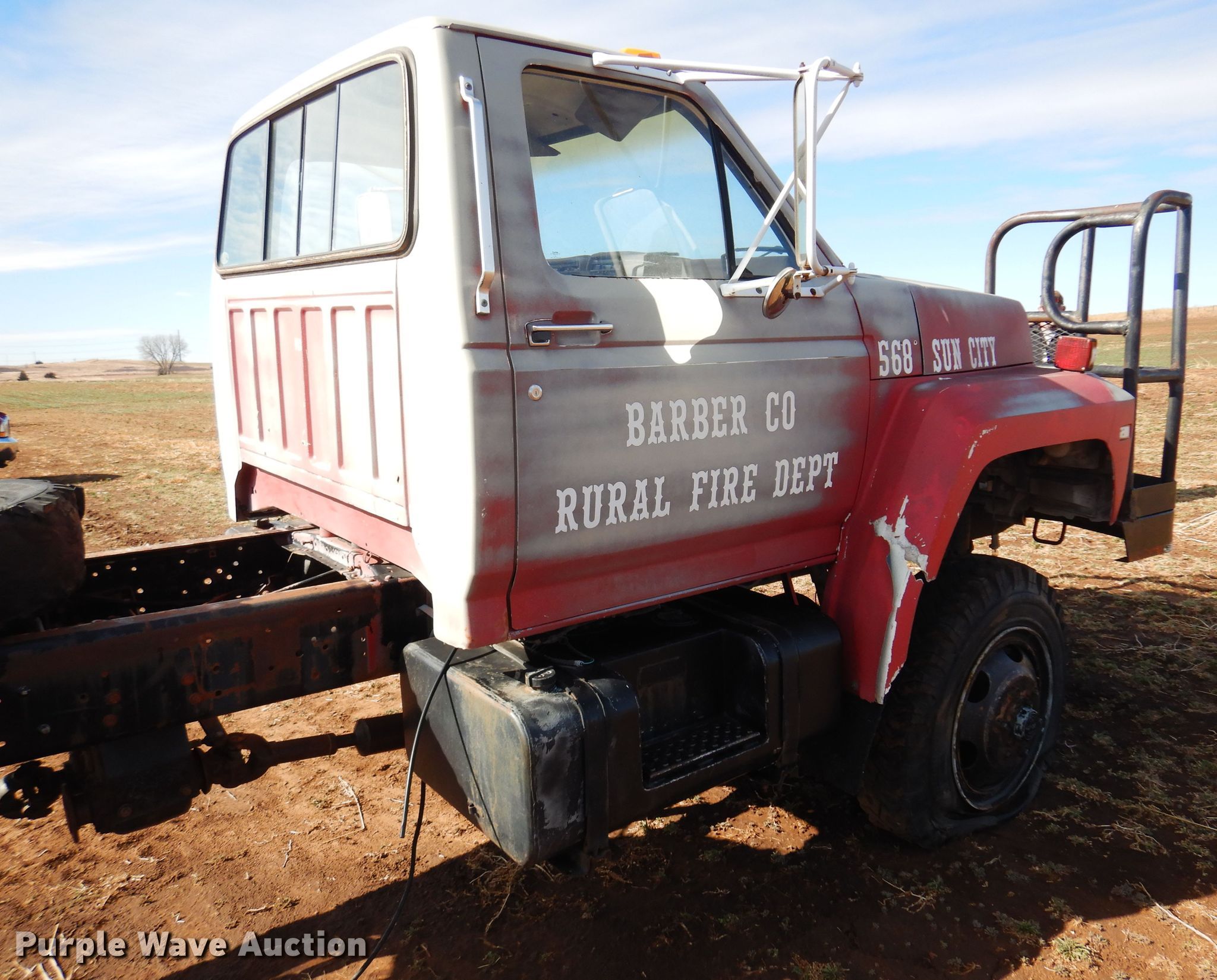 1986 Ford F700 truck cab and chassis. Miles: 77,368 on odometer, VIN: 1FDNF77H8GVA15878. Engine Displacement: 6.1L, Cylinders: 8, Fuel type: Gas. Transmission Manual, Speed: 5. Chassis Four wheel drive, Axles: Single, Suspension: Spring, Brakes: Hydraulic, Truck chassis: 12' 4" L. Interior Heat. Features Fuel tank: Dual. Tires Size: 9.00R20. Notes Engine issues, Transmission issues, Dead battery, Non-operational unit. Kansas title. Barber County Fire. Medicine Lodge, KS 67104