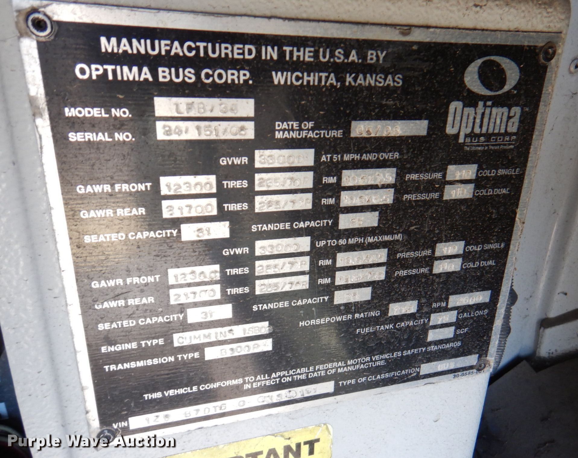2006 Optima transit bus. Miles: Unknown, VIN: 1Z9B7DTS06W216151. Engine Cummins ISB, Cylinders: 6, Fuel type: Diesel, HP: 275. Transmission Allison, Automatic. Chassis Axles: Single, Suspension: Air, Brakes: Air, GVWR: 33,000 lbs. Interior AC, Heat, Passengers: 31. Tires Size: 285/70R19.5. Notes Additional parts included, Non-operational unit. Kansas title. Title distribution may be delayed up to 14 days from verification of funds. Lawrence Transit System. 1260 Timberedge Rd. Lawrence, KS 66046