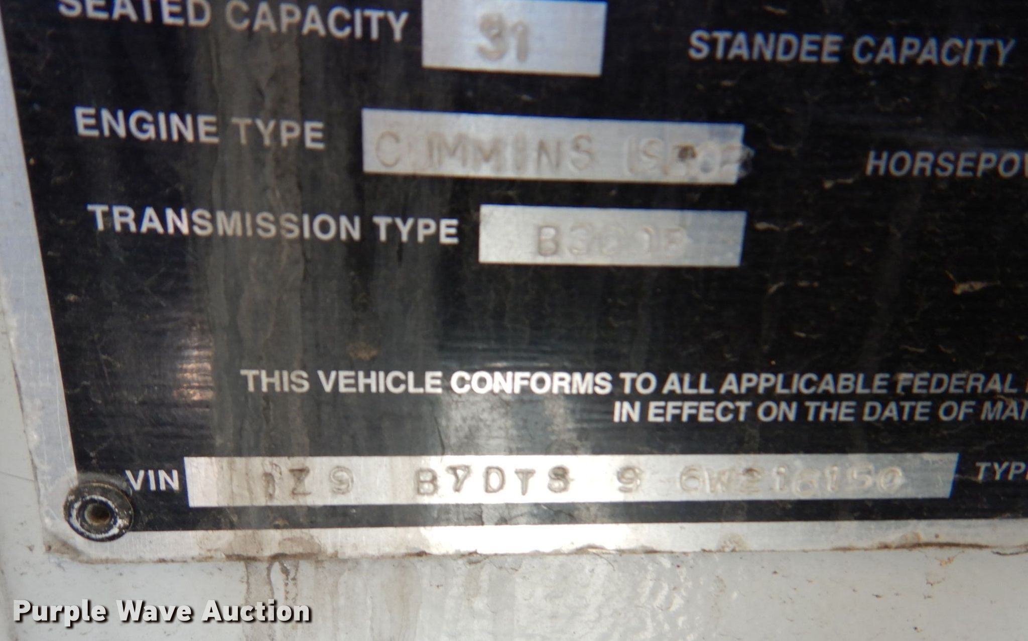 2006 Optima transit bus. Miles: Unknown, VIN: 1Z9B7DTS96W216150. Engine Cummins ISC, Cylinders: 6, Fuel type: Diesel, HP: 275. Transmission Allison, Automatic. Chassis Axles: Single, Suspension: Air, Brakes: Air, GVWR: 33,000 lbs. Interior AC, Heat, Passengers: 31. Tires Size: 285/70R19.5. Notes Non-operational unit. Kansas title. Title distribution may be delayed up to 14 days from verification of funds. Lawrence Transit System. 1260 Timberedge Rd. Lawrence, KS 66046