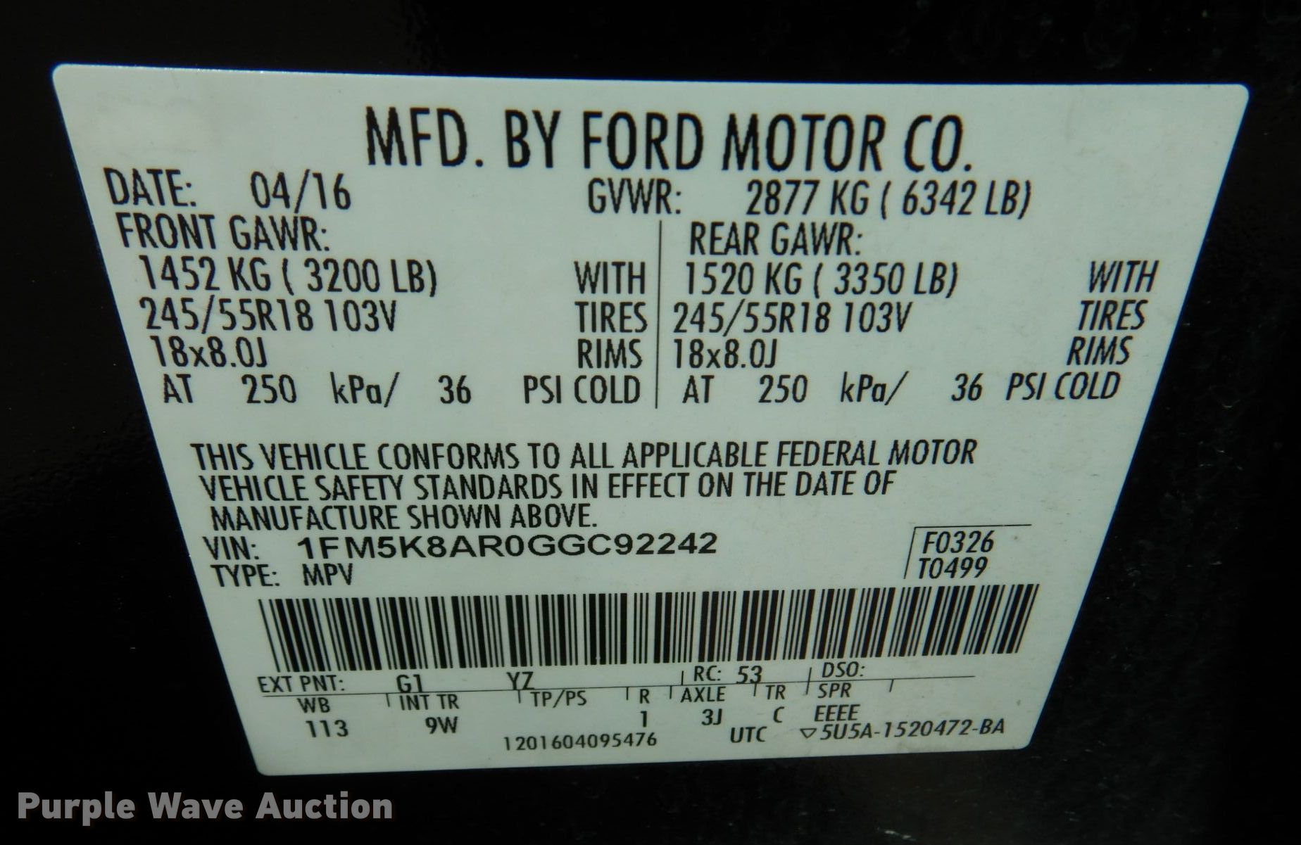- VIN: 1FM5K8AR0GGC92242