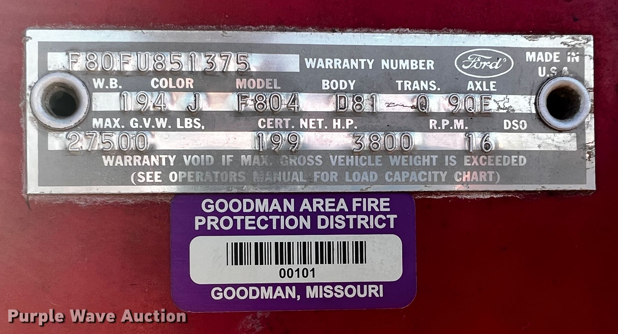 1966 Ford F800 pumper fire truck. Miles: 23,018 on odometer, VIN: F80FU851375. Engine Cylinders: 8, Fuel type: Gas. Transmission Manual, Speed: 5. Chassis Axles: Single, Suspension: Spring, Brakes: Hydraulic. Operational Fire truck body Pump 750 gpm, Ground ladder, Hose. Tires Size: 11R22.5. Oklahoma classic title. Mileage has not been verified. Exempt will be written in the odometer disclosure on the title. Outreach For America. 40082 CR 591 RD. Jay, OK 74346
