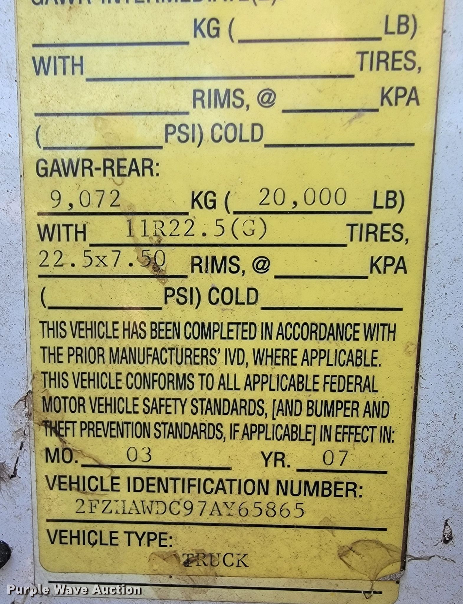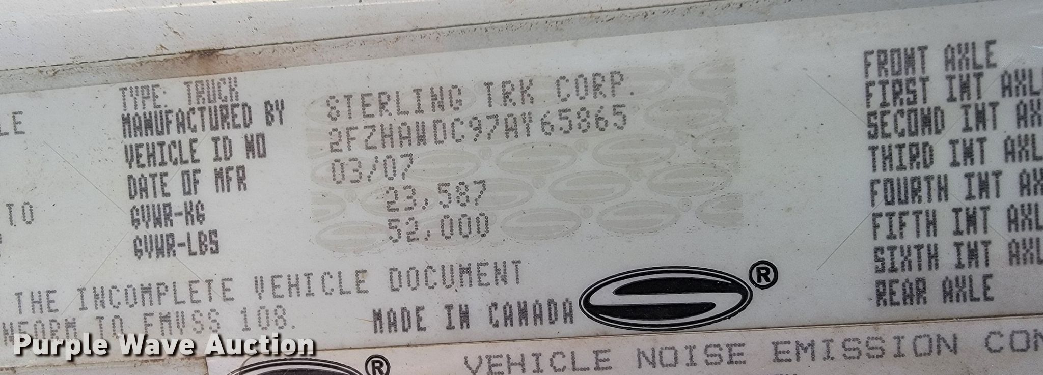 Purple Wave is selling a used Construction Dump Truck in Oklahoma. This item is a 2007 Sterling LT8500 dump truck with the following: Miles: Unknown, VIN: 2FZHAWDC97AY65865