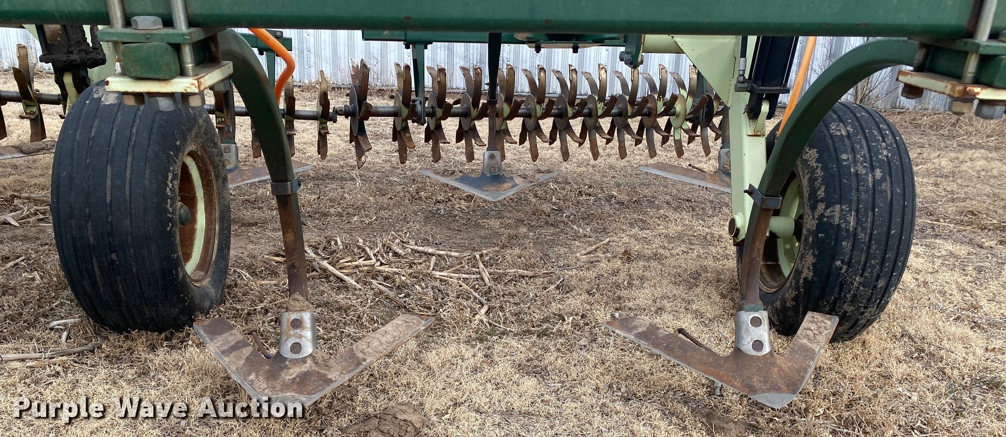 QuinStar FM-6 field cultivator. Overall width: 42', Serial: 9710-2398. Operational Shanks: 24, Sweep width: 2', Operation Hydraulic lift, Hydraulic fold, Attachments Rolling pickers/ treader, NH3 hookups, Rear hitch. Tires Tire size: 11L-15. Pursuant to Kansas law, Purple Wave will not be collecting sales taxes on any of the purchases made in this business liquidation auction. David Voran Farms Retirement. Cimarron, KS 67835