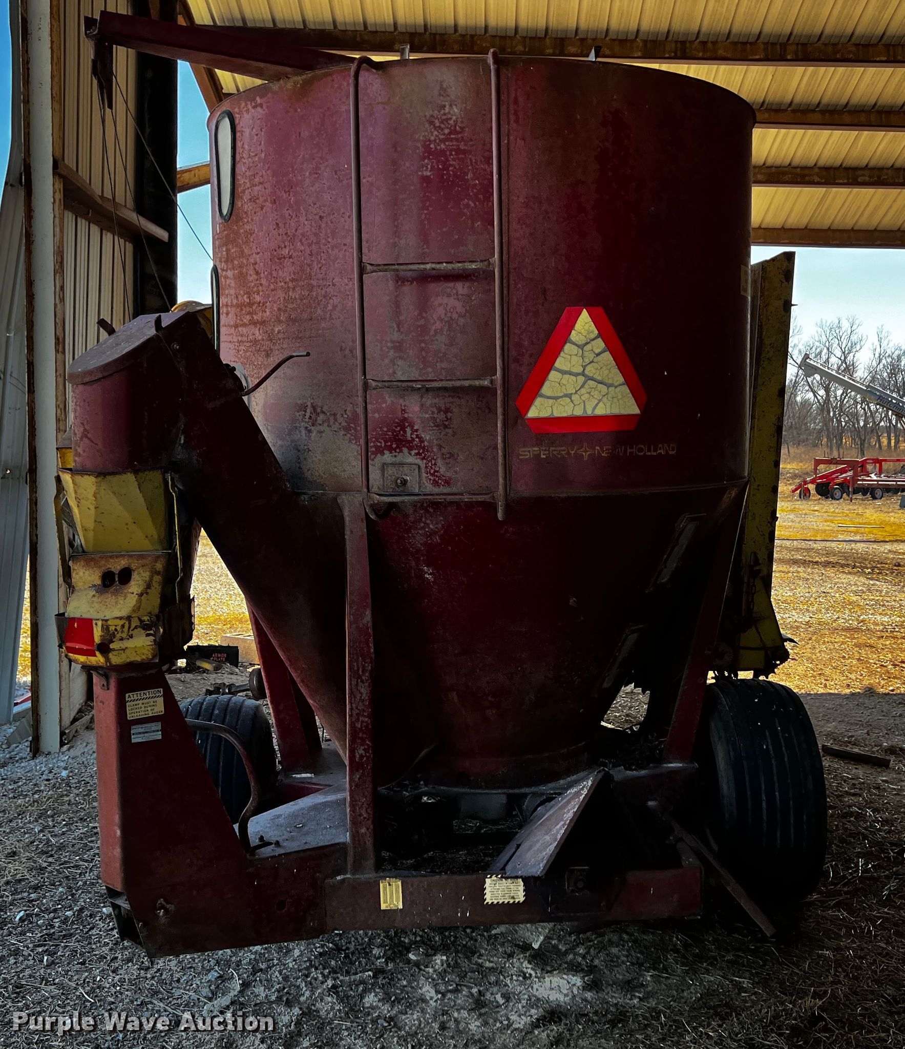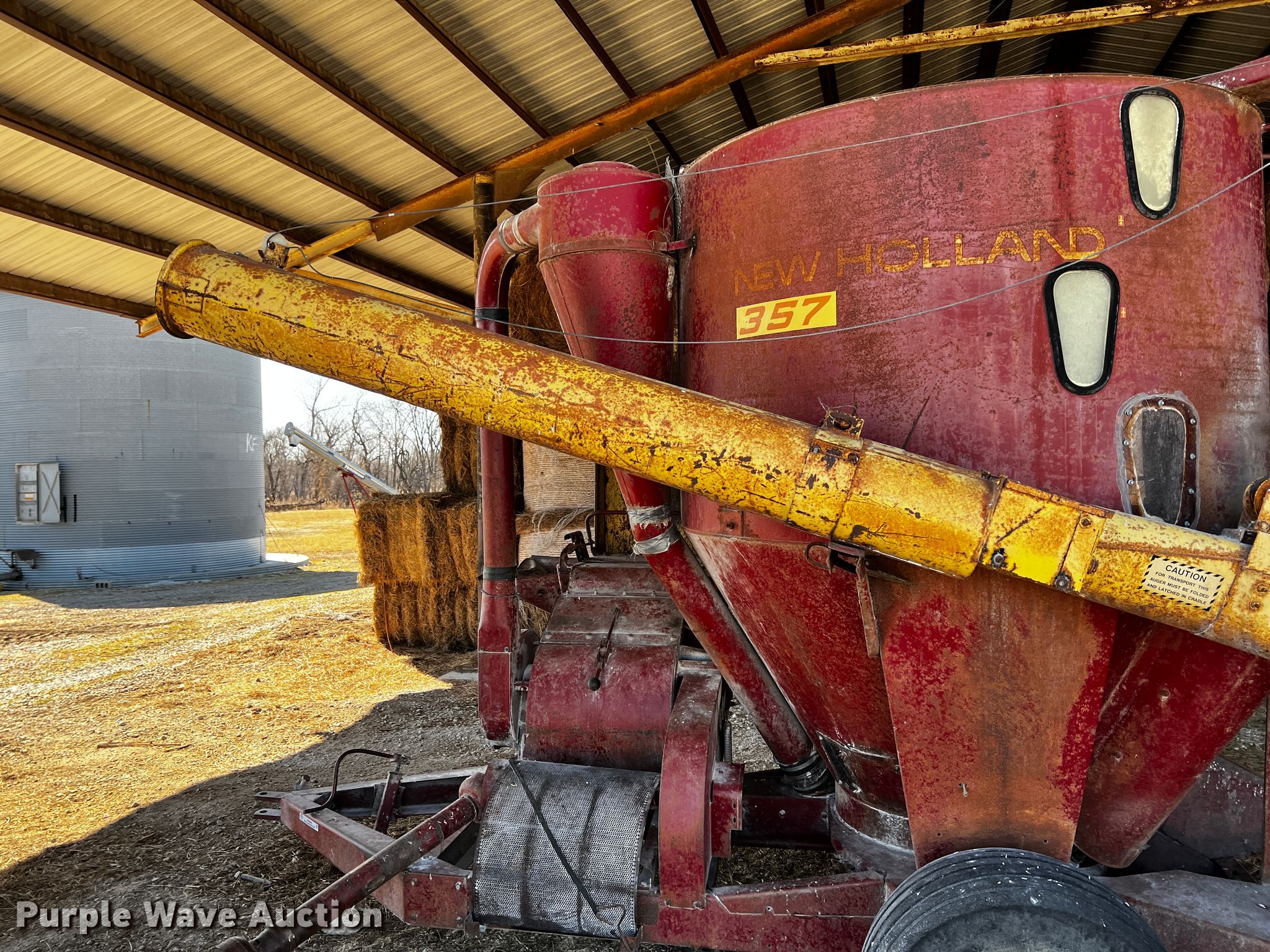 Purple Wave is selling a used Feed Mixer or Bale Processor in Kansas. This item is a New Holland 357 feed grinder/mixer with the following: PTO: 540, Auger, Quantity: 1, Diameter: 8", Discharge: Side, Width: 24", Chute: Manual, Door: Manual