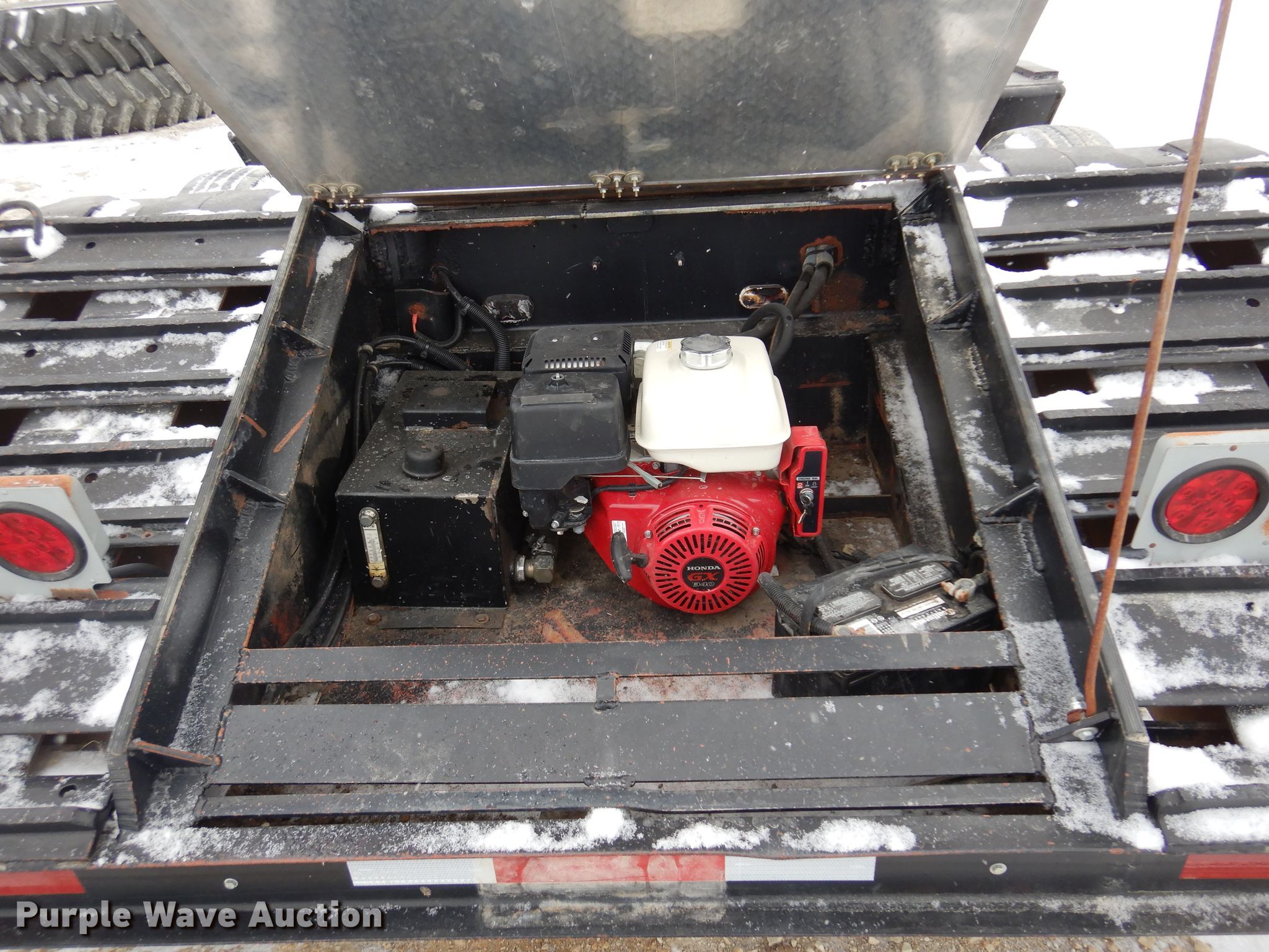 1985 Hyster lowboy equipment trailer. VIN: 1HKX1GJA6FC023003. Dimensions Overall: 48' 10" L x 93" W, Deck: 22' L x 93" W, Top deck length: 11', Rear deck length: 12', Tail length: 46". Operational Deck type: Wood, Outriggers: Swing-out Board size: 12", Neck type: Folding, Self-contained hydraulics, Honda GX340 gas engine. Chassis Suspension: Spring, Brakes: Air, Axles: Triple. Tires Steel wheels, Size: 10.00R15. Kansas title. Lincolnville, KS 66858