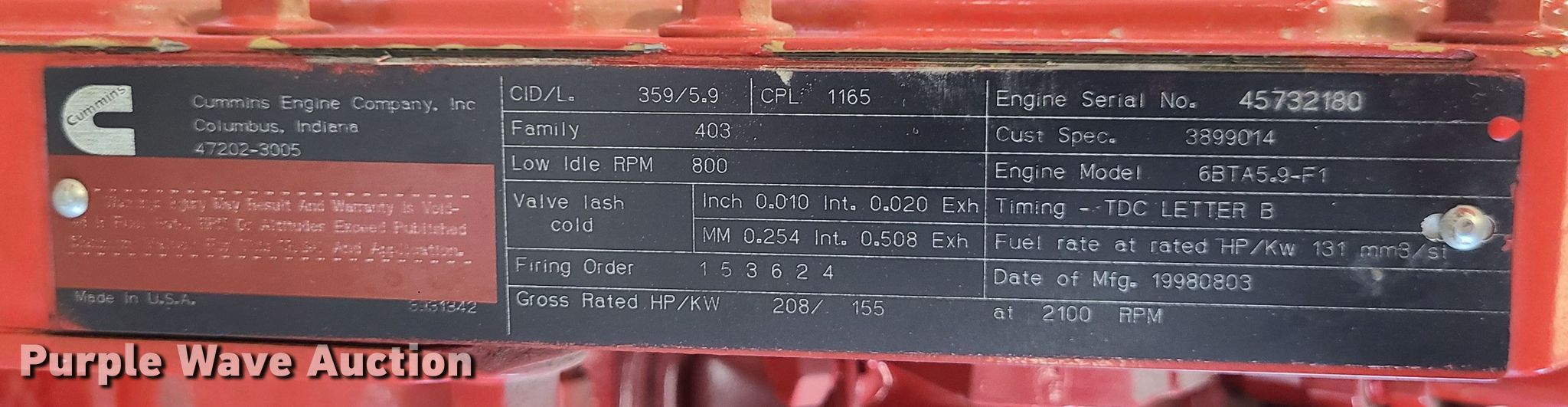 Purple Wave is selling a used Engine in Missouri. This item is a Cummins 6BTA5.9-F1 engine with the following: Hours: 2 on meter, Serial: 45732180, Displacement: 5.9L, Cylinders: 6, Fuel type: Diesel