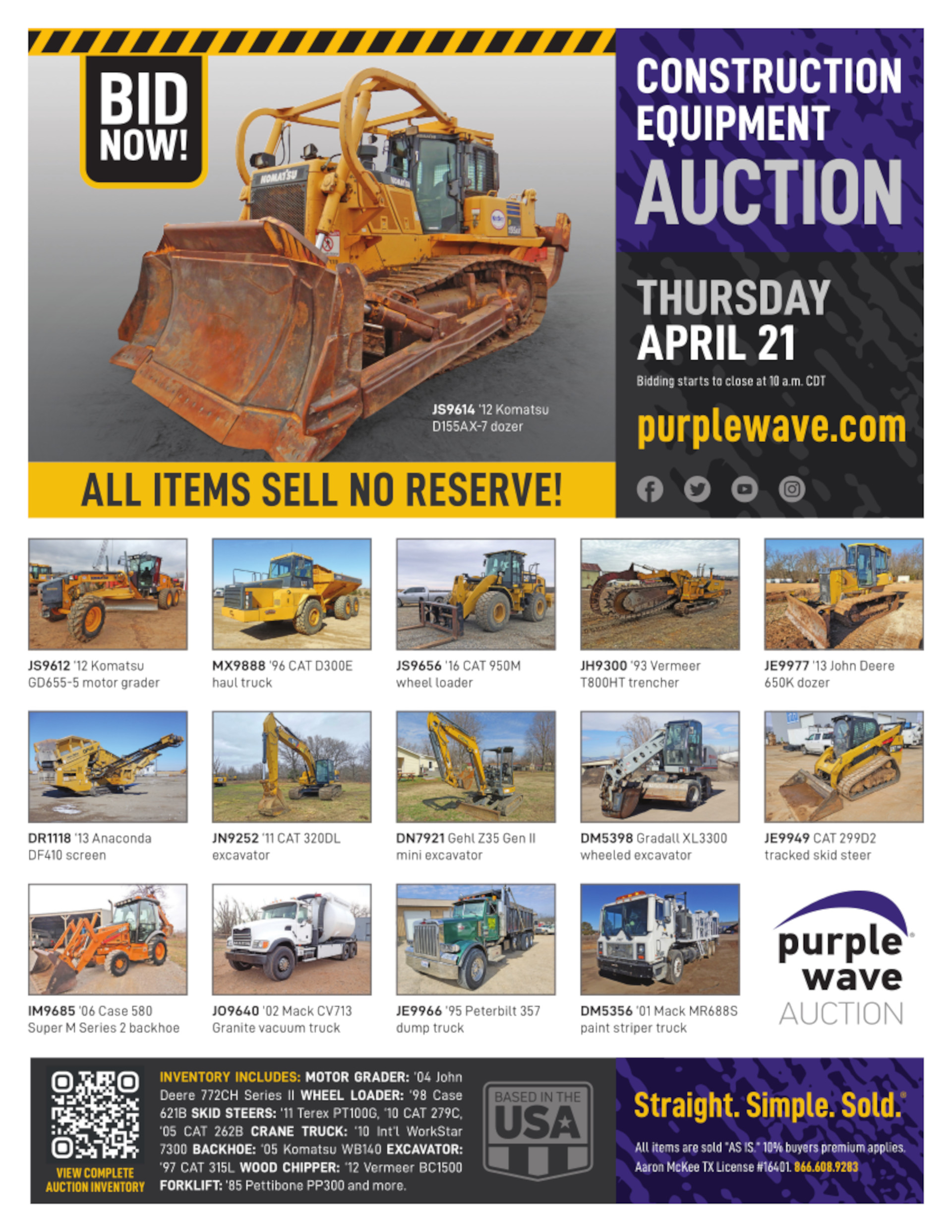 This auction is conducted by Purple Wave, Inc., whose home office is 825 Levee Drive, Manhattan, Kansas. Aaron McKee, Texas auctioneer license # 16401, operates Purple Wave, Inc. Complaints against us may be directed to the Texas Department of Licensing and Regulation, P.O. Box 12157, Austin, Texas 78711, (512) 463-6599. For additional required information, see the attached document.