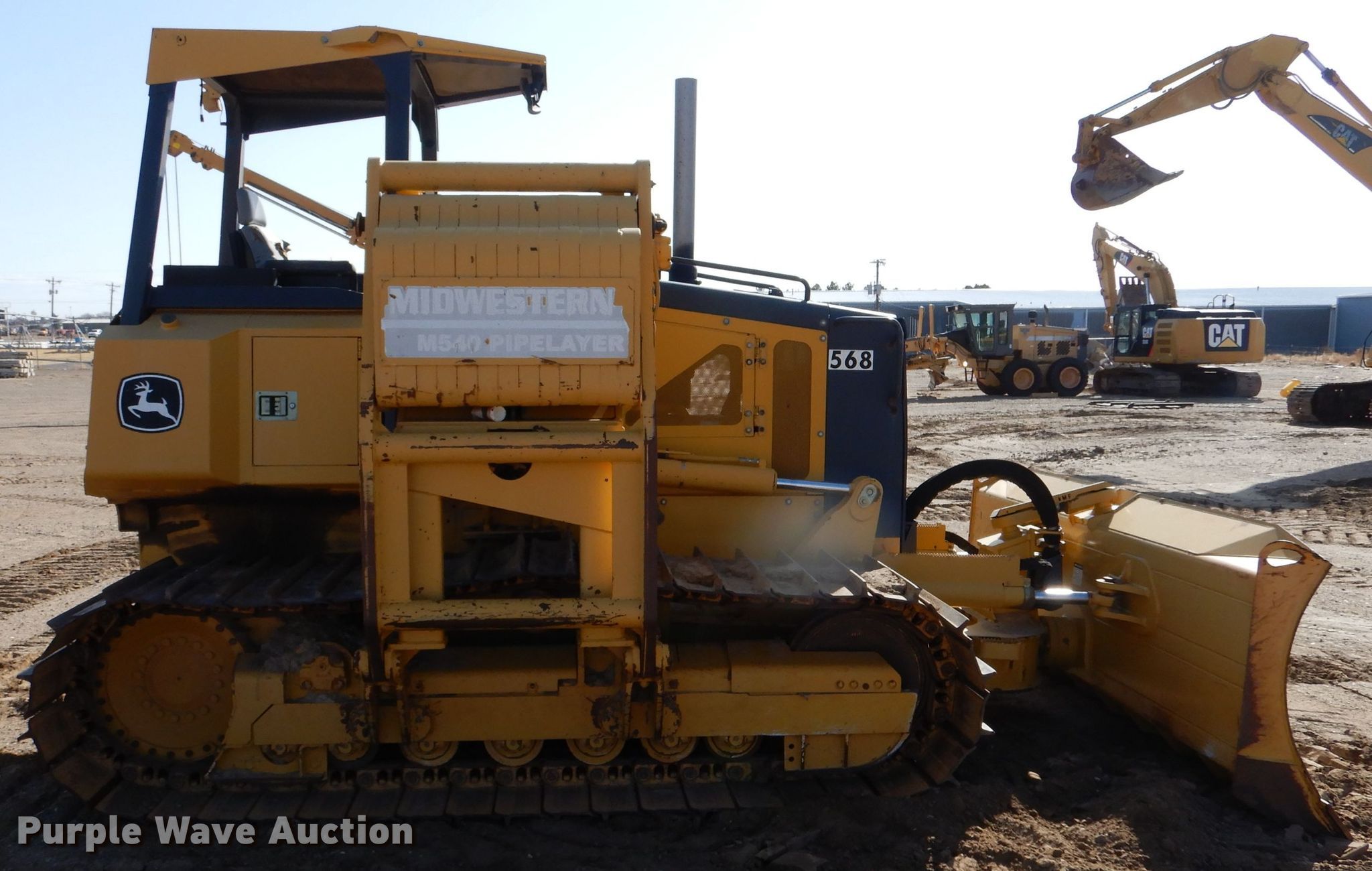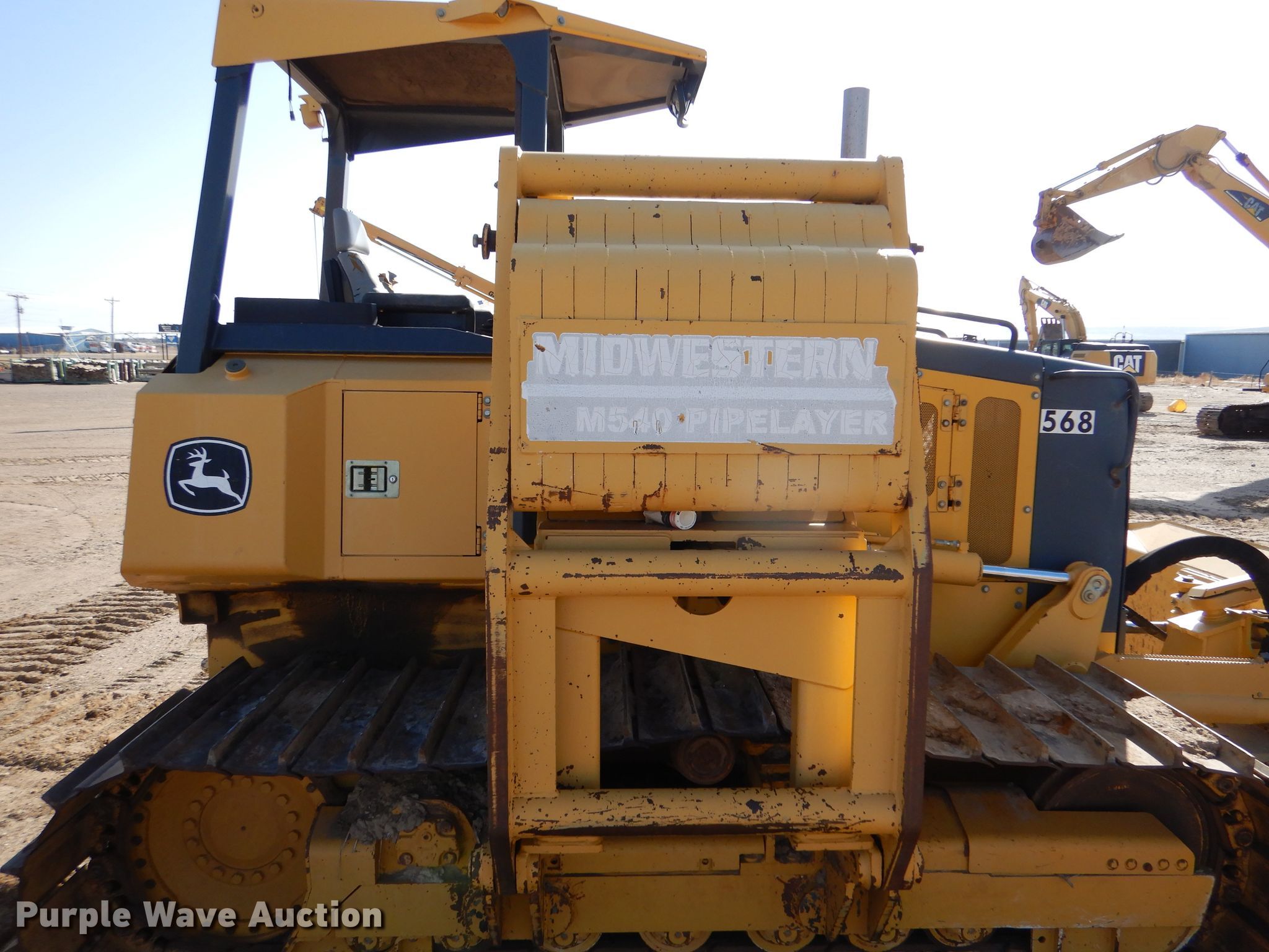 2006 John Deere 700J LGP pipelayer. Hours: Unknown, Serial: T0700JX131068. Engine Cylinders: 6, Fuel type: Diesel. Transmission Powershift, 4F - 4R. Operators station OROPS, Steering: Joystick. Features Rear drawbar, Dozer blade Type: 6-way, Straight, Width: 128" W, Attachments Pipelayer Midwestern M540, Boom: Standard, Boom length: 20'.. Tracks Width: 30", Grouser pads: Single, Bottom rollers: 7. Notes Non-operational hour meter. Western Kansas Irrigation Inc. - Open inspection April 20. 2781 W Oklahoma Ave. Ulysses, KS 67880