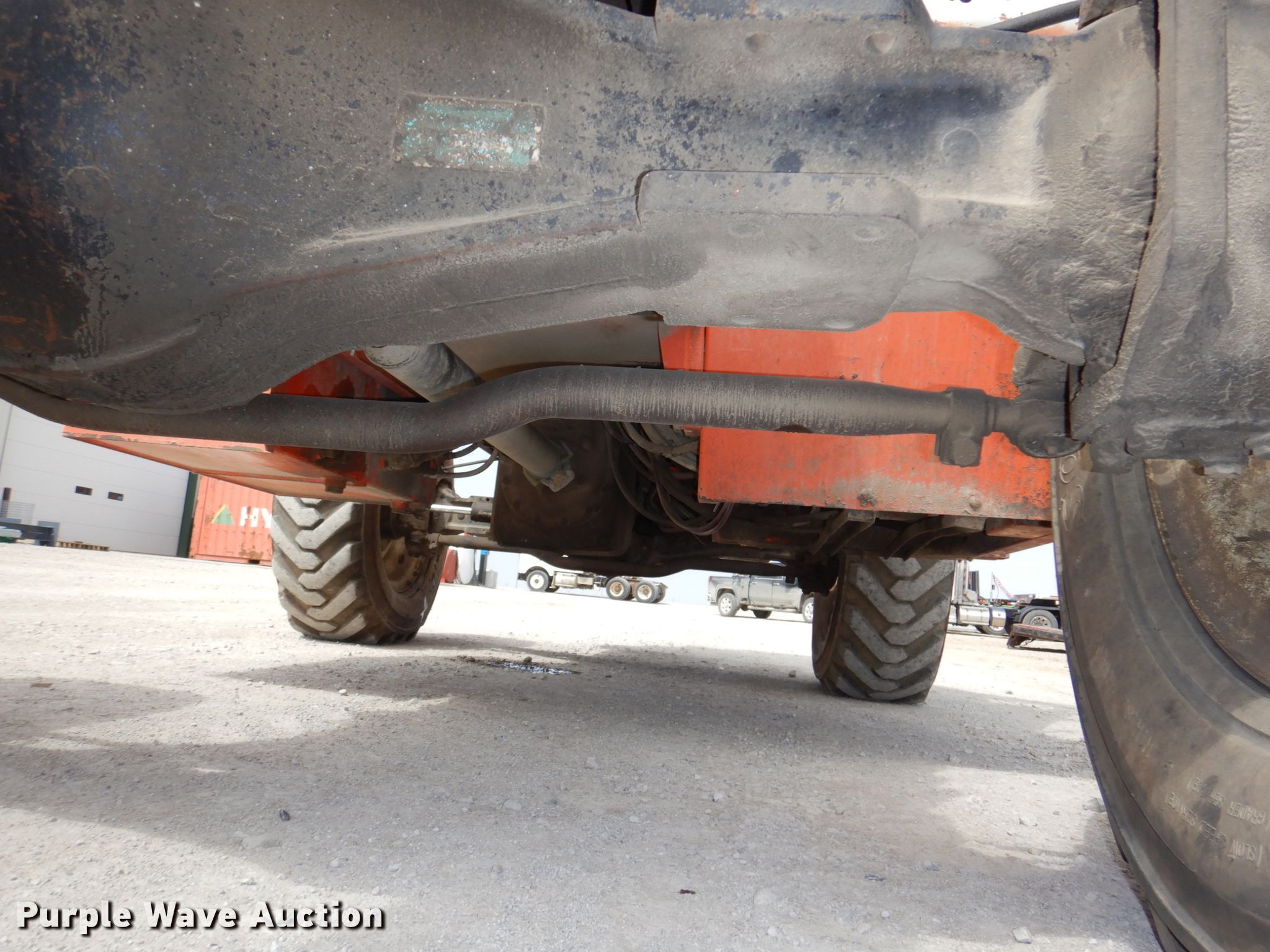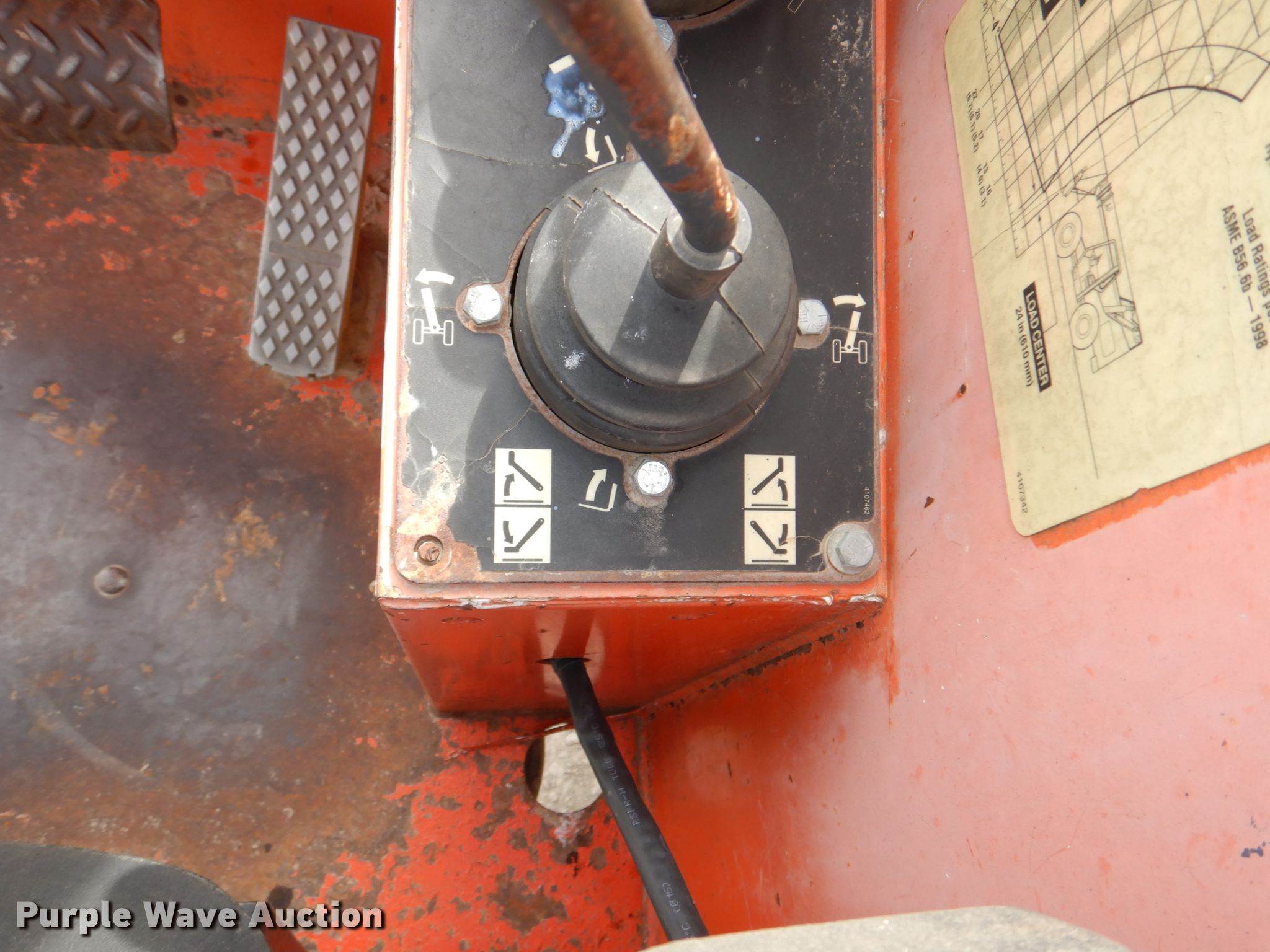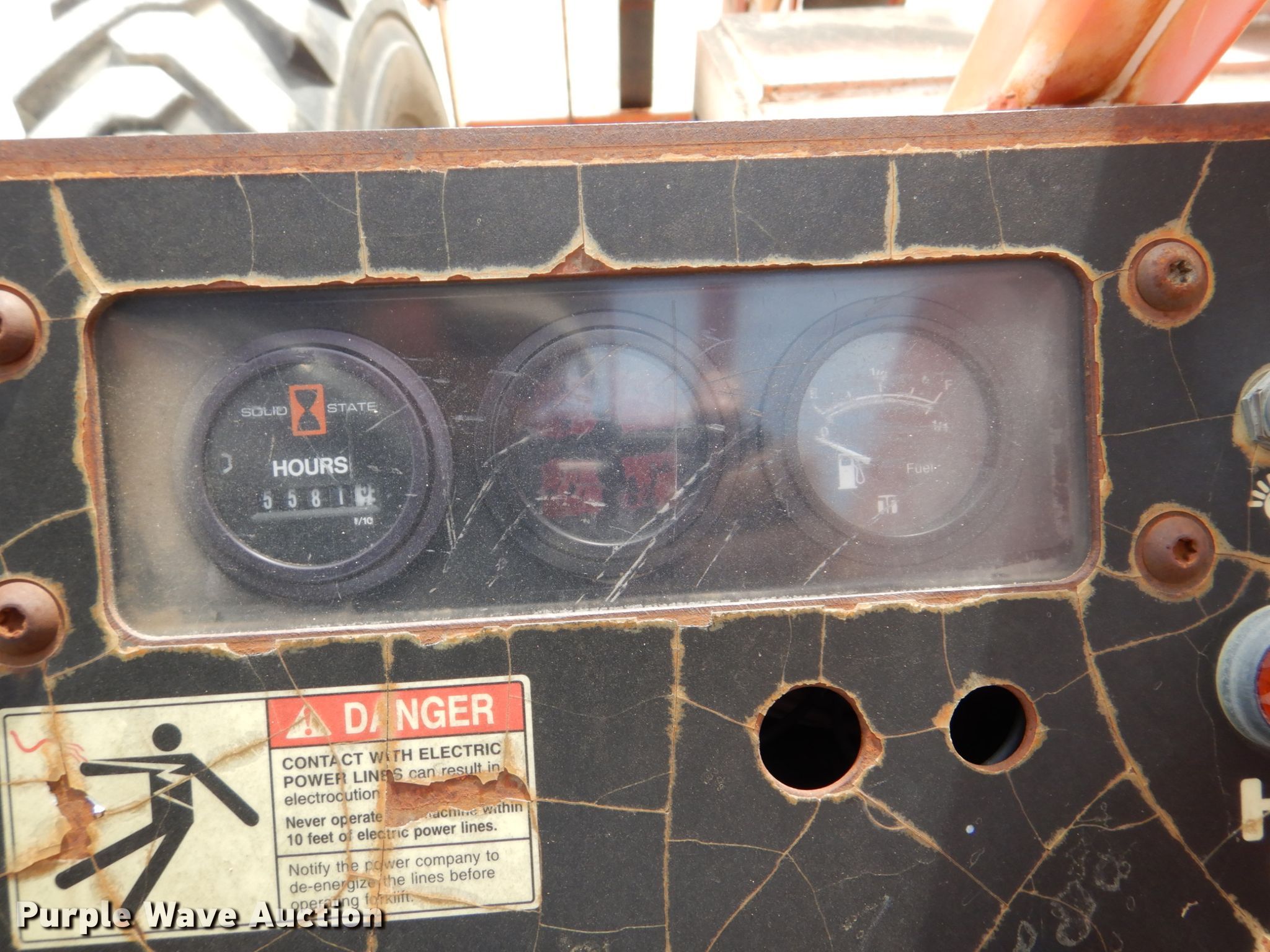 1996 SkyTrak 8042 telehandler. Hours: 5,581 on meter, Serial: P7138B1583. Engine Cylinders: 4, Fuel type: Diesel. Transmission Powershift, 3F - 3R, Four wheel drive. Operators station OROPS, Steering: Crab, Four wheel. Features Maximum lift capacity: 8,000 lbs, Maximum lift height: 42', Boom stages: 3, Fork length: 47", Hydraulic leveling. Tires Size: 13.00-24, Foam filled. Notes Hydraulic leak. Jade Millwrights, Inc.. 2583 Prairie Rd. Hiawatha, KS 66434