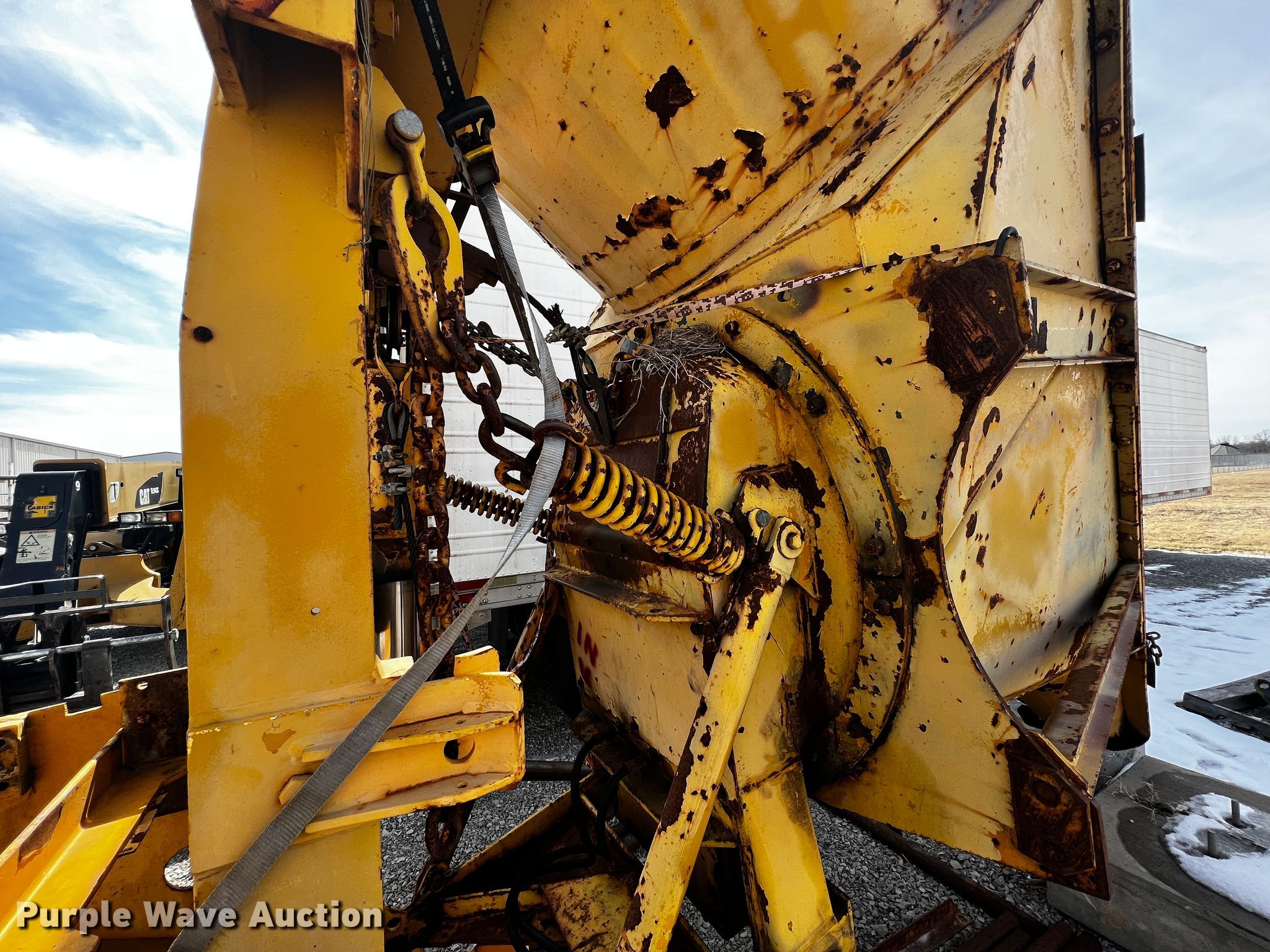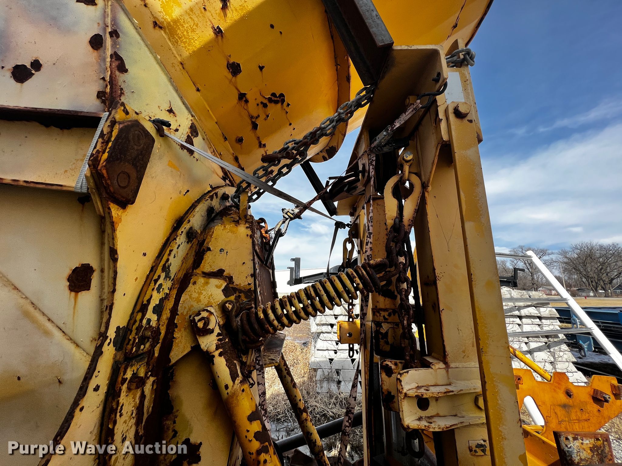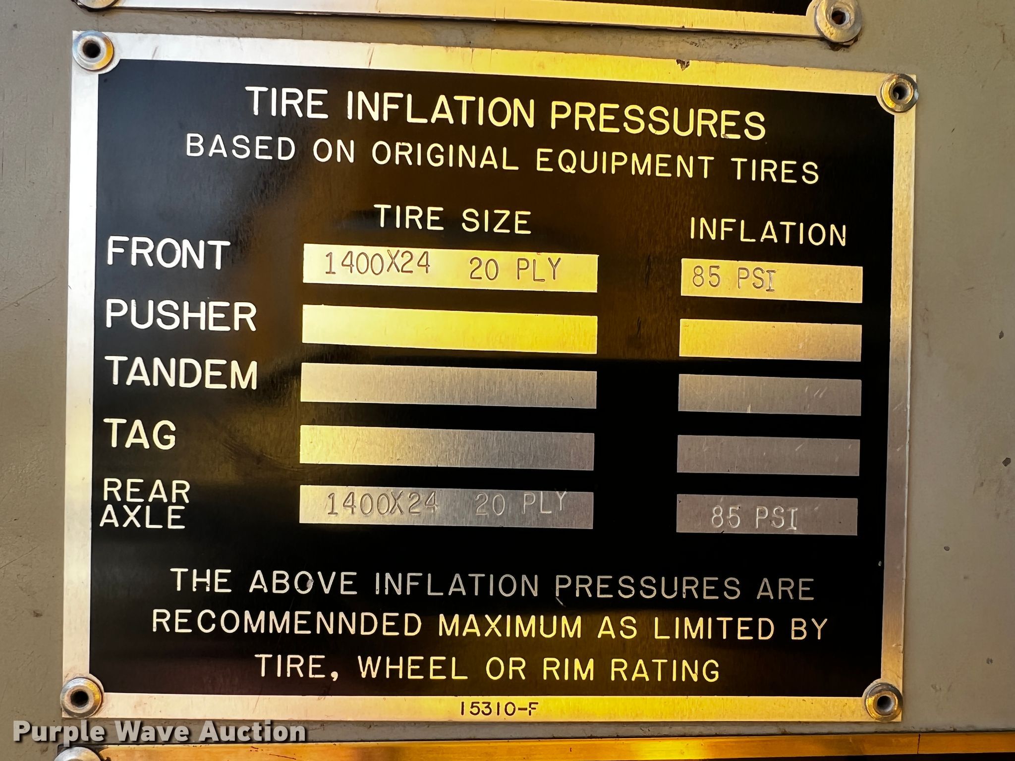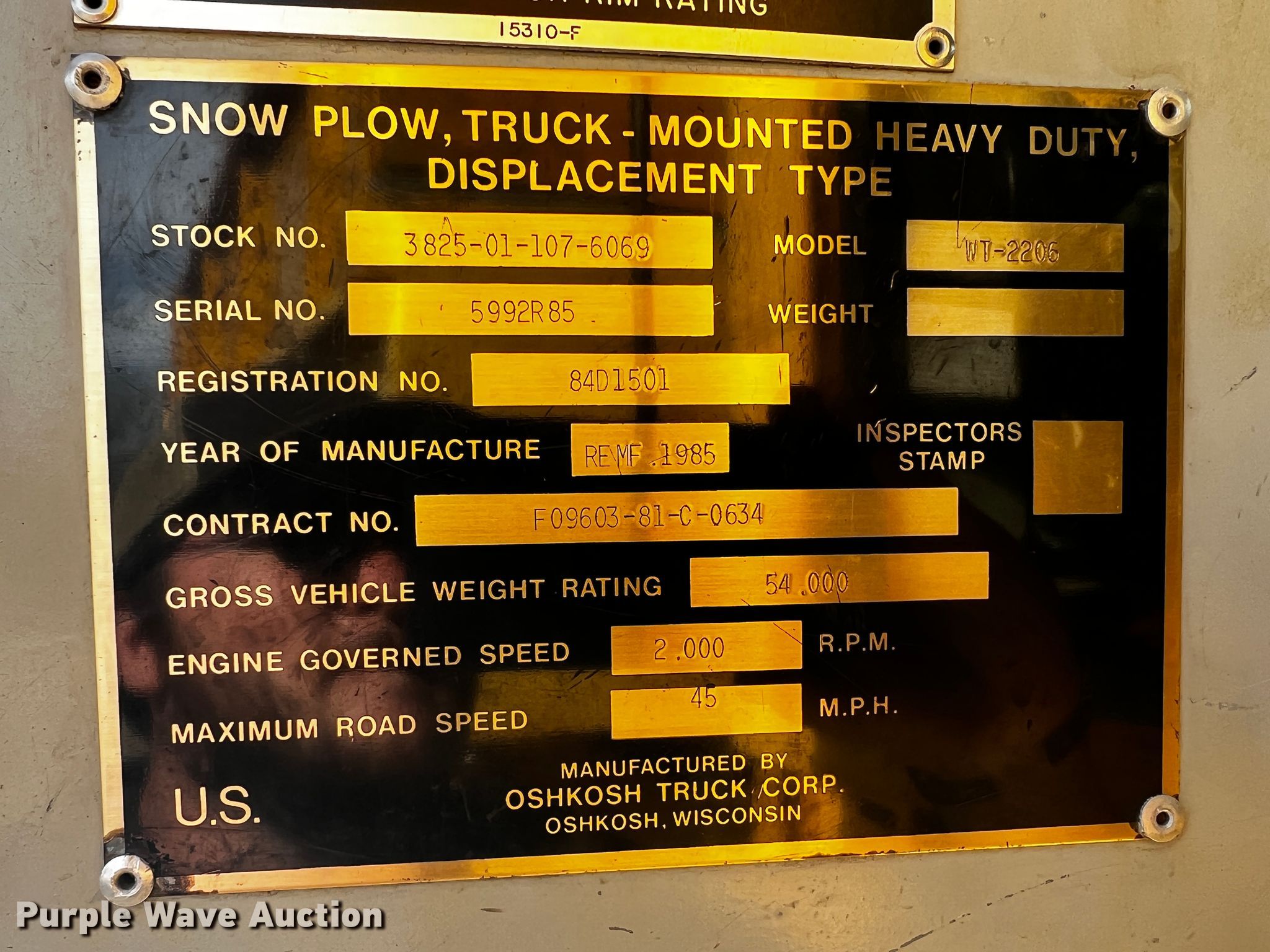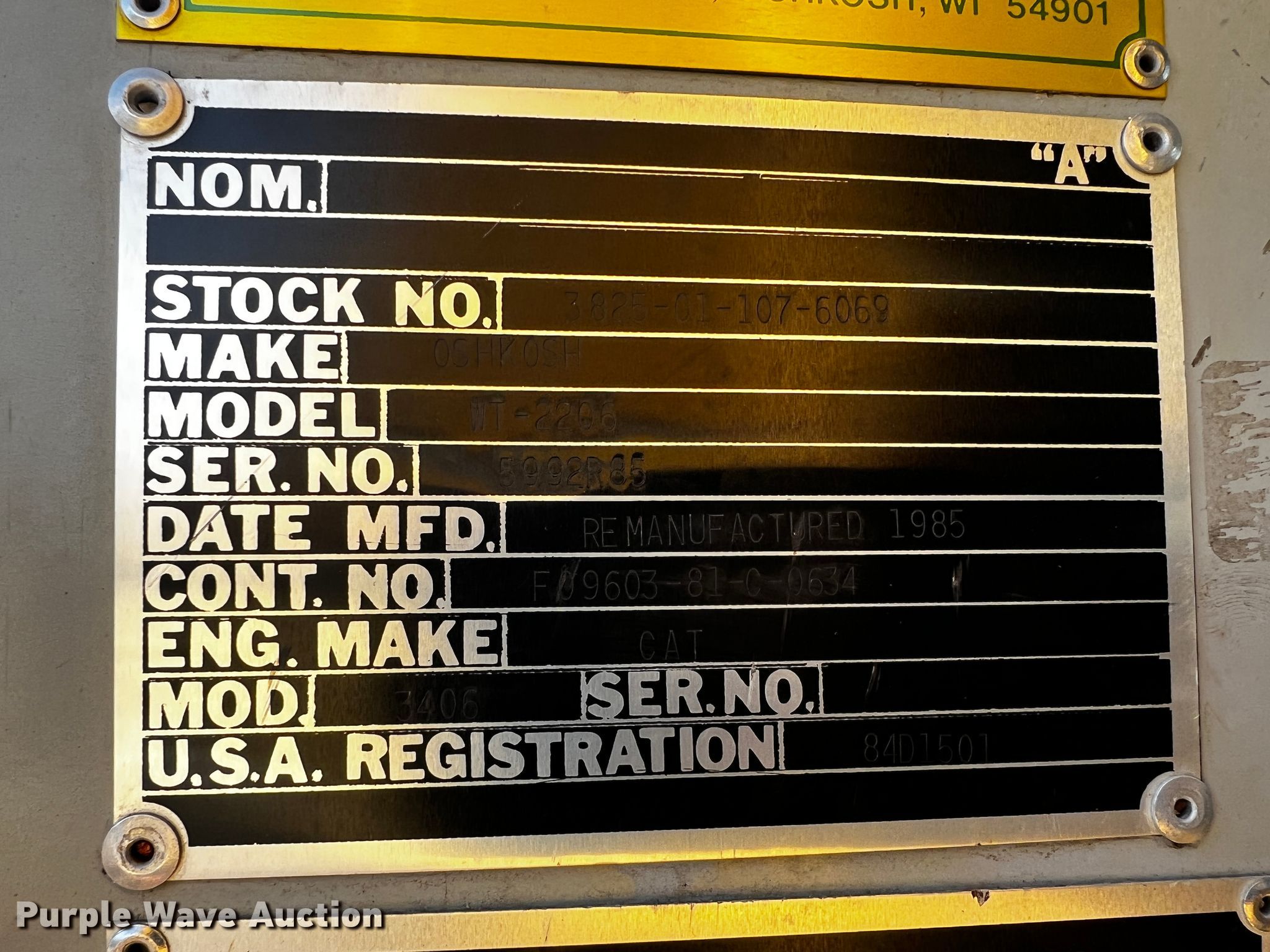 1985 Oshkosh WT-2206 dump truck. Miles: 7,502 on odometer, Hours: 990 on meter, VIN: 5992R85. Engine Caterpillar 3406, Cylinders: 6, Fuel type: Diesel. Transmission Allison, Automatic. Chassis Axles: Single, Suspension: Spring, Brakes: Hydraulic, GVWR: 54,000 lbs. Features Dump bed 10' 6" L x 7' 6" W, Side height: 52", Bed type: Steel, Ram: Dual, End gate: Manual, Plow Width: 194", Wing plow Width: 132". Tires Size: 14.00-24. Transfer of ownership documentation will be a bill of sale. Frieden Holdings, LLC. 545 SW 30th Rd. Lamar, MO 64759