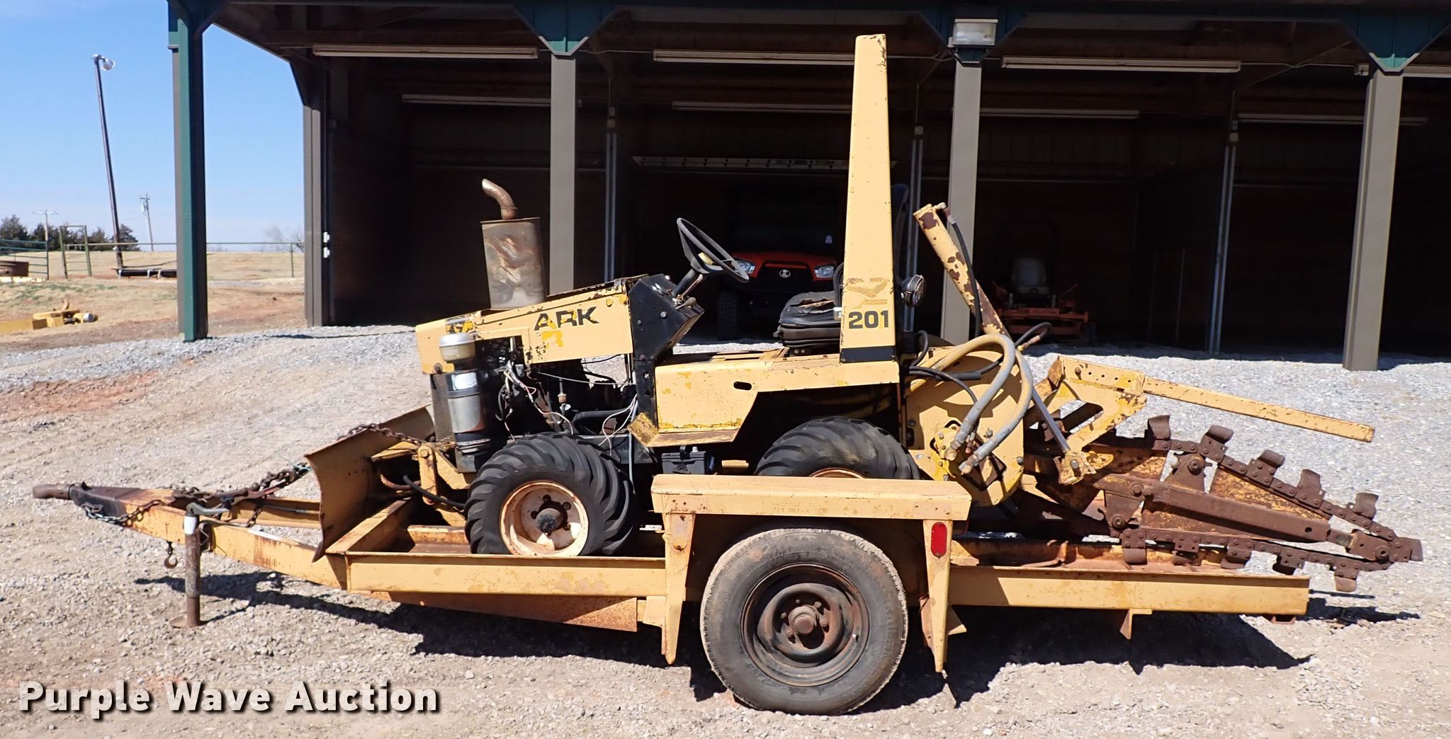 Midmark Power 201 trencher. Hours: 755 on meter. Engine Cylinders: 2, Fuel type: Gas. Transmission Hydrostatic. Operators station Canopy. Operational Trencher Estimated dig depth: 60", Cutting width: 4", Teeth: Dirt, Backfill blade Width: 60". Shop built trailer Overall: 16' L, Deck : 11' 3" L x 72" W, Tires: 205/75R15. Notes Unknown operating condition. Transfer of ownership documentation will be a bill of sale. 17100 S Air Depot Blvd. Norman, OK 73026
