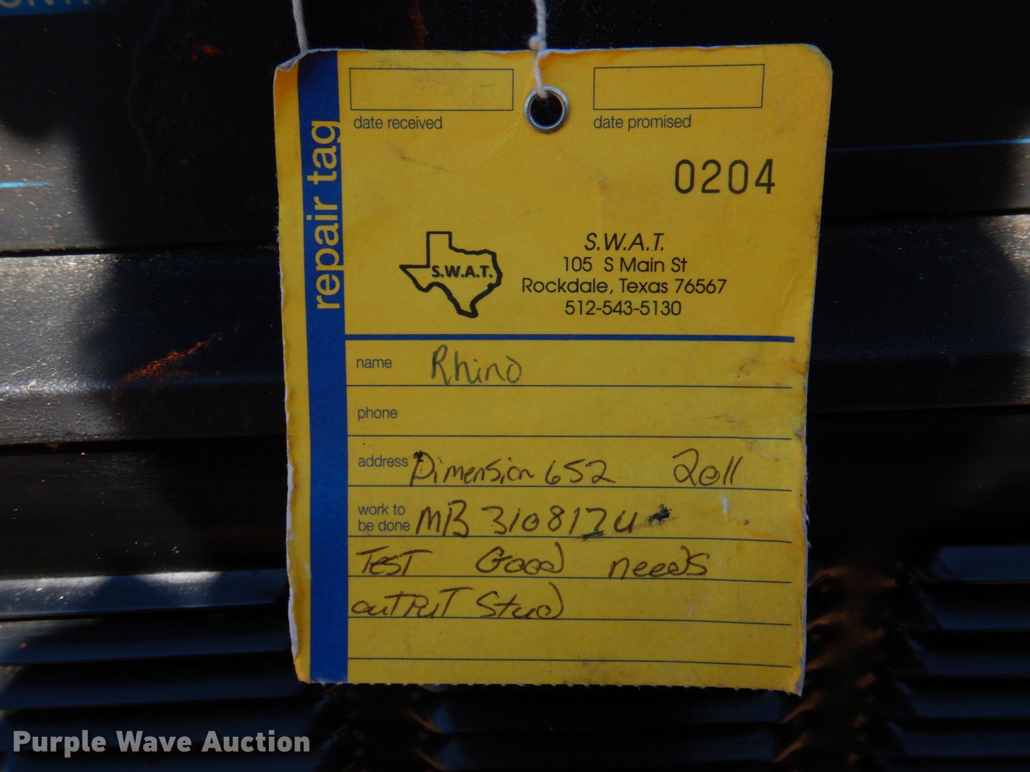 (3) Miller Dimension 652 welders. Serial: MB130226U, LH460078C, MB310817U. Electric Motor kW: 34.8, Volts: 230/460/575, Phase: Three. Operational Capabilities: CC, CV, DC. Rhino Machinery. 5830 State Hwy 71. La Grange, TX 78945