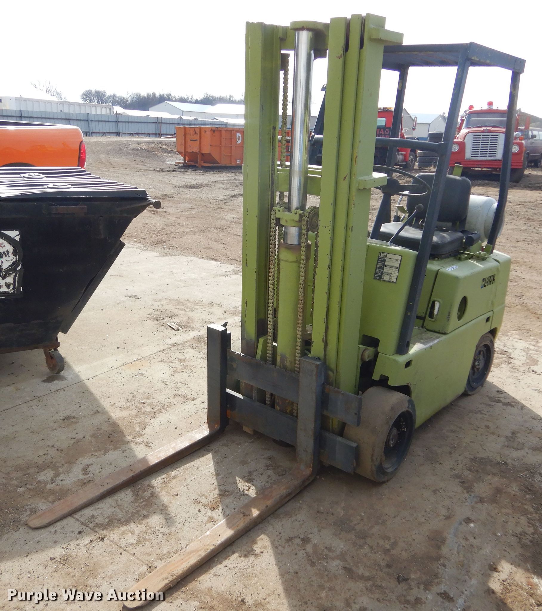 Clark C500-45 forklift. Serial: 355-675-3557. Engine Cylinders: 4, Fuel type: LPG LP bottle: Not included. Transmission Powershift. Operators station Canopy. Features Maximum lift capacity: 4,000 lbs, Maximum lift height: 188", Mast stages: 3, Fork length: 42". Tires Front: 18x8x12 1/8, Rear: 18x5x12 1/8. Dakota Recycling. 301 Industrial Dr. Volga, SD 57071