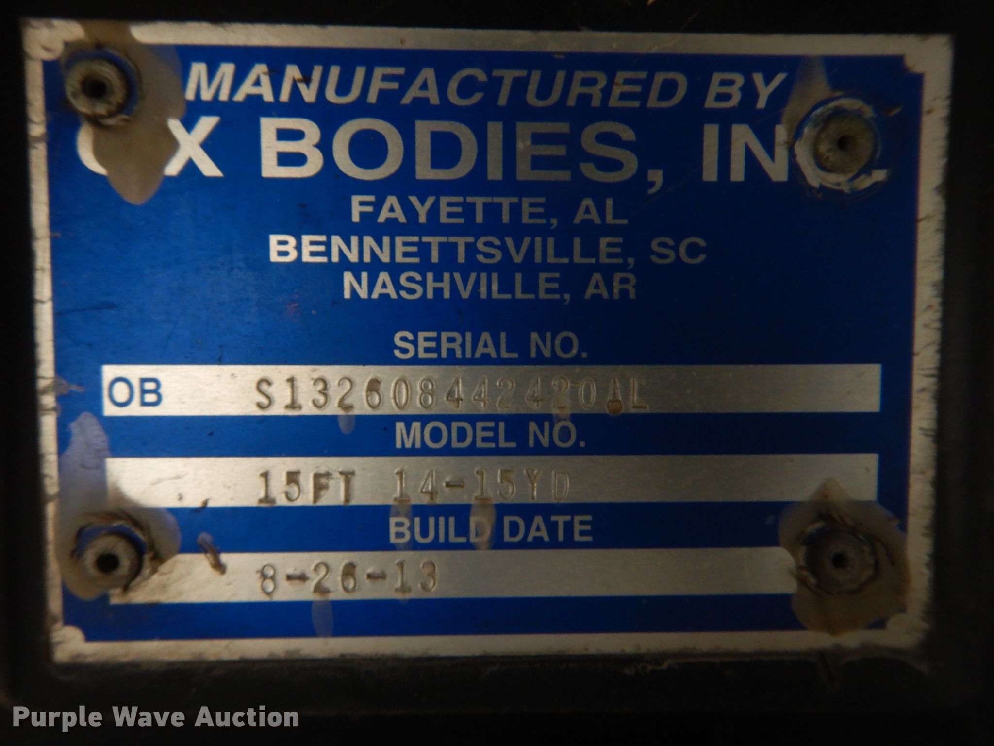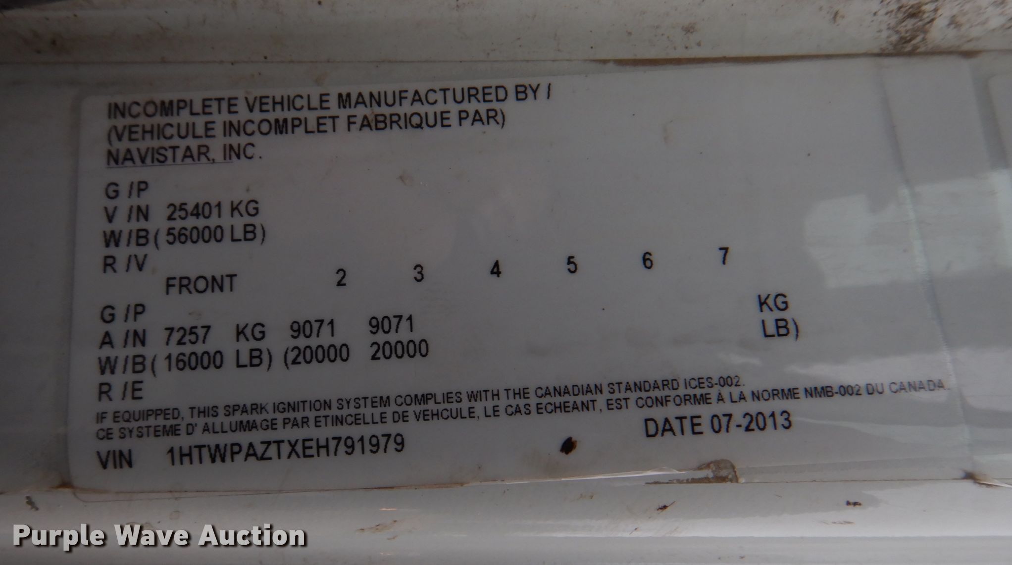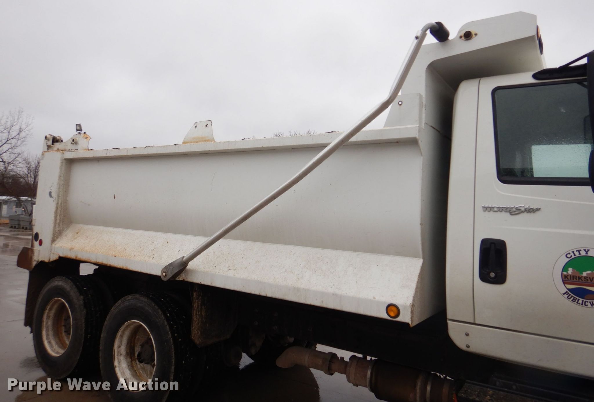 2014 International WorkStar 7500 dump truck. Miles: 65,443 on odometer, VIN: 1HTWPAZTXEH791979. Engine International MaxxForce, Displacement: 9.3L, Cylinders: 6, Fuel type: Diesel. Transmission Automatic. Chassis Axles: Tandem, Suspension: Spring over walking beam, Brakes: Air, PTO, GVWR: 56,000 lbs, Wheelbase: 203". Interior AC, Heat, Cruise control, Brake controller. Features Dump bed Ox Bodies 15FT 14-15YD, Capacity: 15 cu.yd., 15' L x 8' W, Side height: 46", Bed type: Steel, Roll tarp, Ram: Single , End gate: Air operated. Tires Front: 315/80R22.5, Rear: 11R22.5. Notes Remanufactured engine installed at 35,378 miles, Dash warning indicator: Check engine. View repairs. Missouri title. Seller is a government entity who will be assigning and distributing the title. Please contact the seller for distribution questions. Title distribution may be delayed up to 14 days from verification of funds. City of Kirksville. 2001 N Osteopathy. Kirksville, MO 63501