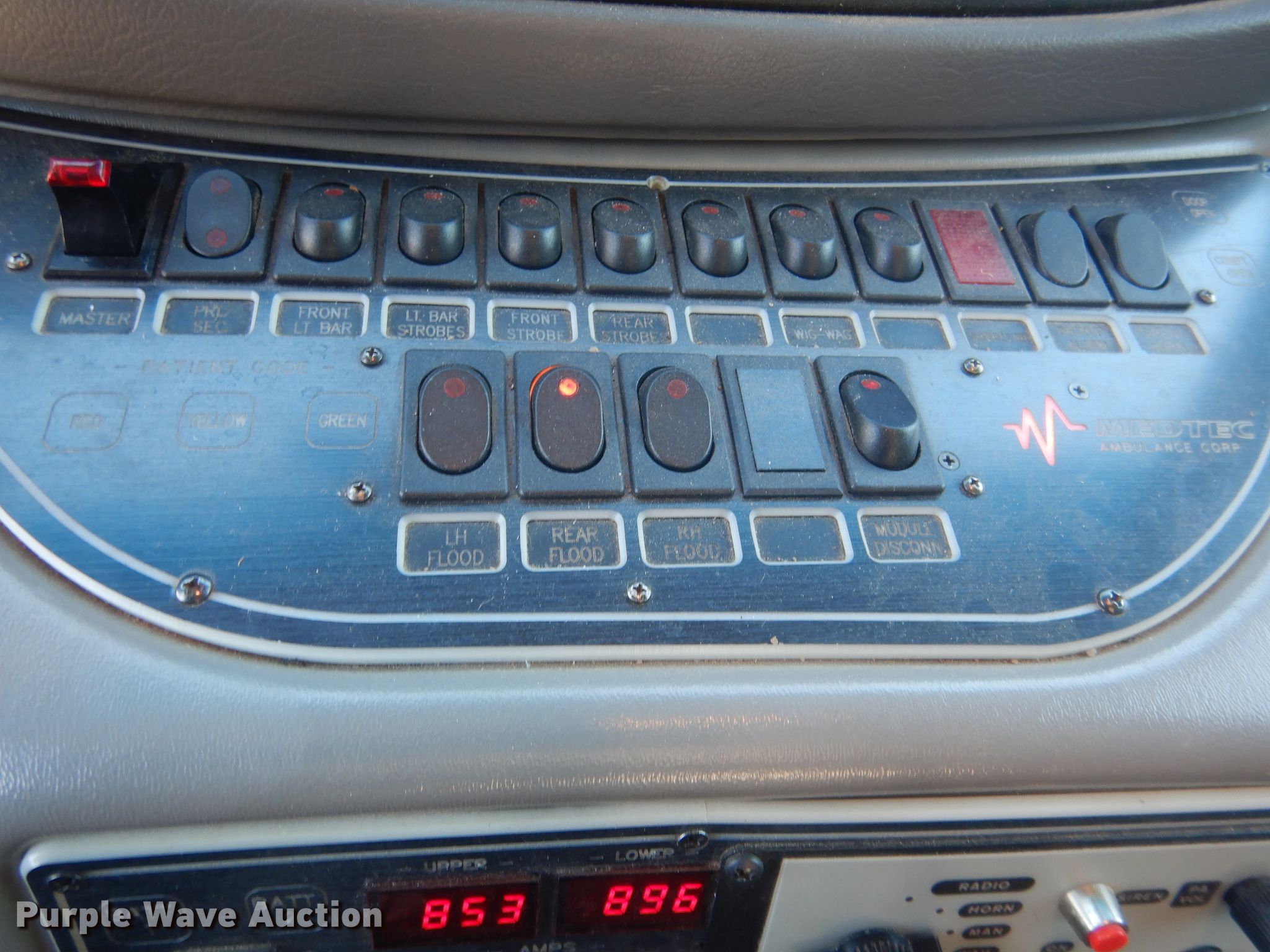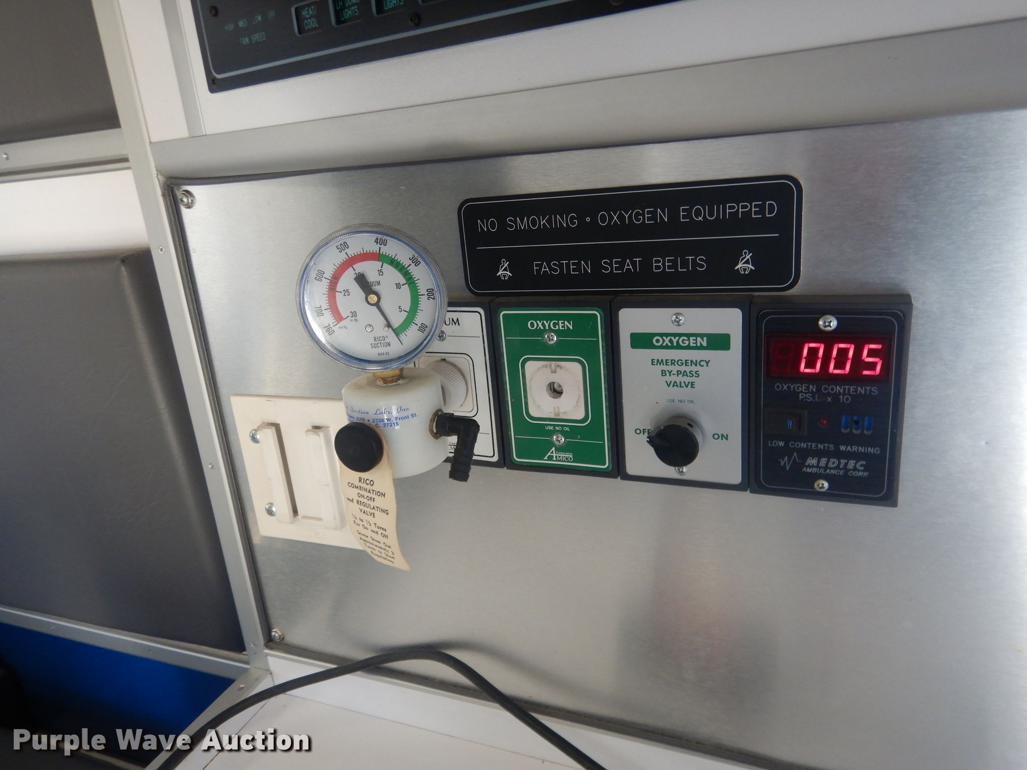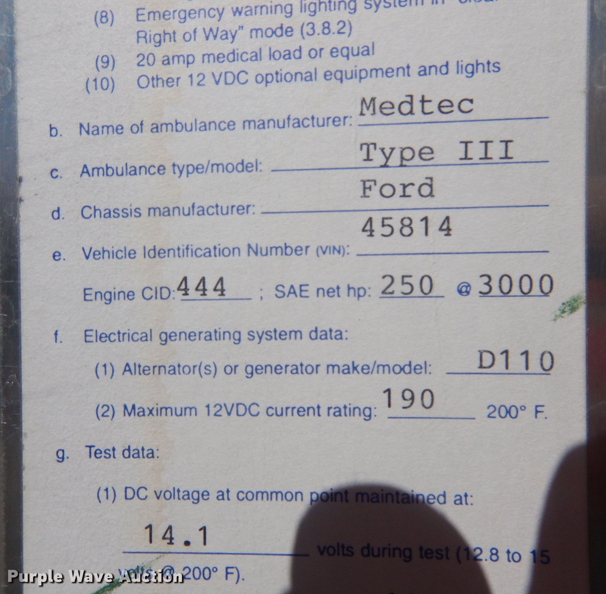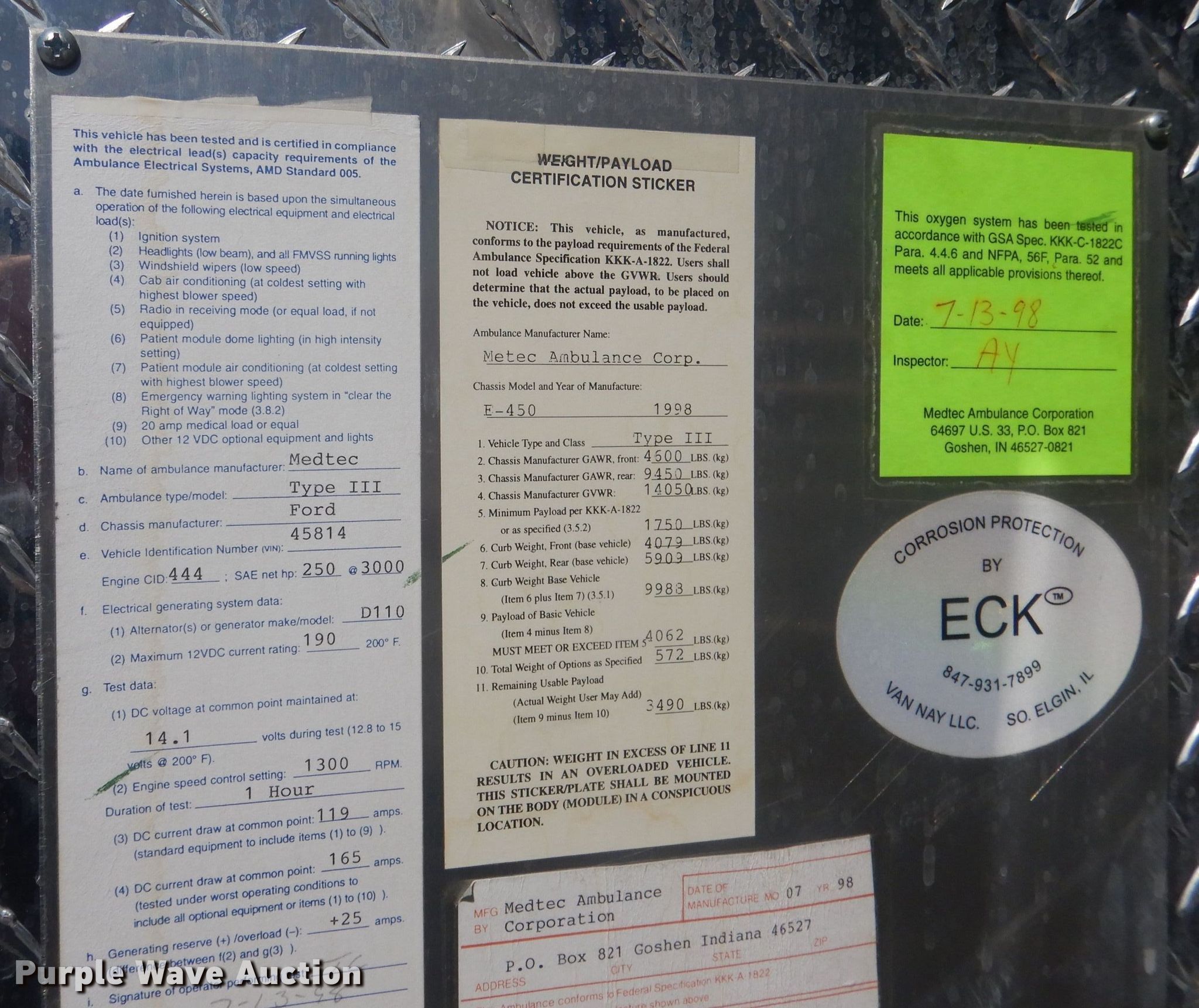 1998 Ford Econoline E450 Super Duty ambulance. Miles: 85,109 on odometer, Hours: 3,602 on meter, VIN: 1FDXE40F7WHB45814. Engine Displacement: 7.3L, Cylinders: 8, Fuel type: Diesel. Transmission Automatic. Chassis Axles: Single, Suspension: Spring, Brakes: Hydraulic, GVWR: 4,600 lbs, Wheelbase: 154". Interior AC, Heat, Heated mirrors, Power windows, Power locks, Cruise control, Auxiliary controls. Operational Ambulance body Medtec Type III, PA/ siren controls, Oxygen hookups, Power Flex cot. Tires Size: 225/75R16, Brand: Michelin. Nebraska title. Culbertson Rescue. 311 Tate Ave. Culbertson, NE 69024