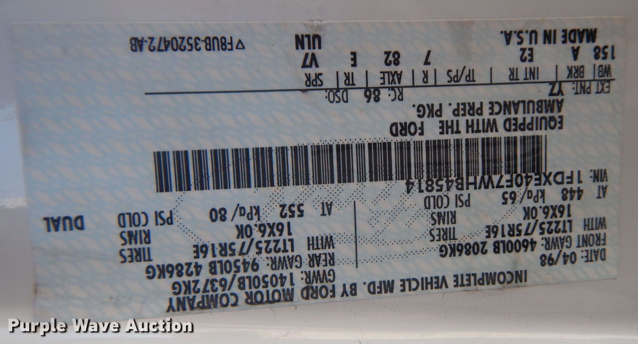 Purple Wave is selling a used Fire Truck or Emergency Vehicle in Nebraska. This item is a 1998 Ford Econoline E450 Super Duty ambulance with the following: Miles: 85,109 on odometer, Hours: 3,602 on meter, VIN: 1FDXE40F7WHB45814