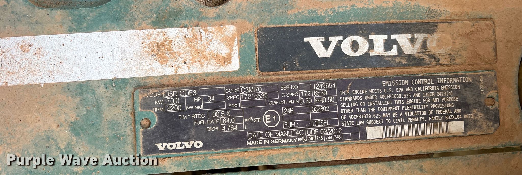 2012 Volvo BL70B backhoe. Hours: 2,254 on meter, Serial: VCE0B70BJ02326263. Engine Volvo D5D CDE3, Serial: 11249654, Displacement: 4.764L, Cylinders: 4, Fuel type: Diesel, HP: 94. Transmission Powershift, 4F - 4R. Chassis Four wheel drive. Operators station Enclosed cab, AC, Heat, Backhoe controls: Pilot control. Features Loader Bucket Four-in-one, Width: 92", Cutting edge: Bolt-on, Backhoe Extendable stick, Bucket Width: 24", Teeth: 5.. Tires Front: 340/80-18, Rear: 500/70-24. Notes Non-operational AC. City of Borger. 801 N Florida St. Borger, TX 79007