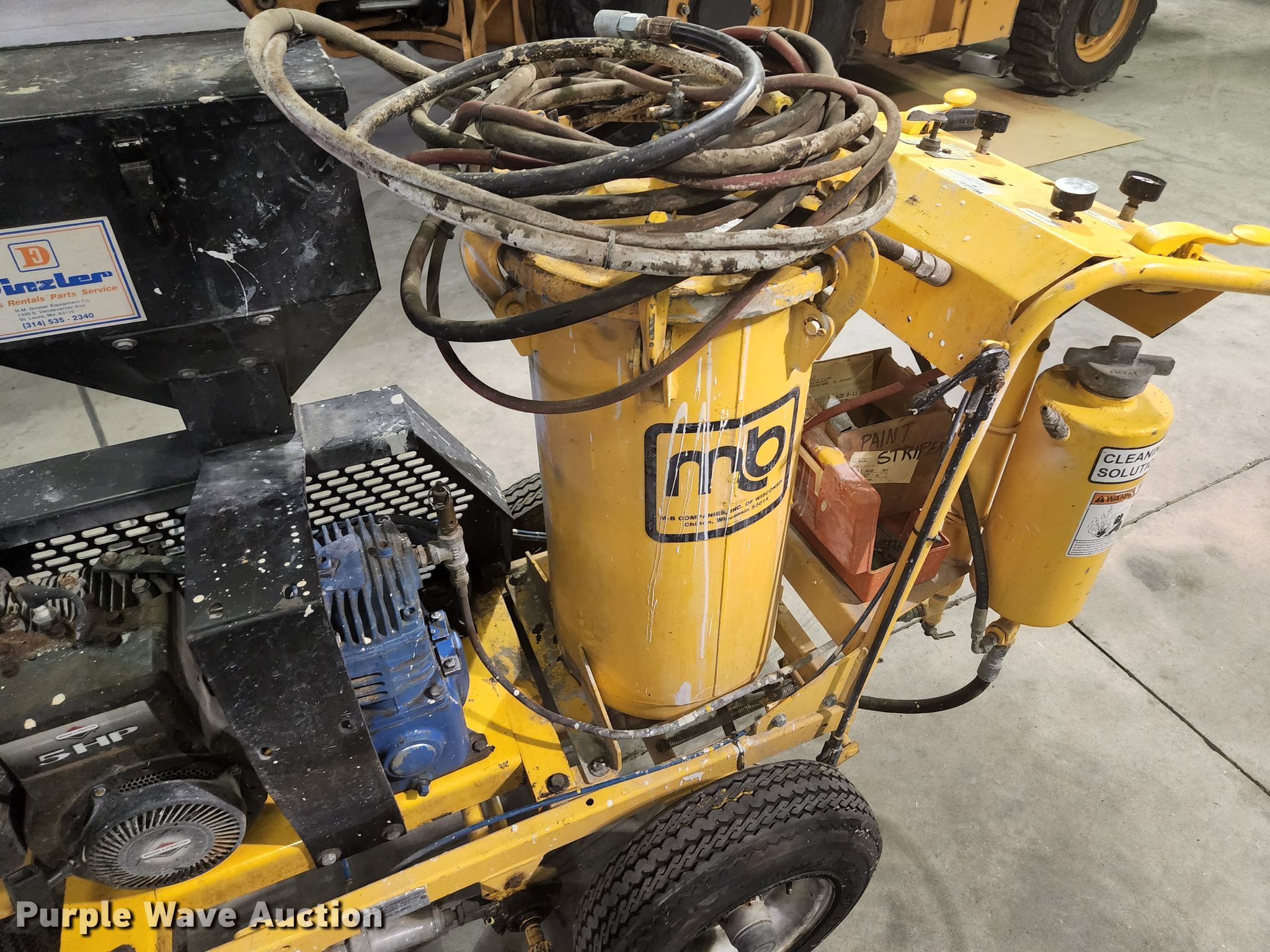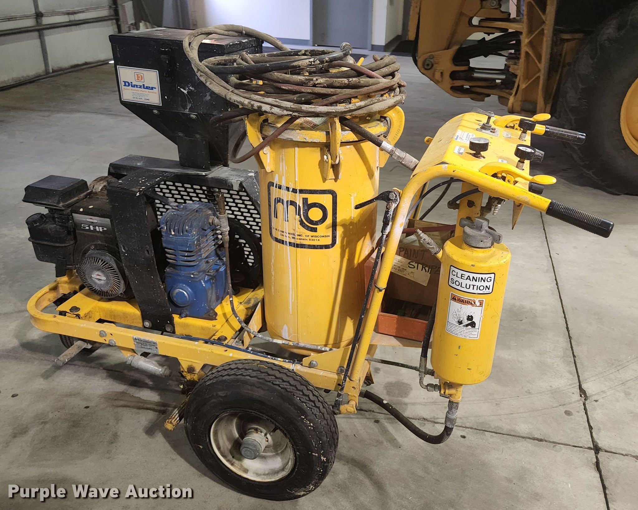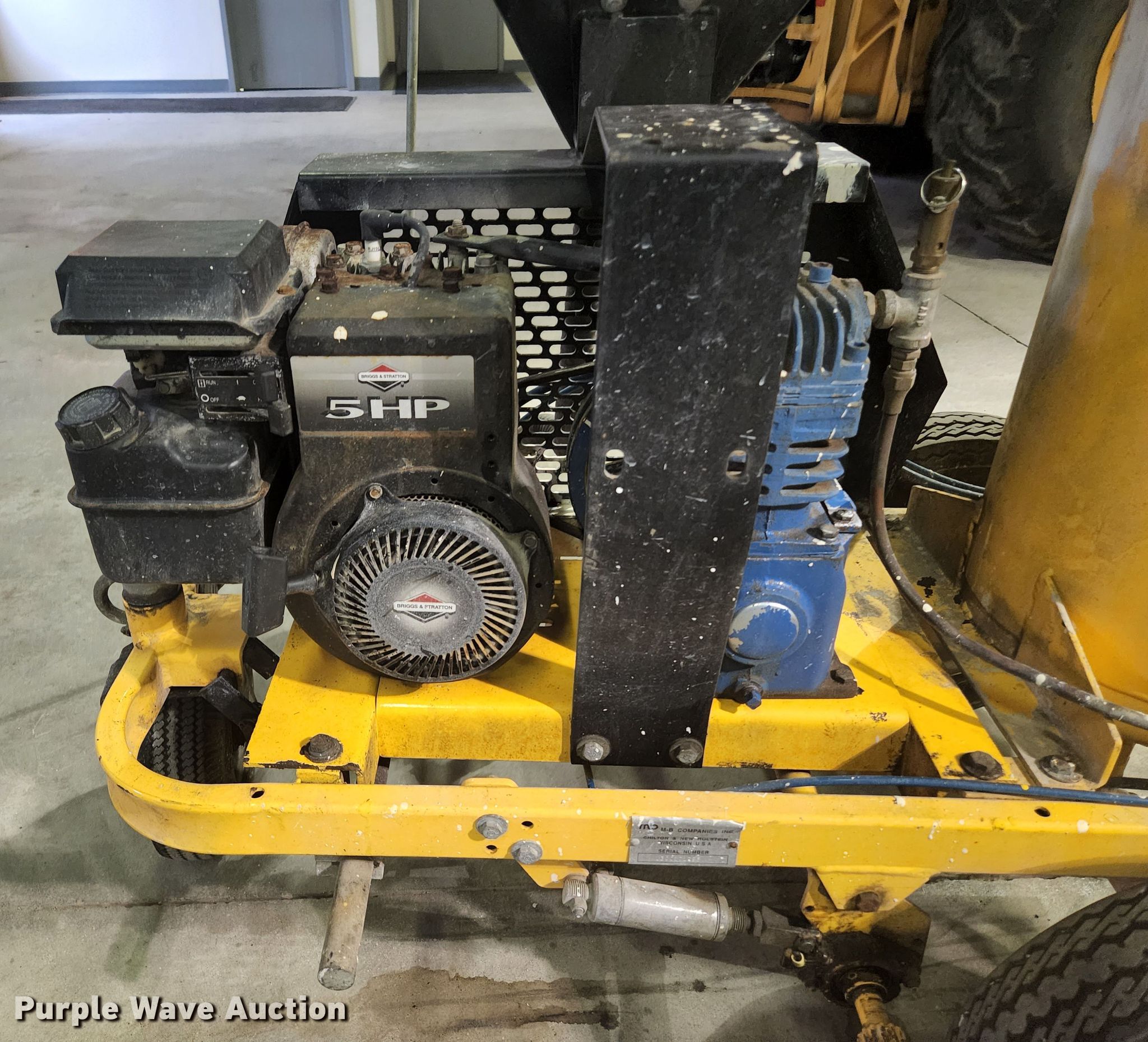 Purple Wave is selling a used Tools in Illinois. This item is a M-B Company paint striper with the following: Serial: 300101295, Briggs & Stratton gas engine, 5 HP, Air compressor