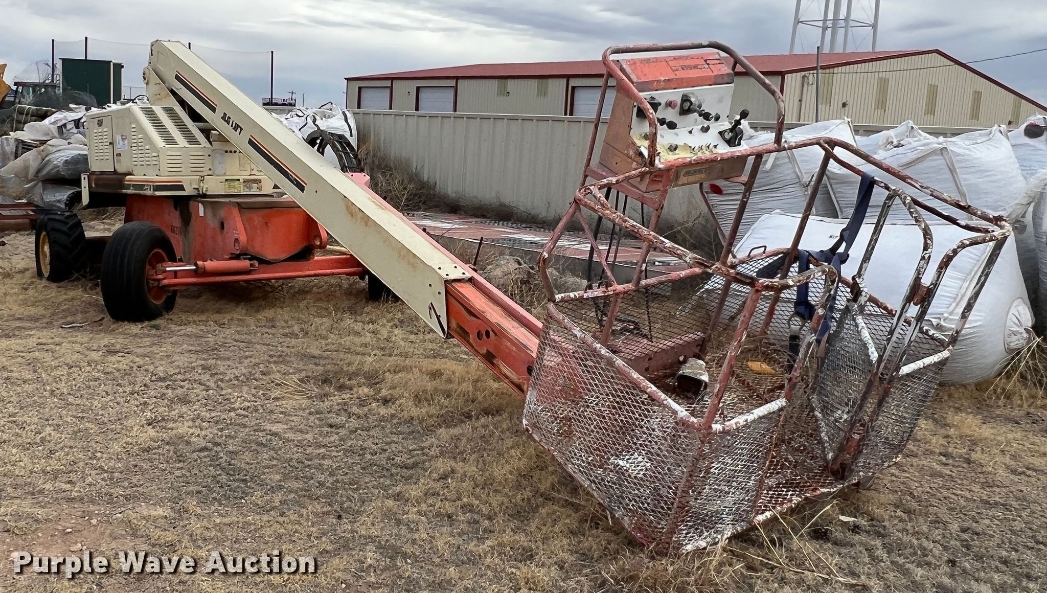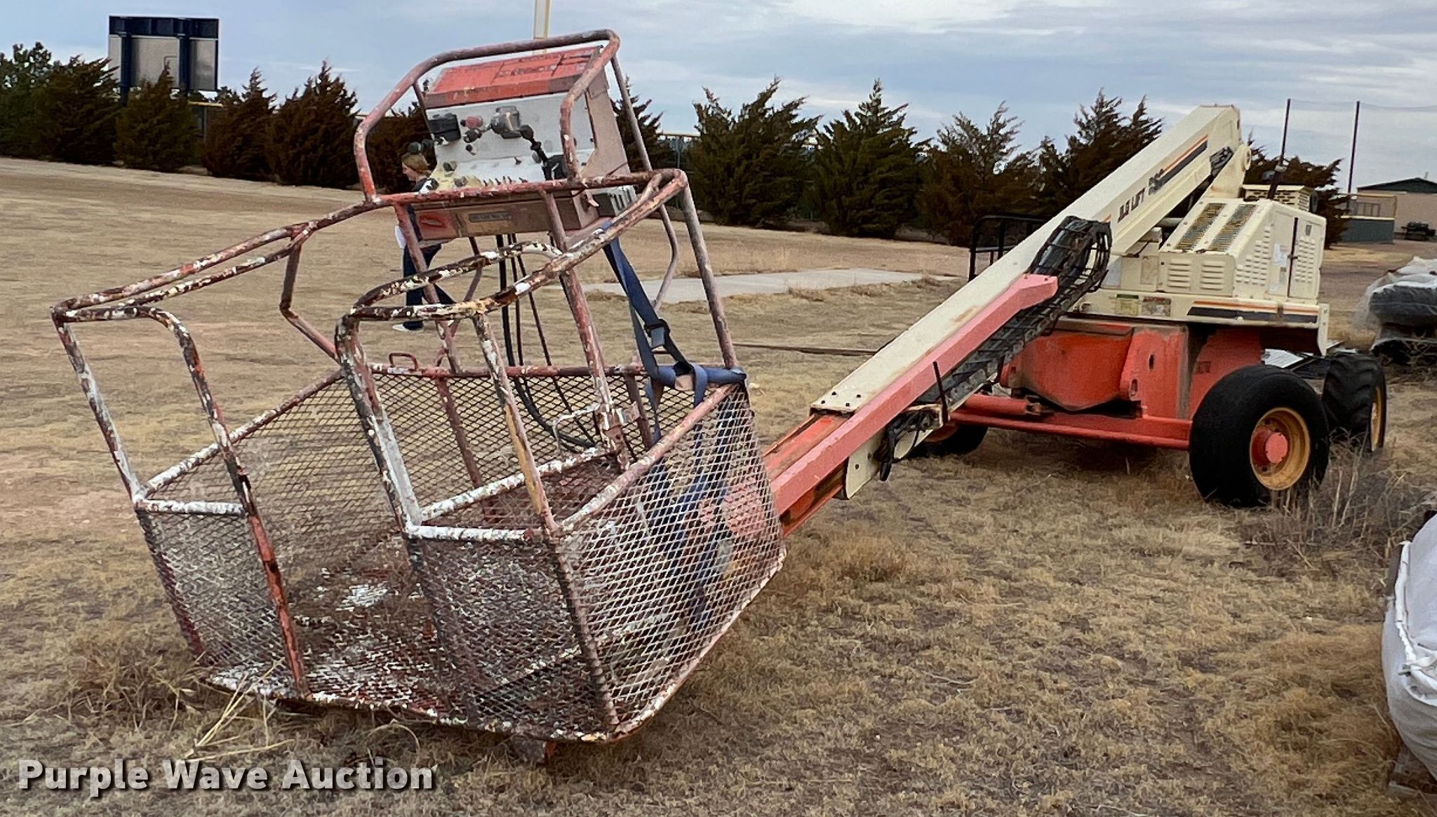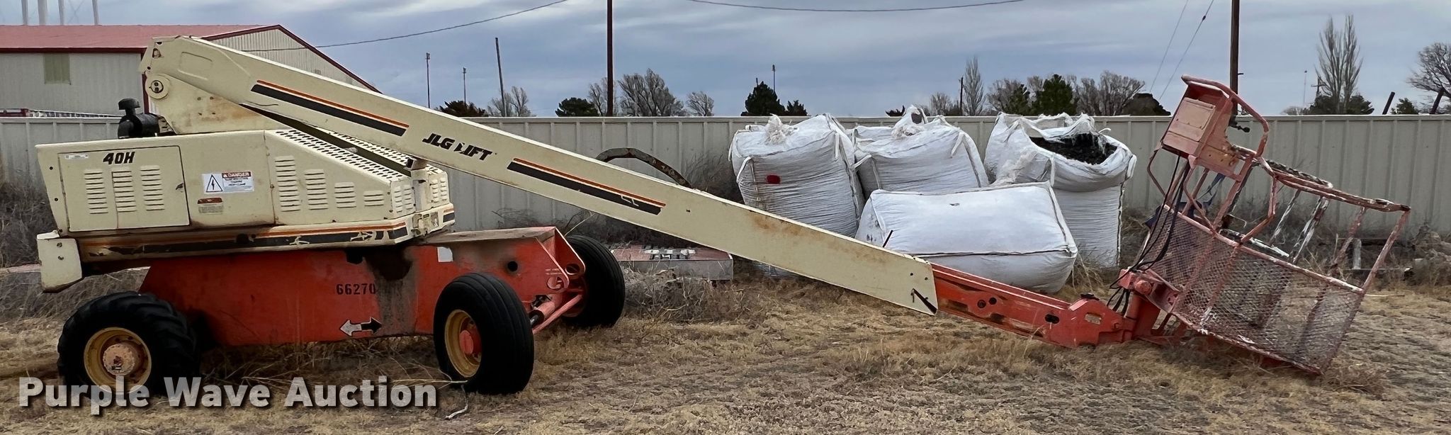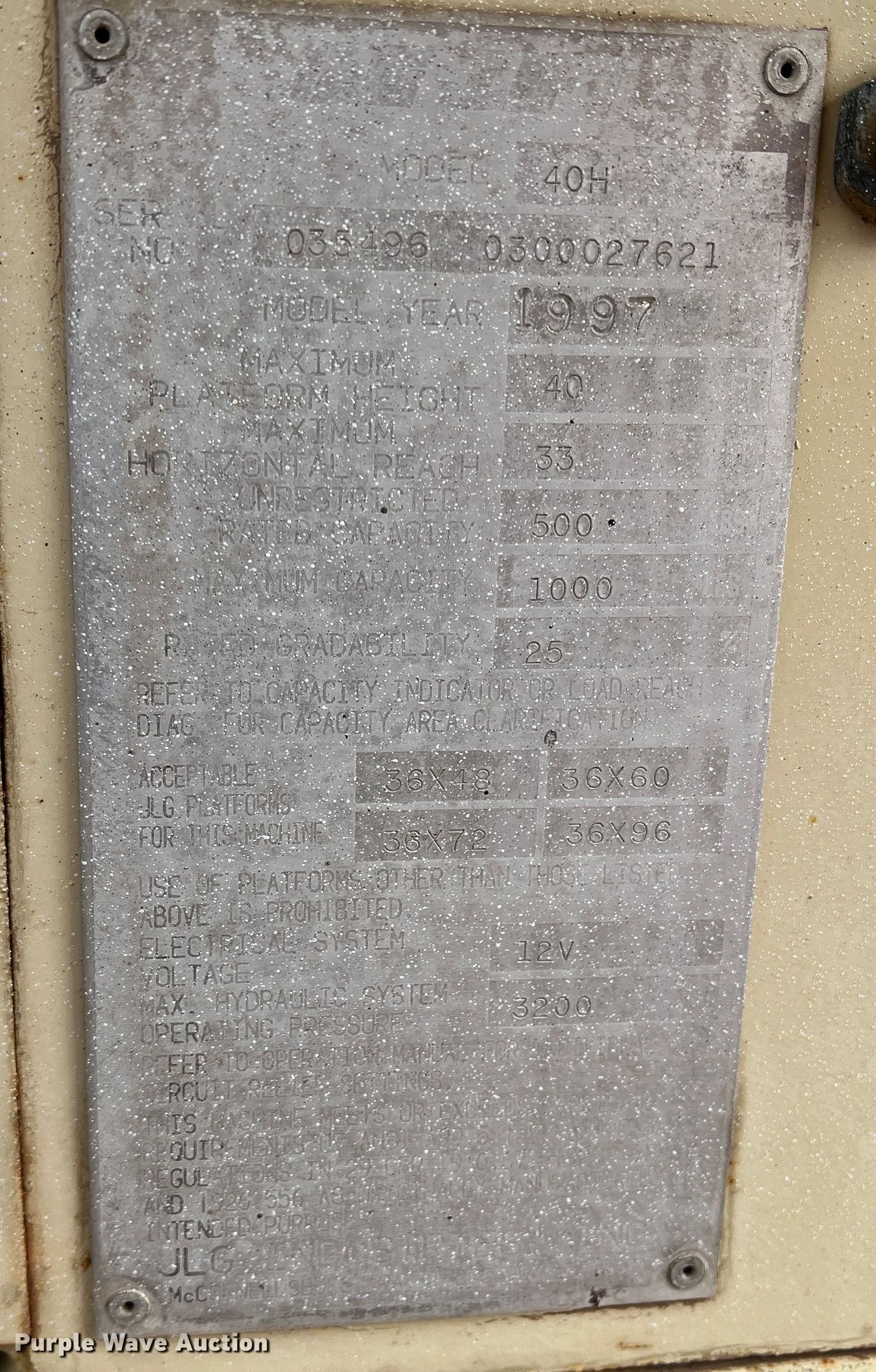 1997 JLG 40H boom lift. Hours: 3,690, Serial: 035496-0300027621. Engine Cylinders: 3, Fuel type: Diesel. Operational Rough terrain, Maximum lift capacity: 1,000 lbs, Maximum reach length: 33', Maximum lift height: 40', Platform: 35" L x 59" W, Controls: Platform, Ground. Tires Tire size: 12.5-15. Notes Unknown operating condition. 323 Eagle Blvd. Goodwell, OK 73939
