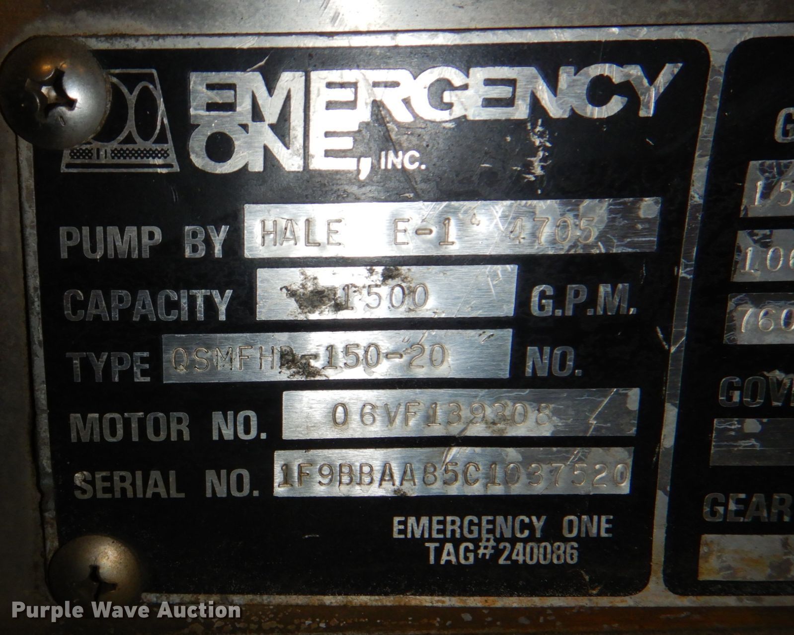 Purple Wave is selling a used Fire Truck or Emergency Vehicle in Missouri. This item is a 1986 Hale pumper fire truck with the following: Miles: 75,653 on odometer, Hours: 3,556 on meter, VIN: 1F9BBAA85G1037520