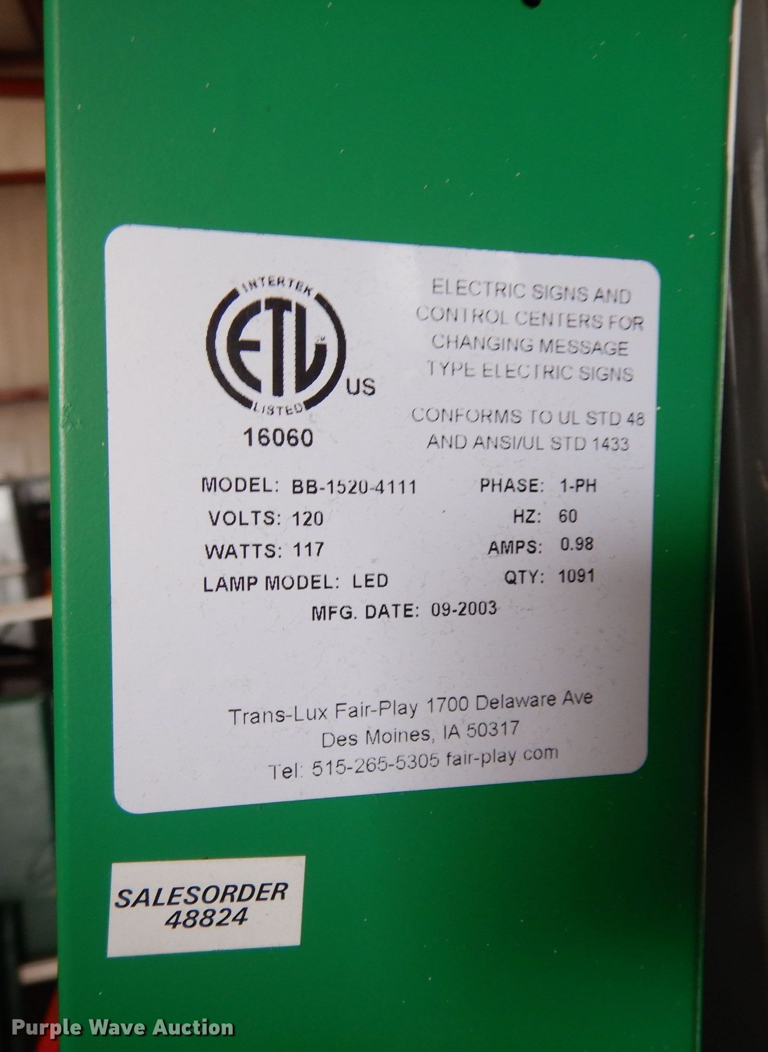 Purple Wave is selling a used Sporting Goods in Kansas. This item is a (2) 2003 Fair-Play Trans-Lux scoreboards with the following: (3) controllers, (2) non-operational, Owners manual