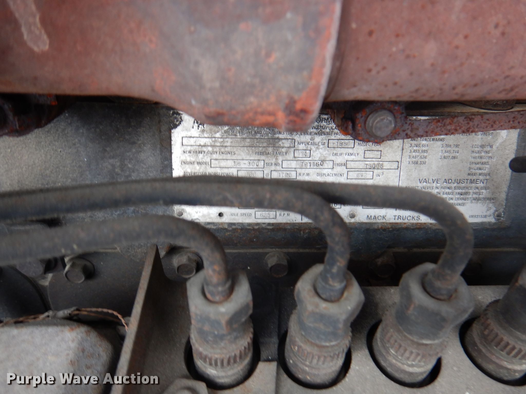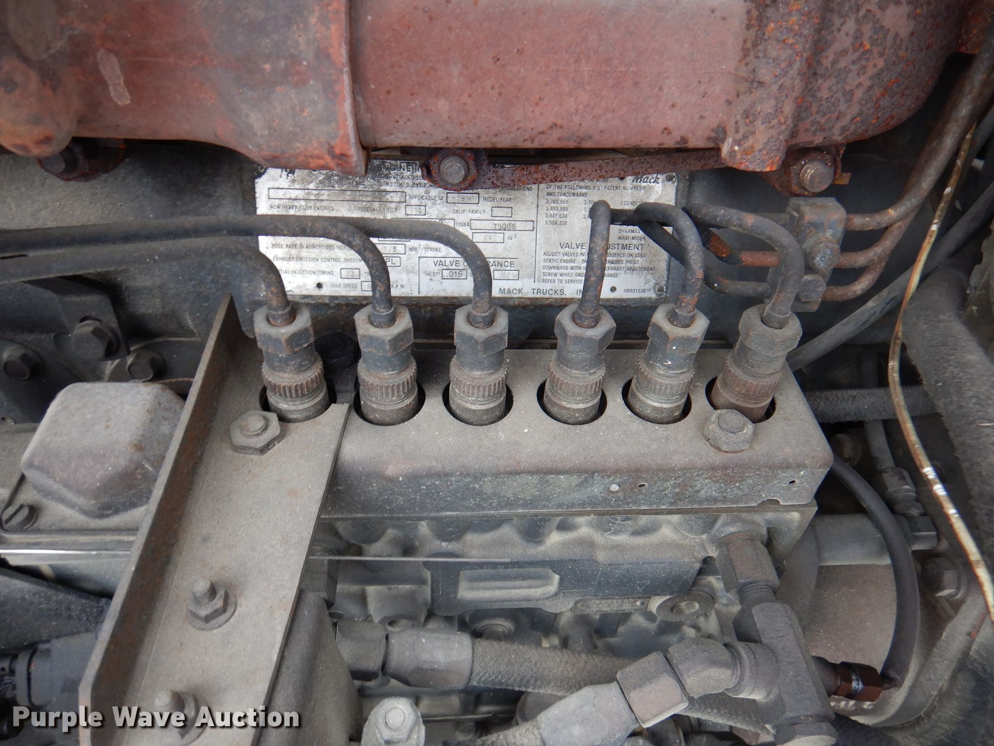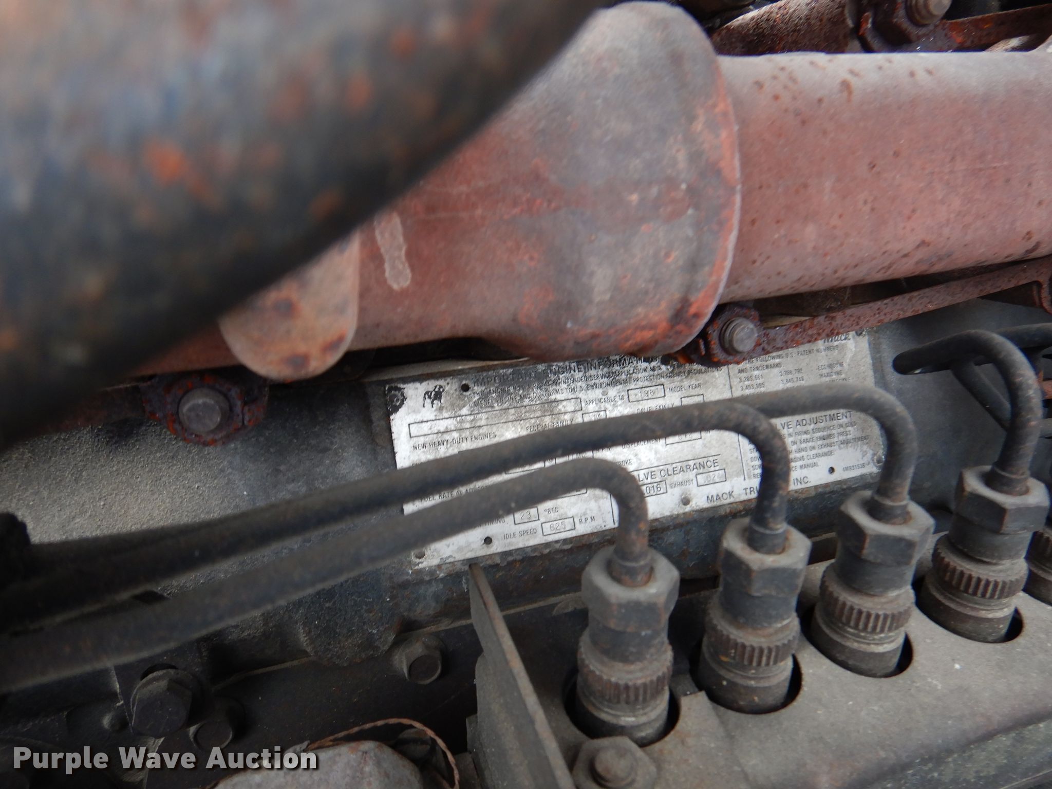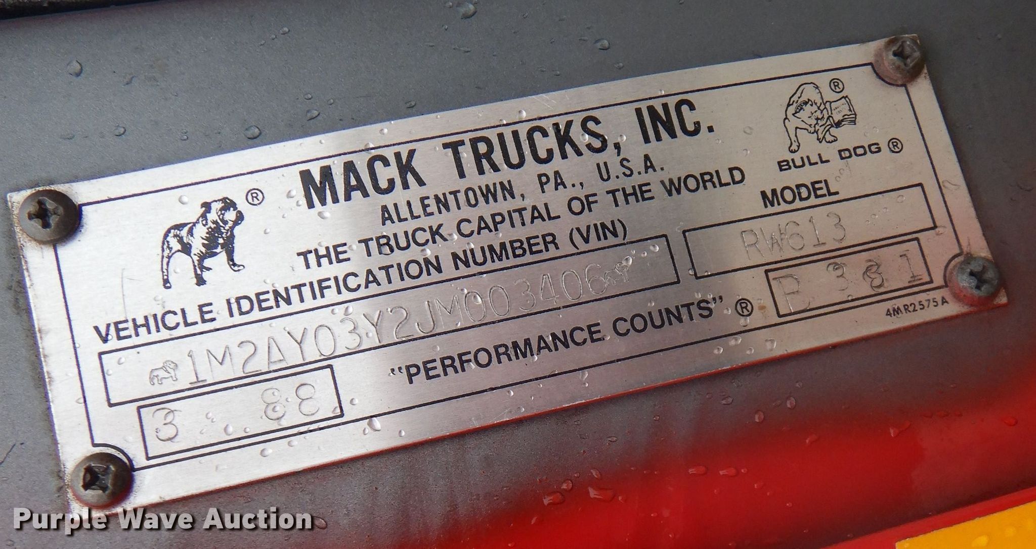 1988 Mack RW613 tanker truck. Miles: 546,692 on odometer, VIN: 1M2AY03Y2JM003406. Engine Mack E6, Displacement: 11.1L L6, Cylinders: 6, Fuel type: Diesel. Transmission Eaton Fuller, Manual, Speed: 9. Chassis Axles: Tandem, Differential lock: Inter-axle, Suspension: Spring, Brakes: Air. Interior AC, Heat, Heated mirrors. Features Bed / tank Capacity: 3,000 gallons, 17' 7" L x 7' W x 6" W, Side discharge, Top fill. Tires Front: 11R22.5, Rear: 295/75R22.5. Arkansas title. Benton County Fire Dept. 1208 SW 14th St. Bentonville, AR 72712