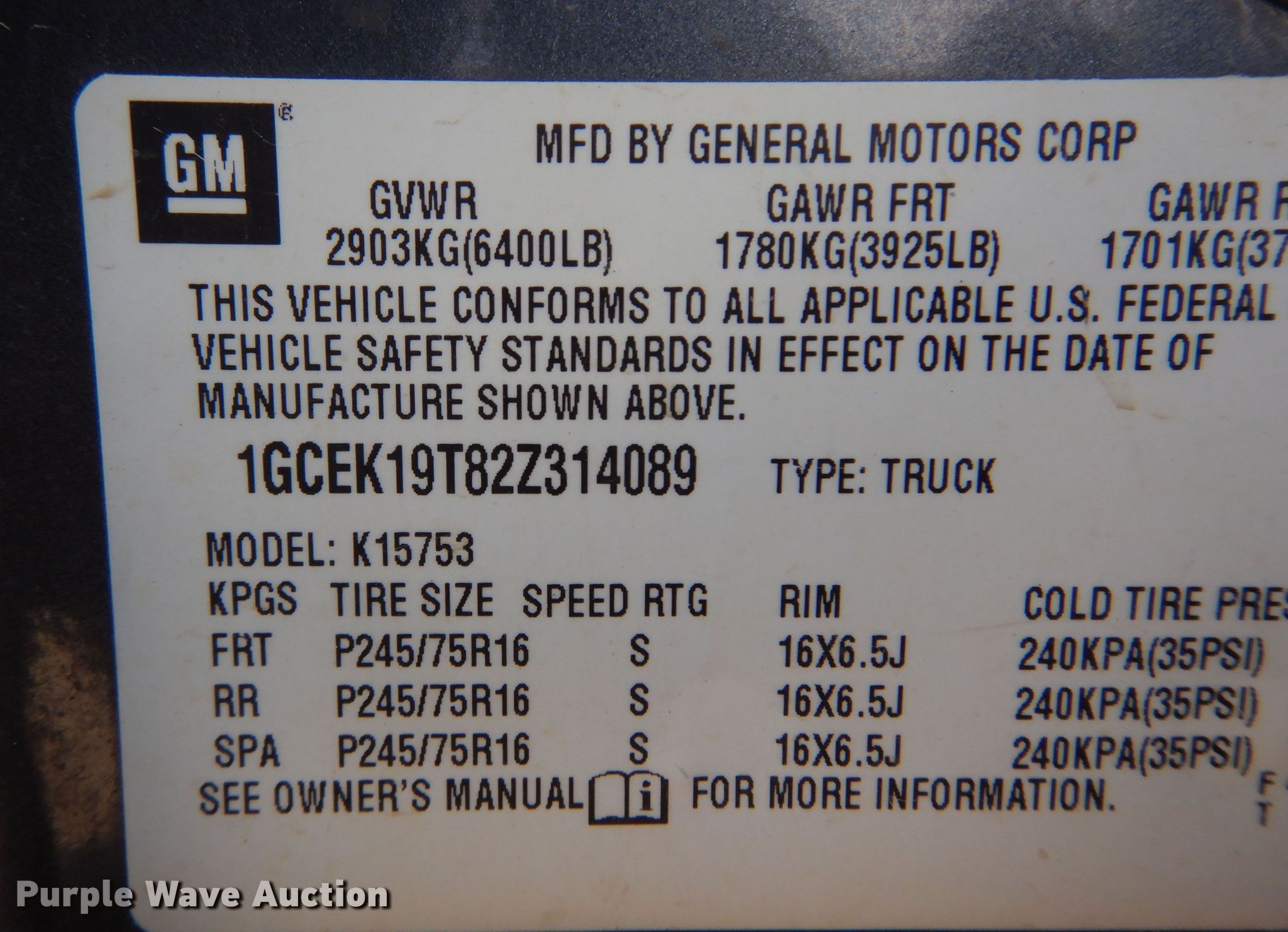 2002 Chevrolet Silverado 1500 Ext. Cab pickup truck. Miles: 284,565 on odometer, VIN: 1GCEK19T82Z314089. Engine Displacement: 5.3L V8 OHV 16V, Cylinders: 8, Fuel type: Gas. Transmission Automatic, Four wheel drive. Interior AC, Heat, Power windows, Power locks, Cruise control. Tires Size: 215/85R16. Notes Dash warning indicator: Check engine. Kansas title. Woodson County, KS. 105 W Rutledge St. Yates Center, KS 66783