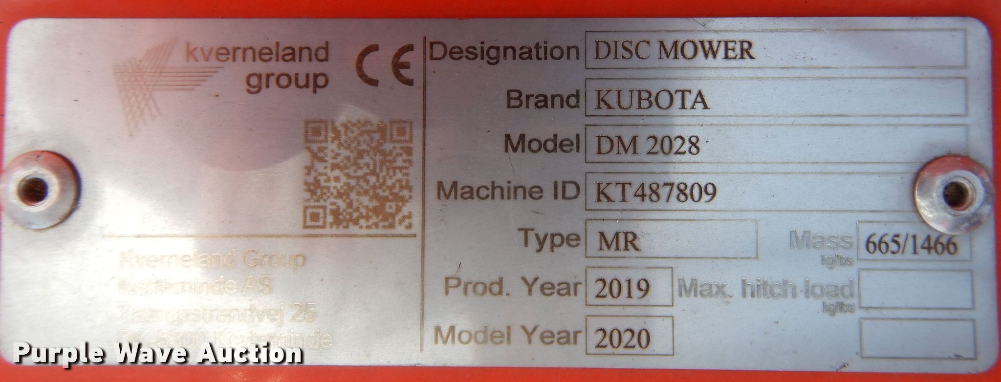 Purple Wave is selling a used Disc or Sickle Mower in Texas. This item is a 2020 Kubota DM2028 disc mower with the following: Serial: KT487809