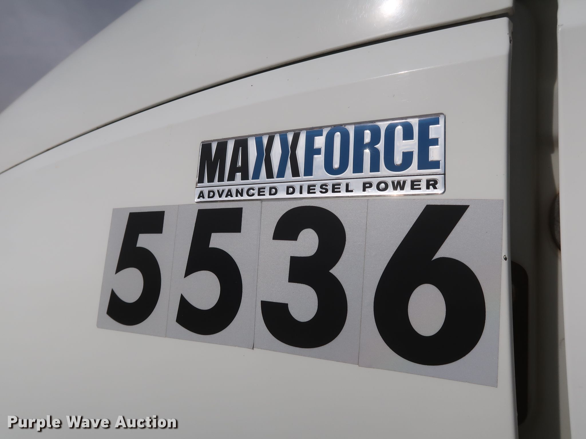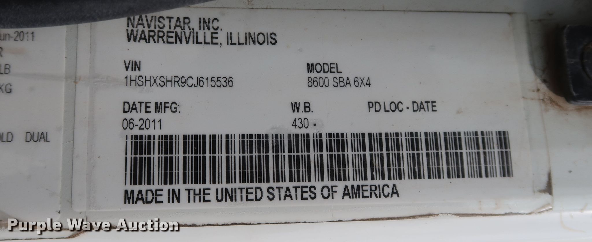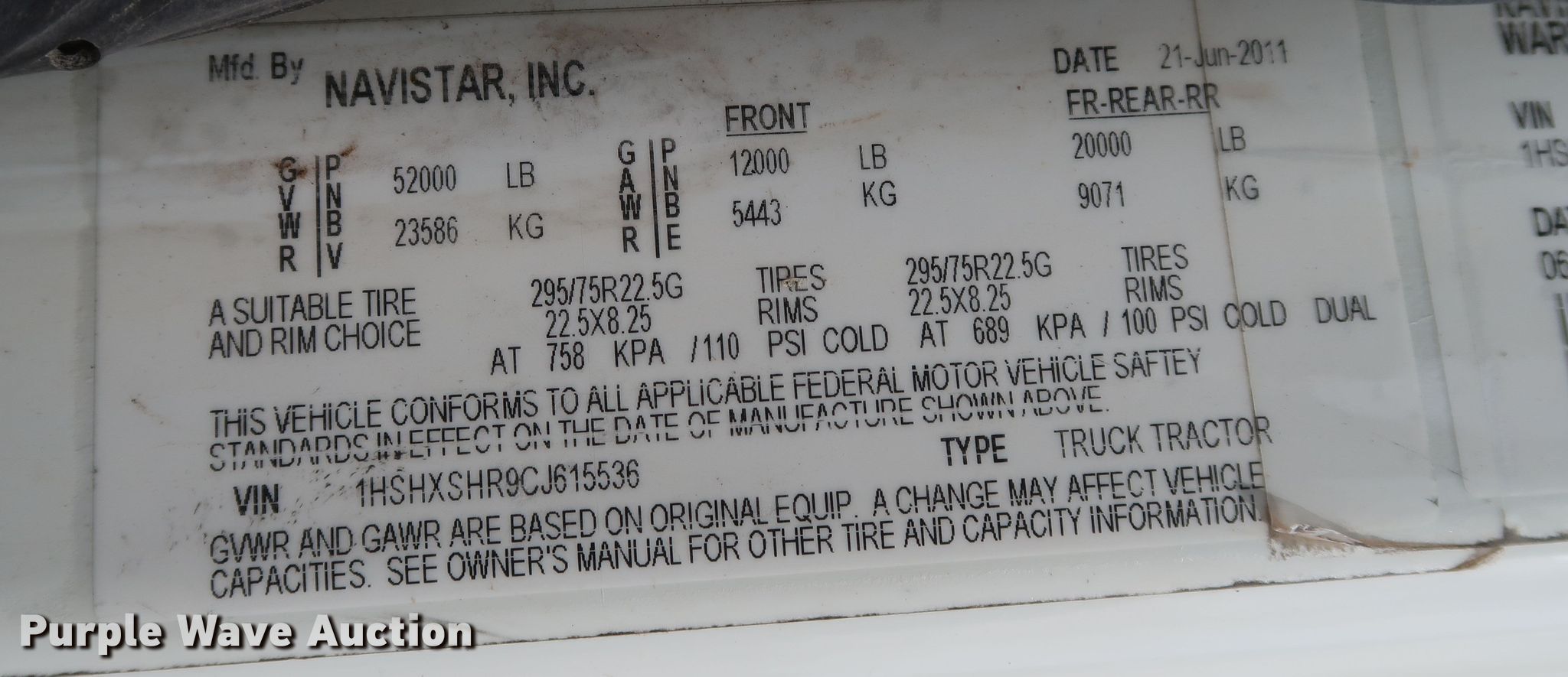 2012 International TranStar 8600 semi truck. Miles: 429,199 on odometer, Hours: 10,647 on meter, VIN: 1HSHXSHR9CJ615536, Unit #: HT5536. Engine International MaxxForce 11, Serial: 106HM2Y4120615, Displacement: 10.5L, Cylinders: 6, Fuel type: Diesel, HP: 390. Transmission Eaton Fuller, Manual, Speed: 10. Chassis Axles: Tandem, Differential lock: Inter-axle, Suspension: Air Dump valves, Brakes: Air, GVWR: 52,000 lbs FAWR: 12,000 lbs, IAWR: 20,000 lbs, RAWR: 20,000 lbs, Wheelbase: 168". Interior AC, Heat, Power windows, Power locks, Cruise control, Air ride cab. Features Deck plate: Aluminum, Fifth wheel type: Air operated, Sliding, Fuel tank: Dual. Tires Size: 295/75R22.5. Notes Dash warning indicator: Check engine. Oklahoma title. Title distribution may be delayed up to 30 days from verification of funds. B & H Construction, LLC. 301 James Dean Dr. Norman, OK 73072
