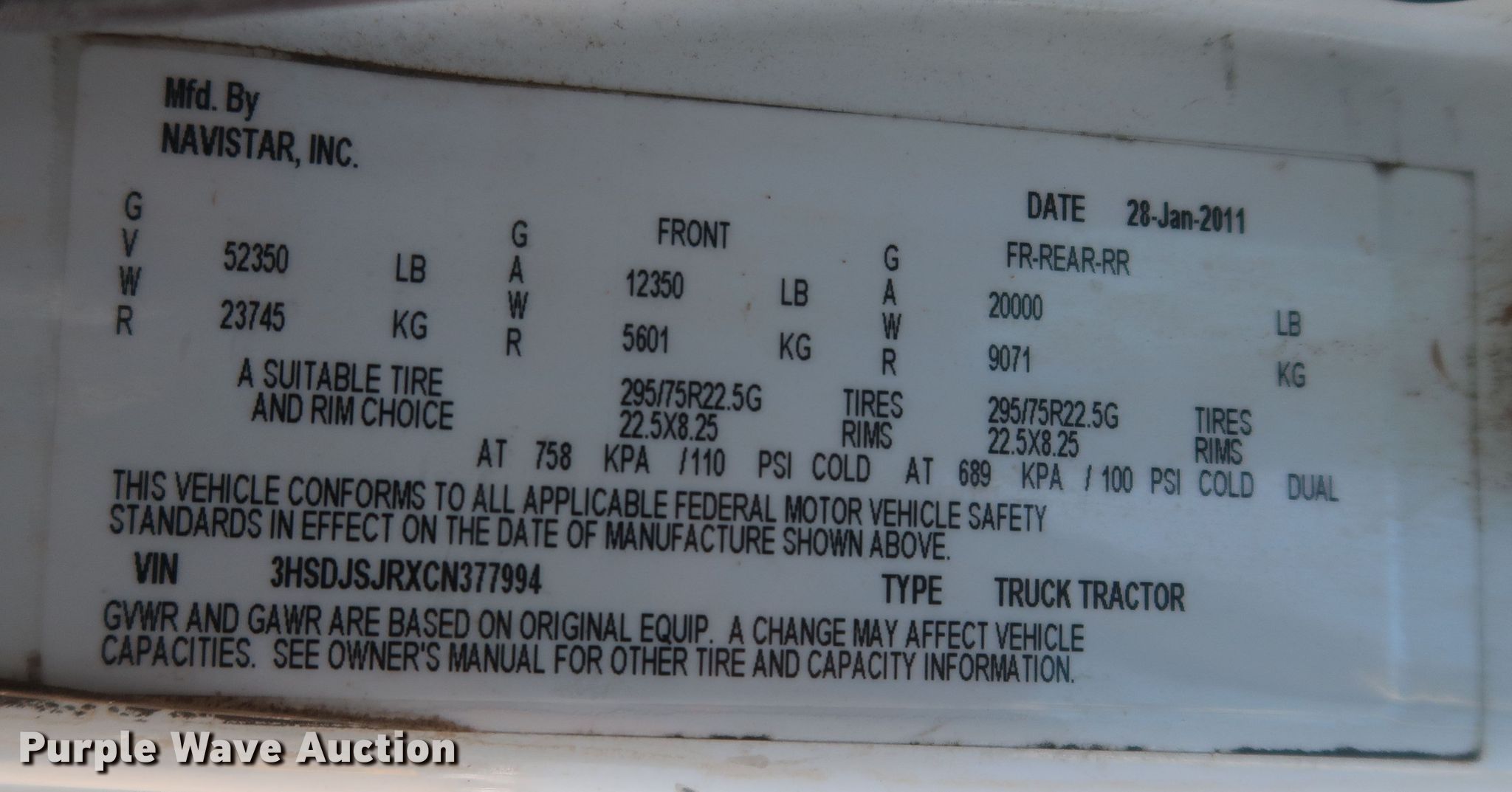 2012 International ProStar Plus 122 semi truck. Miles: 433,579 on odometer, Hours: 13,393 on meter, VIN: 3HSDJSJRXCN377994, Unit #: HT7994. Engine International MaxxForce 13, Serial: 1S125HM2Y4108331, Displacement: 13.0L, Cylinders: 6, Fuel type: Diesel, HP: 450, Engine brake. Transmission Eaton Fuller, Manual, Speed: 10. Chassis Axles: Tandem, Differential lock: Inter-axle, Suspension: Air Dump valves, Brakes: Air, GVWR: 52,350 lbs FAWR: 12,350 lbs, IAWR: 20,000 lbs, RAWR: 20,000 lbs, Wheelbase: 232". Interior AC, Heat, Heated mirrors, Power windows, Power locks, Cruise control, Air ride cab, Sleeper Sleeper length: 60", Beds: Single, Rear climate control. Features Deck plate: Aluminum, Fifth wheel type: Air operated, Sliding, Fuel tank: Dual. Tires Front: 11R22.5, Rear: 295/75R22.5. Notes Dash warning indicator: Check engine, ABS, Non-operational unit. Oklahoma title. Title distribution may be delayed up to 30 days from verification of funds. B & H Construction, LLC. 301 James Dean Dr. Norman, OK 73072