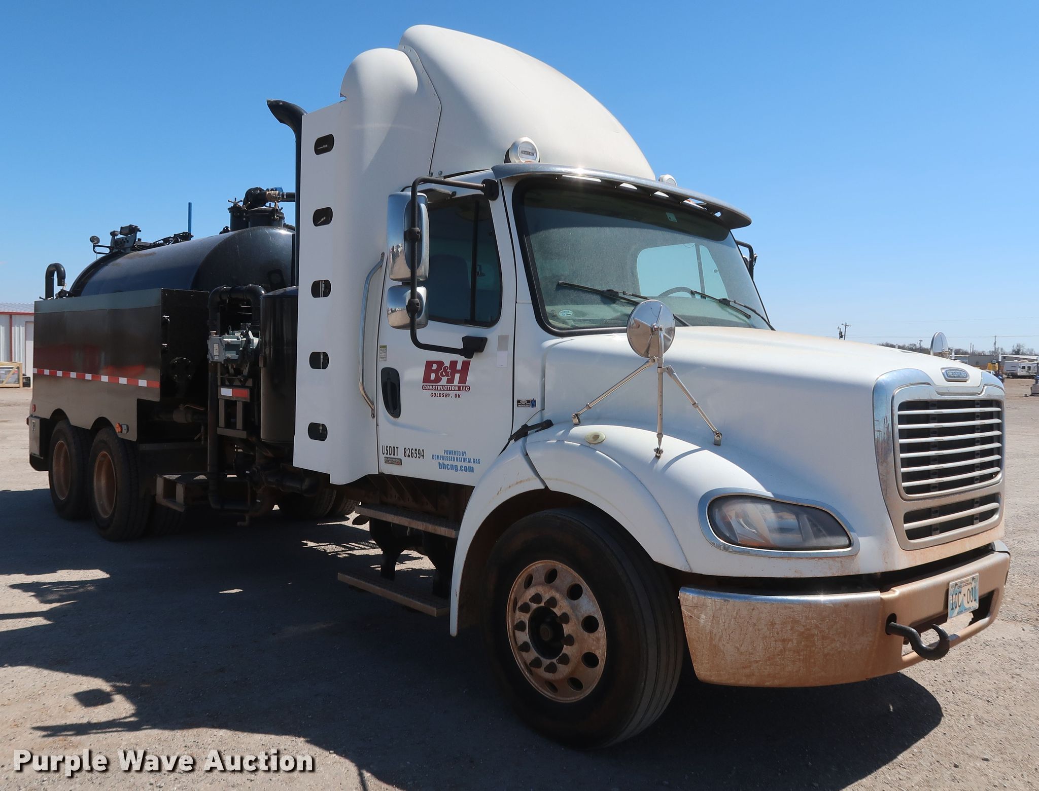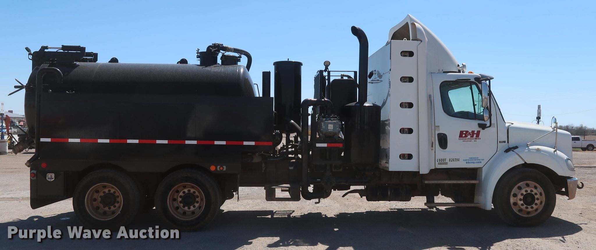 2011 Freightliner Business Class M2 112 vacuum truck. Miles: 115,542 on odometer, Hours: 5,686 on meter, VIN: 1FUJC5DX9BHA96467, Unit #: 2605. Engine Cummins ISL G 320, Serial: 73104863, Displacement: 8.9L, Cylinders: 6, Fuel type: CNG, HP: 320. Transmission Allison, Automatic. Chassis Axles: Tandem, Suspension: Air, Brakes: Air, PTO, GVWR: 52,000 lbs, Wheelbase: 246". Interior AC, Heat, Heated mirrors, Power windows, Cruise control. Features Tank bed 12'L x 72" diameter, Capacity: 2,500 gallons, Top hatches: 2, Rear outlet: 6", 4", Vacuum pump Triplex, Blower Howden Roots, Hose reel Manual. Tires Size: 295/75R22.5. Oklahoma title. Title distribution may be delayed up to 30 days from verification of funds. B & H Construction, LLC. 301 James Dean Dr. Norman, OK 73072