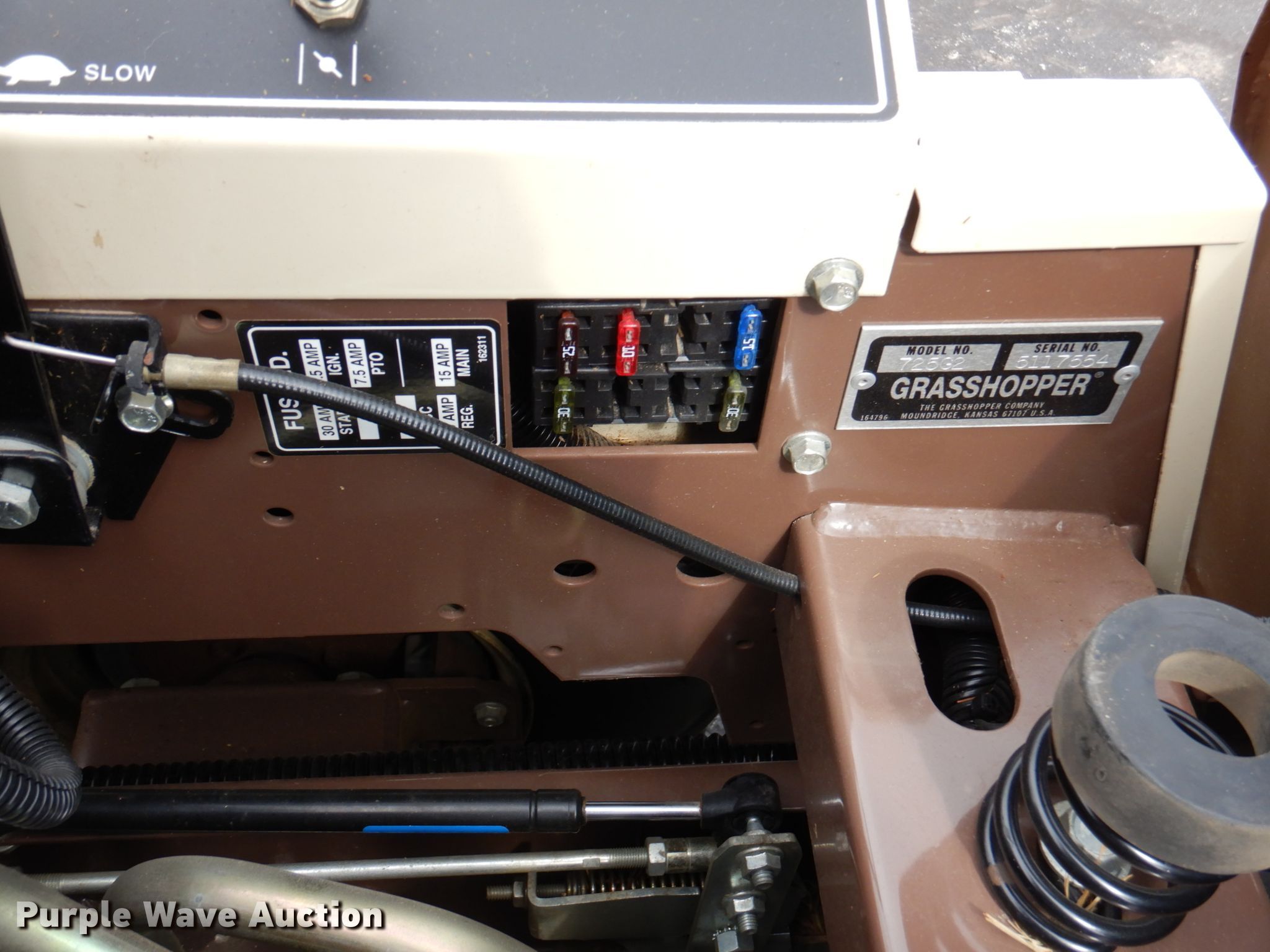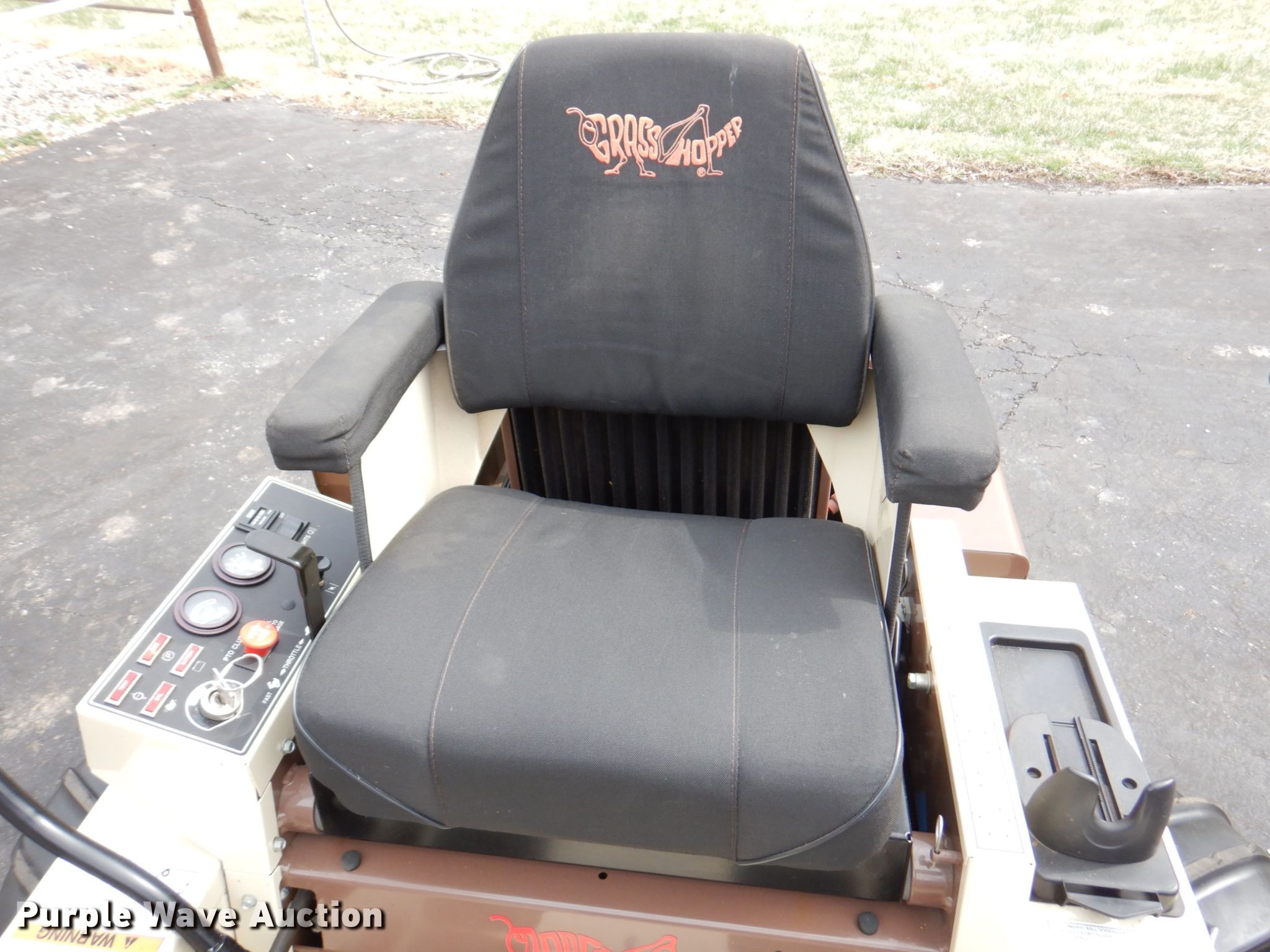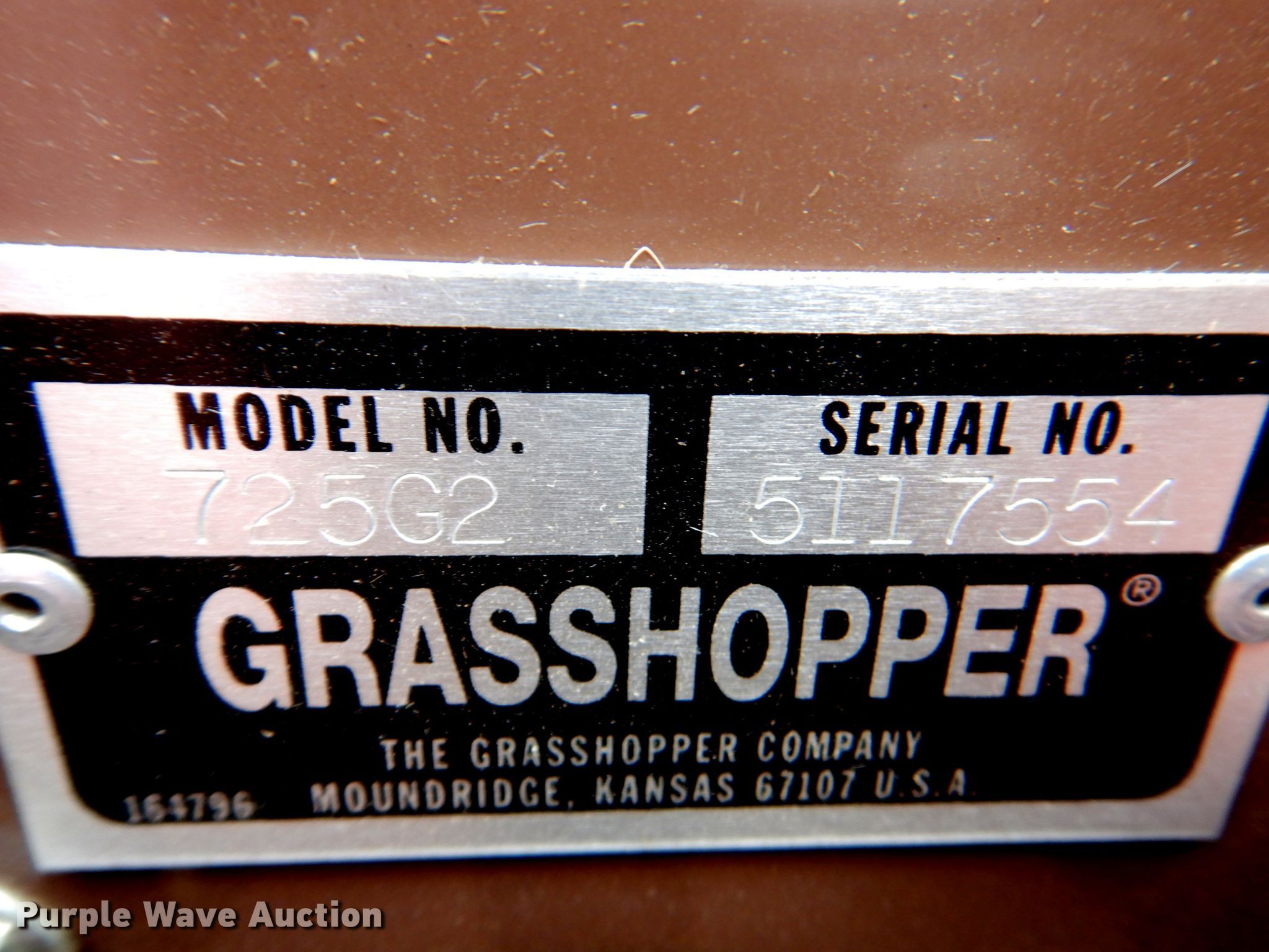 Purple Wave is selling a used Lawn Mower in Kansas. This item is a Grasshopper 725G2 ZTR lawn mower with the following: Hours: 891 on meter, Cutting width: 52", Serial: 5117554