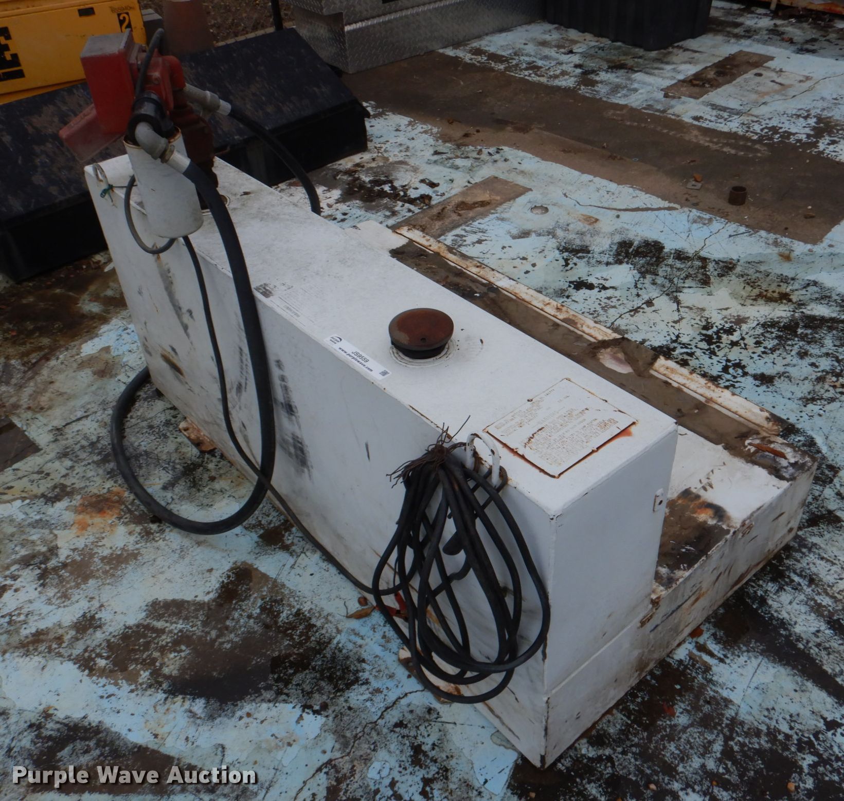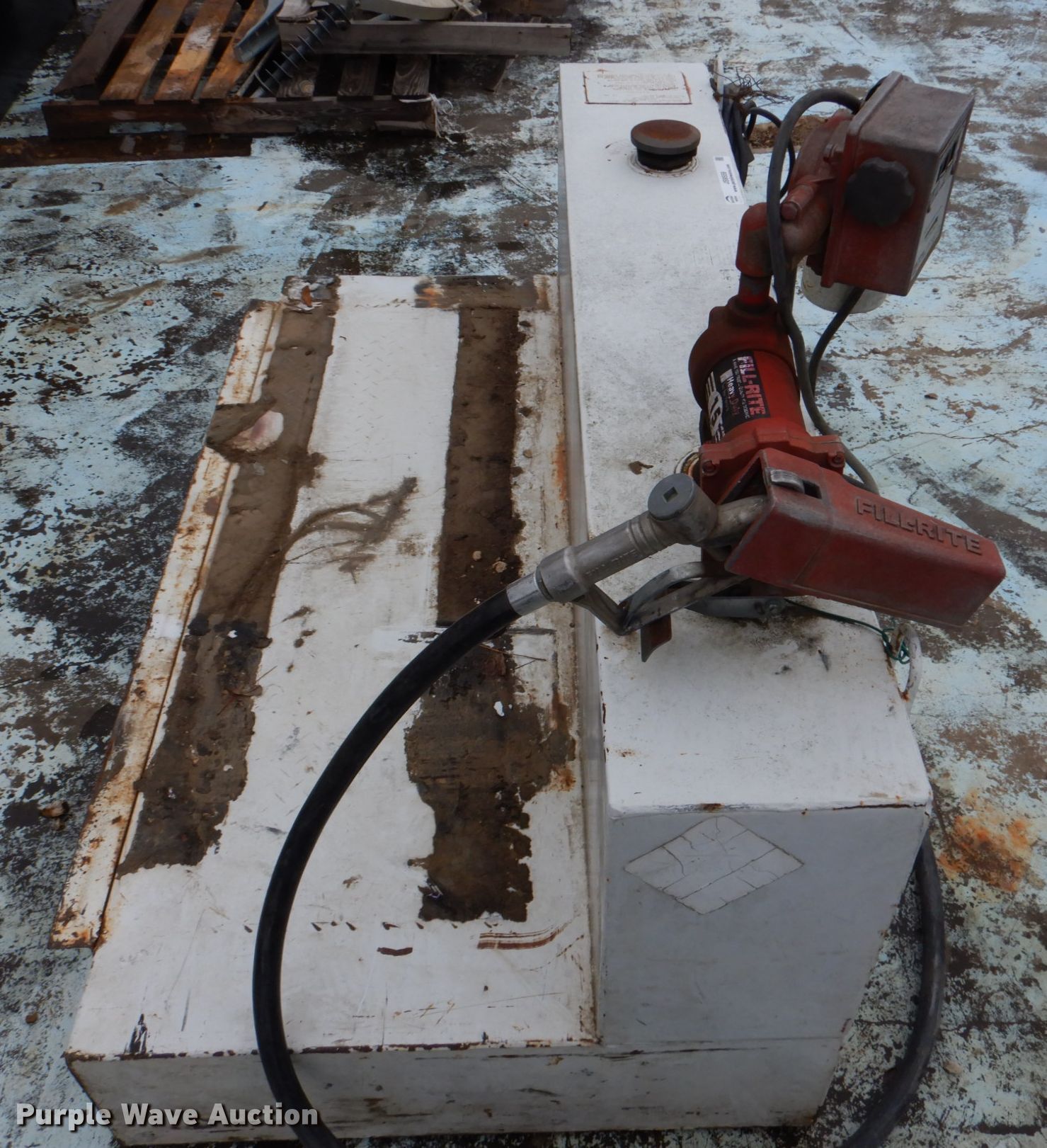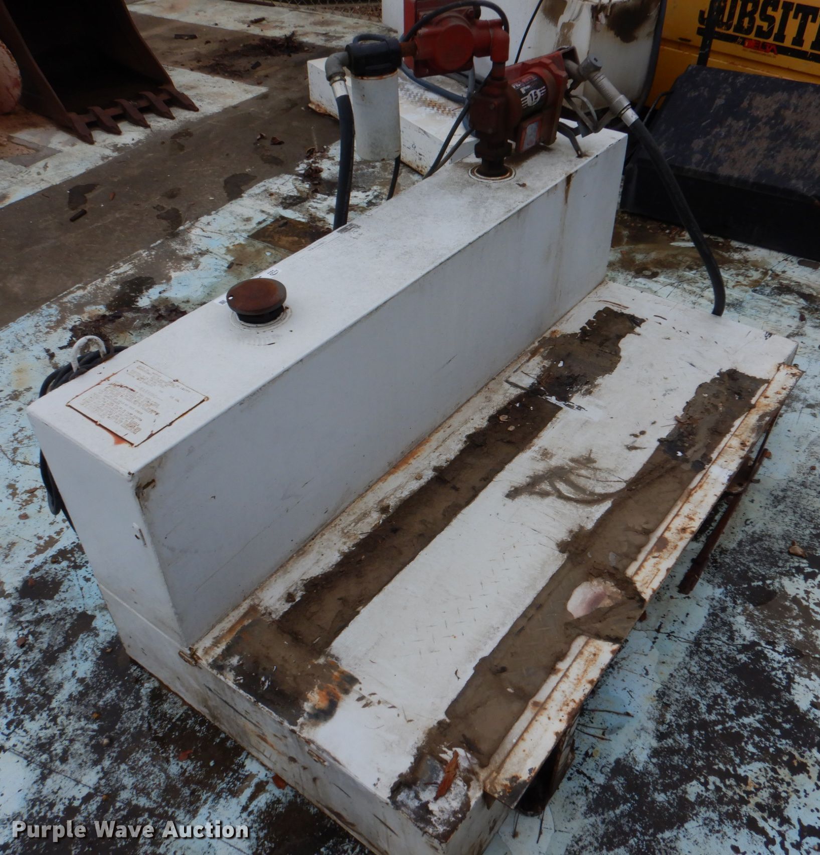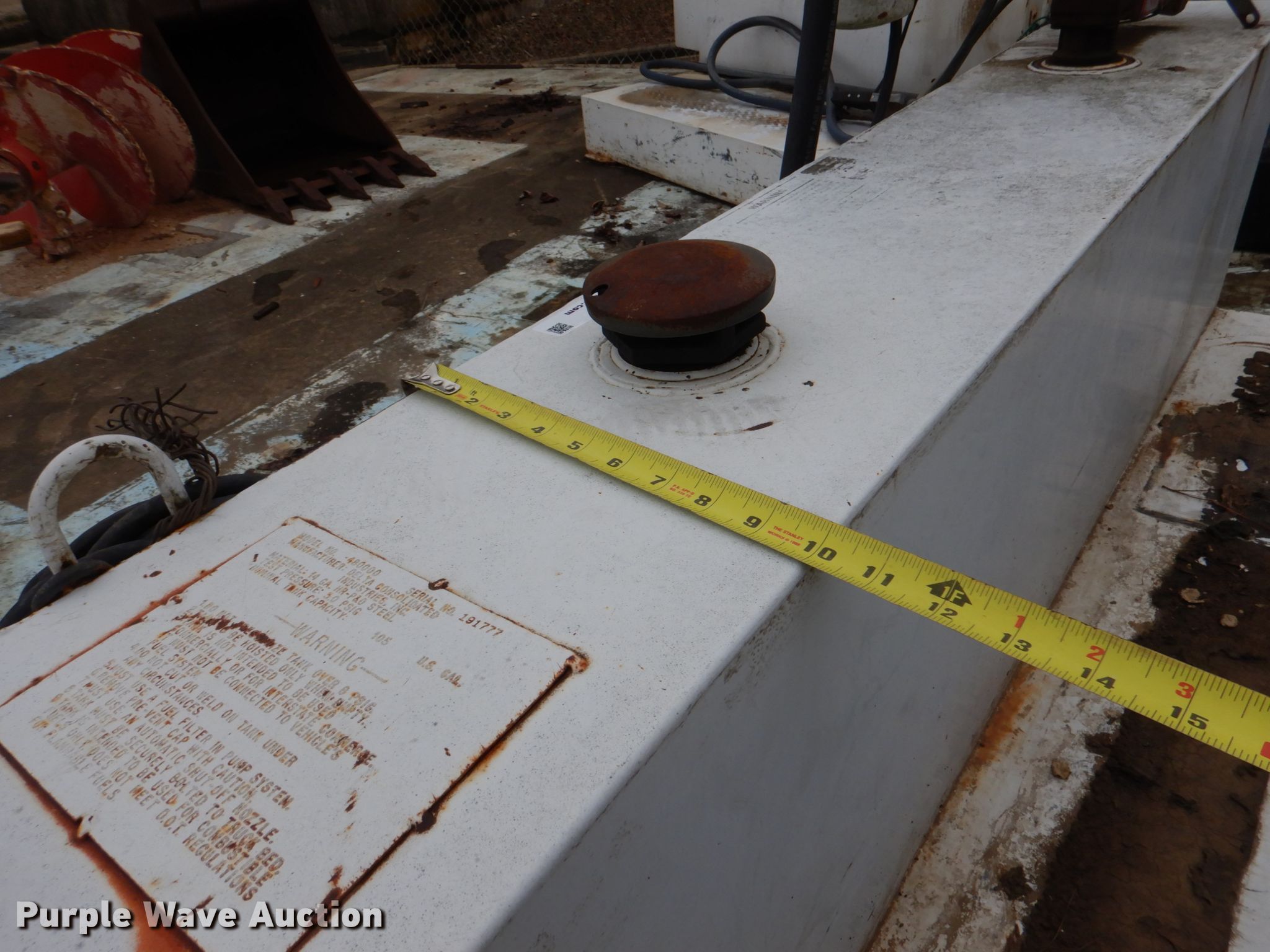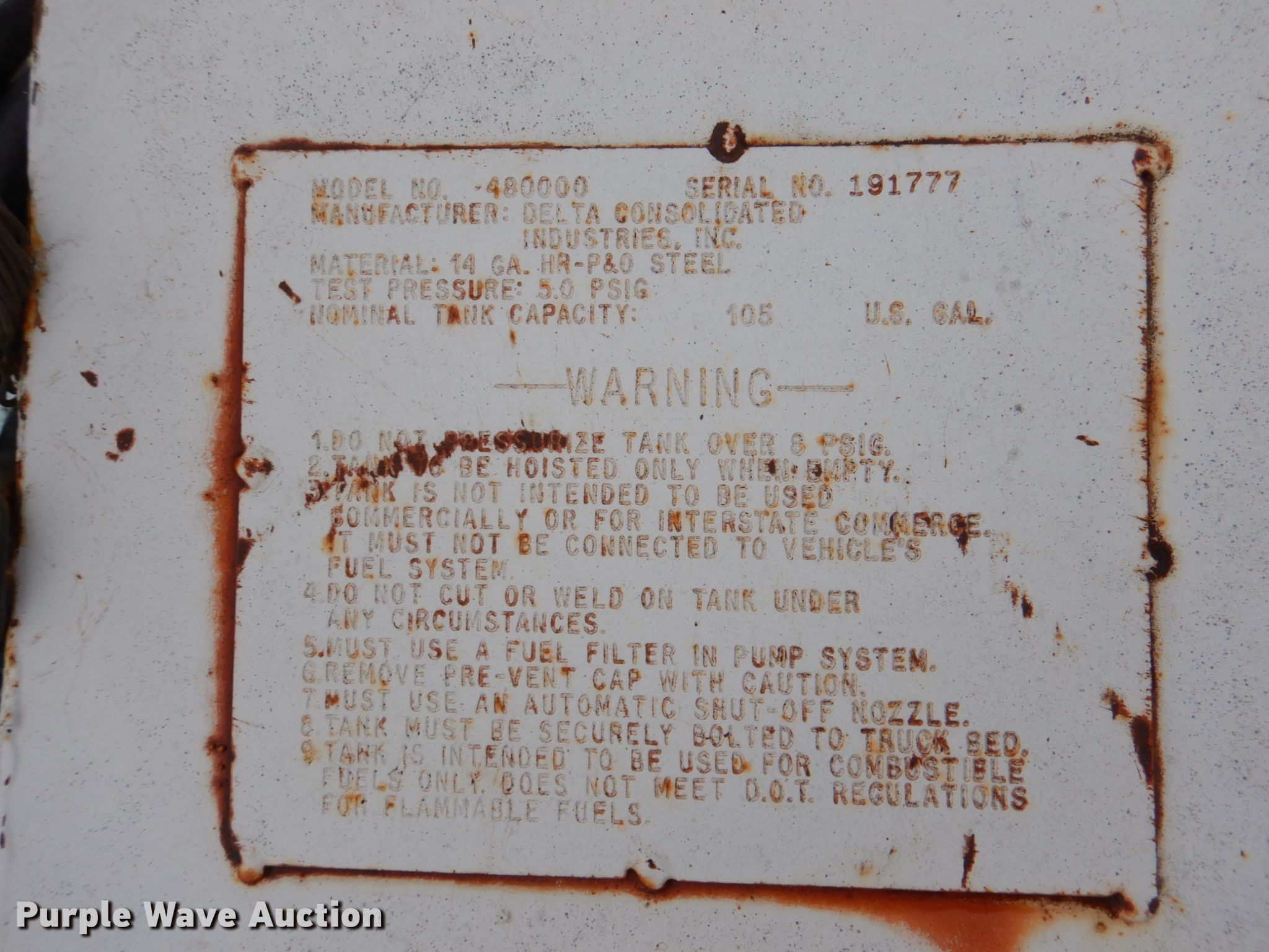 Purple Wave is selling a used Fuel and Lube in Oklahoma. This item is a Delta Consolidation 480000 L-shaped auxiliary fuel tank with the following: Capacity: 105 gallons, Length: 59", Fill-Rite 15GPM pump, Fill-Rite 800c meter, Serial: 191777