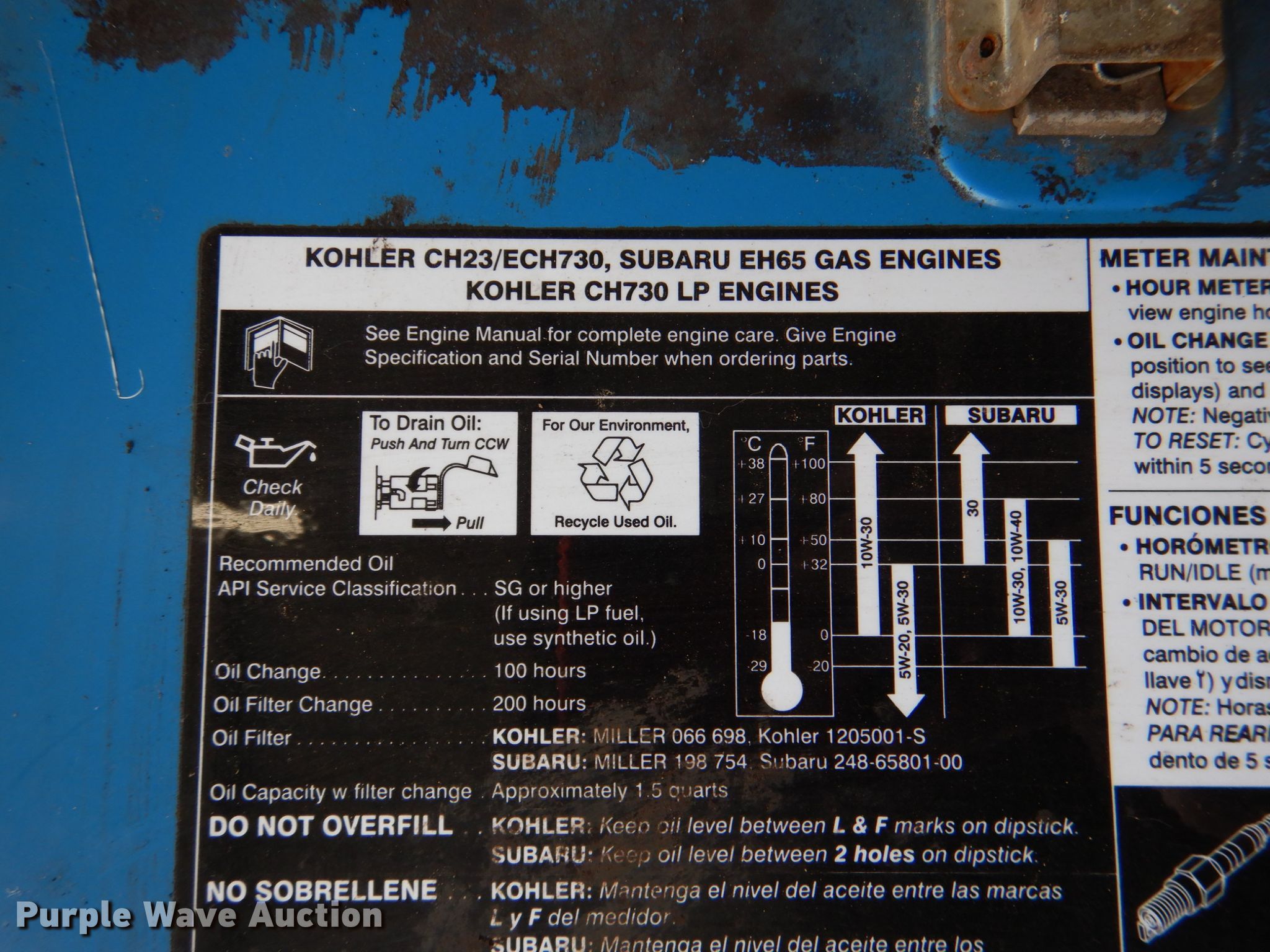 Miller Bobcat 250 welder/generator. Hours: 96 on meter, Hours: Unknown, Serial: MA330076H. Engine Subaru EH65, Cylinders: 2, Fuel type: Gas. Operational Welder Capabilities: CC, CV, DC, AC, Wire, TIG, Stick, Generator Watts: 1,100, Phase: Single, 240V outlets: 1, 120V outlets: 4. 1033 N 4250 Rd. Hugo, OK 74743