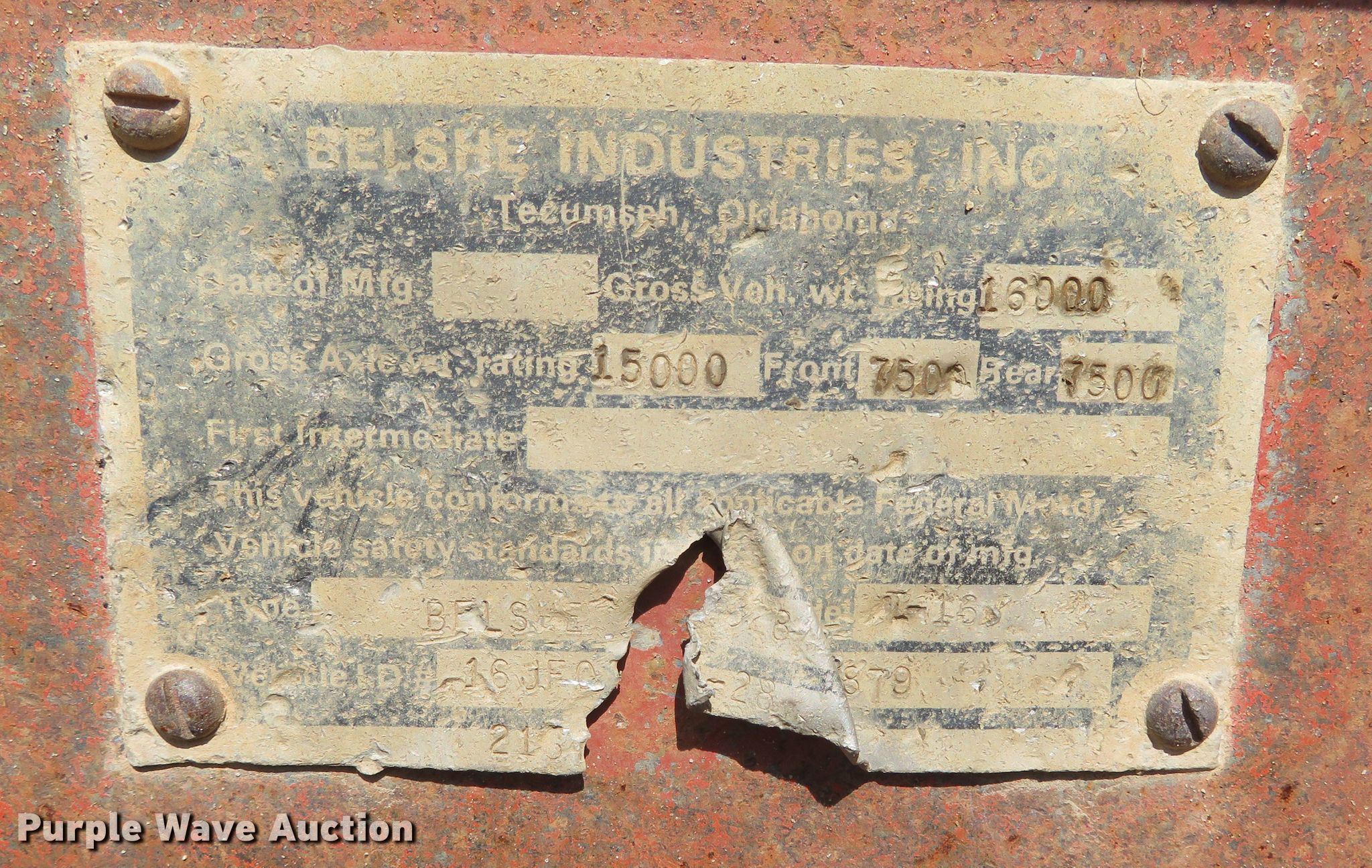 1998 Belshe Industries L-16 equipment trailer. VIN: 16JF01628W1030879. Dimensions Overall: 24' L x 8' W, Deck: 16' L x 6' 5" W, Deck height: 2', Tail length: 2', Ramps: Manual Length: 4' 5". Features Deck type: Wood. Chassis Hitch: Pintle, Landing gear: Single, Suspension: Spring, Brakes: Electric, Axles: Tandem, GVWR: 15,000 lbs. Tires Steel wheels, Size: 235/75R17.5. Missouri title. Coastal Bay, Inc.. 302 Cooper St. Dexter, MO 63841