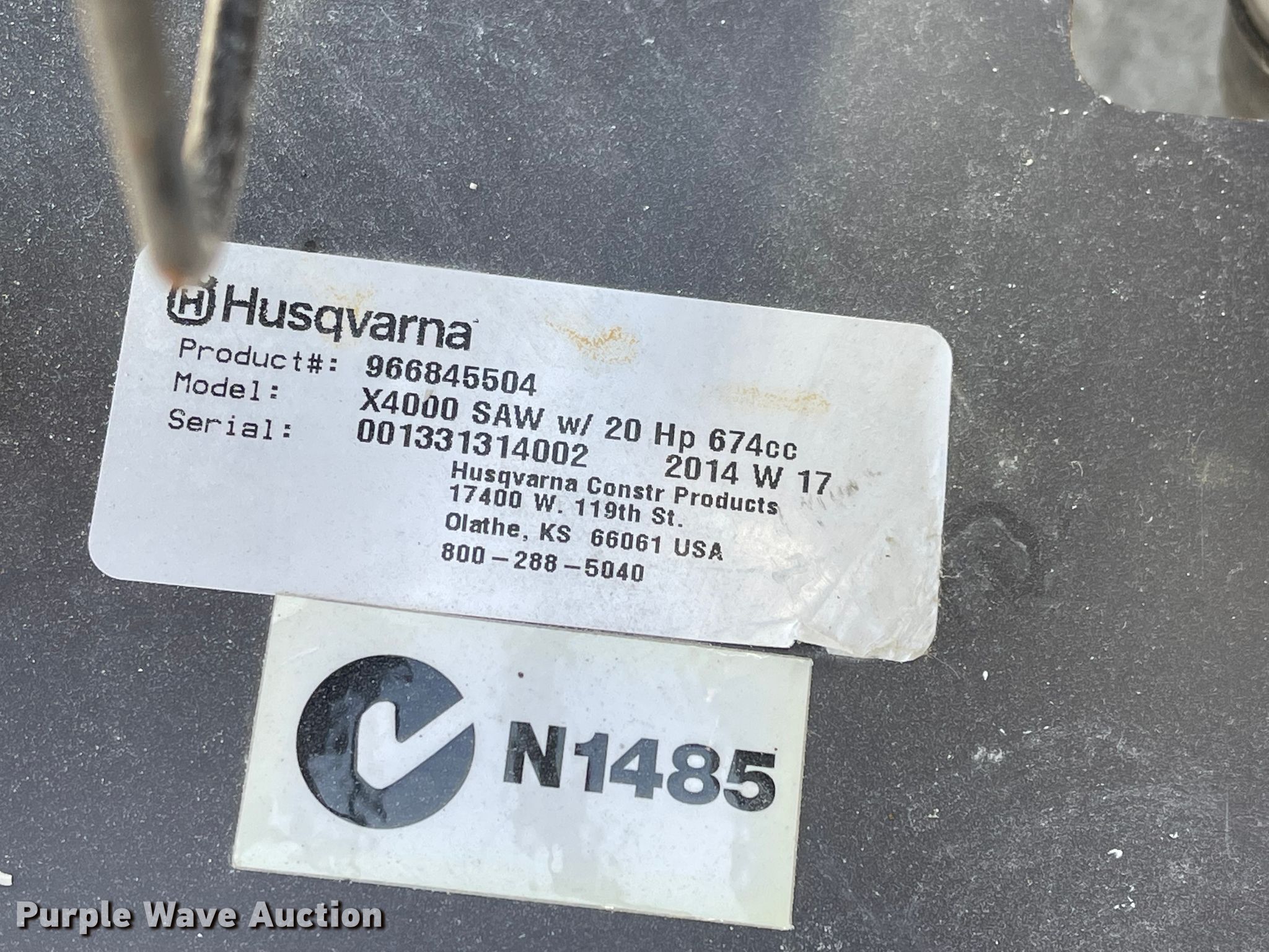 Purple Wave is selling a used Concrete Equip. or Acces. in Kansas. This item is a Husqvarna Soff Cut 4000 concrete saw with the following: Kohler Command Pro two cylinder gas engine, 12 to 14" blade capacity, Serial: 001331314002