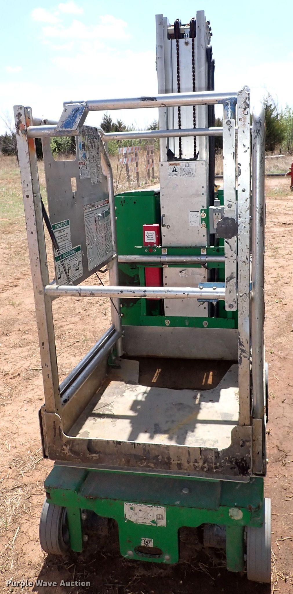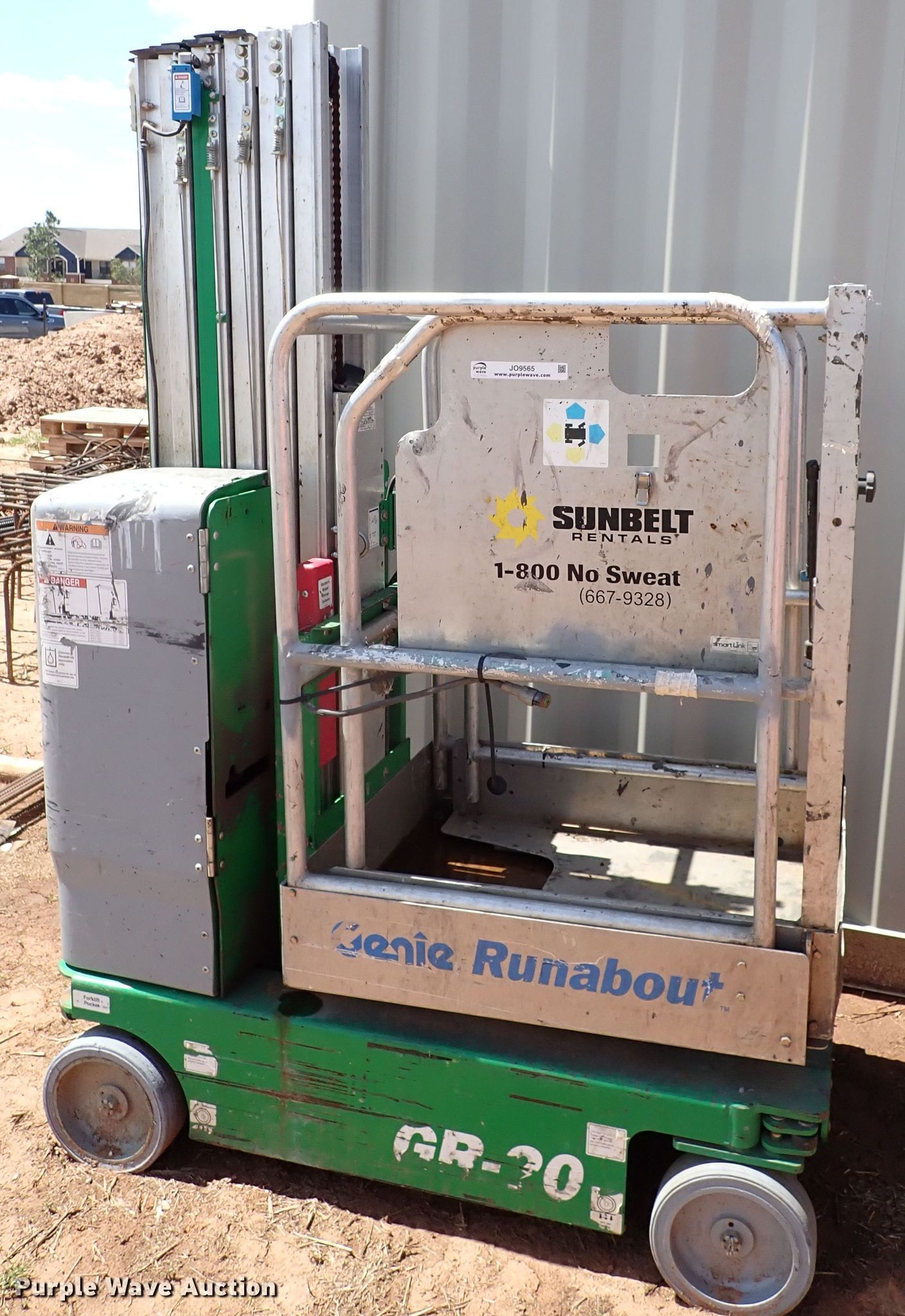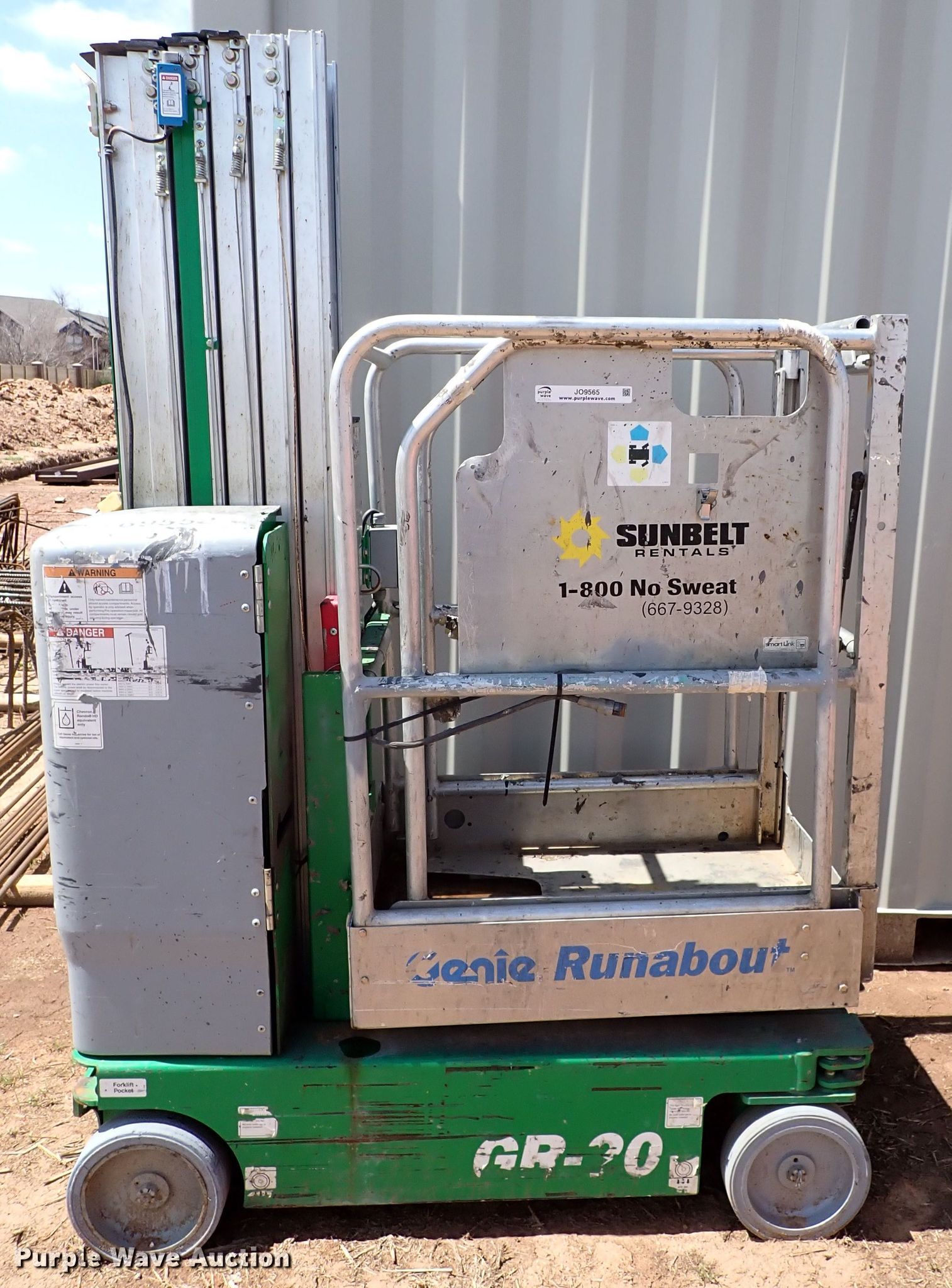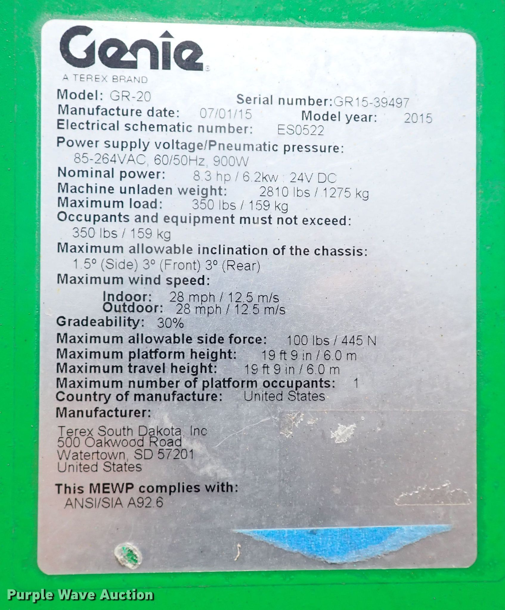 Purple Wave is selling a used Scissor or Vertical Lift in Oklahoma. This item is a 2015 Genie GR-20 vertical lift with the following: Hours: Unknown, Serial: GR15-39497
