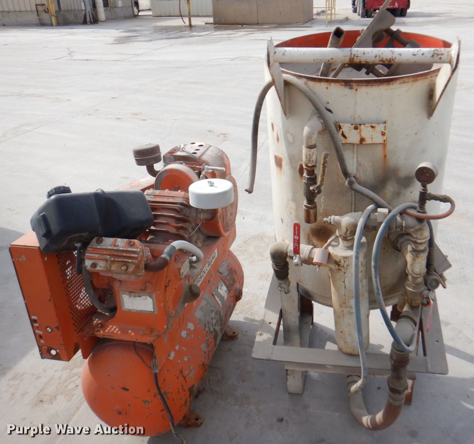 Ingersoll Rand 10FGT air compressor. Serial: 30T576482. Engine Kohler, Cylinders: 1, Fuel type: Gas. Features Ingersoll T-30 Tank capacity: 30 gallons. Notes Unknown operating condition. Schmidt sand blaster Unknown operating condition. Kansas Sand & Concrete - Open inspection May 3. 531 NW Tyler St. Topeka, KS 66608