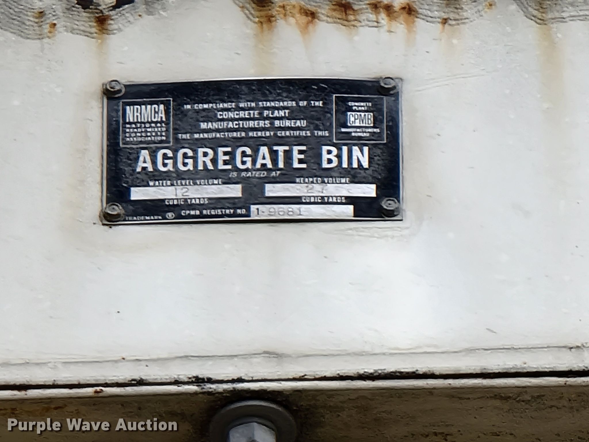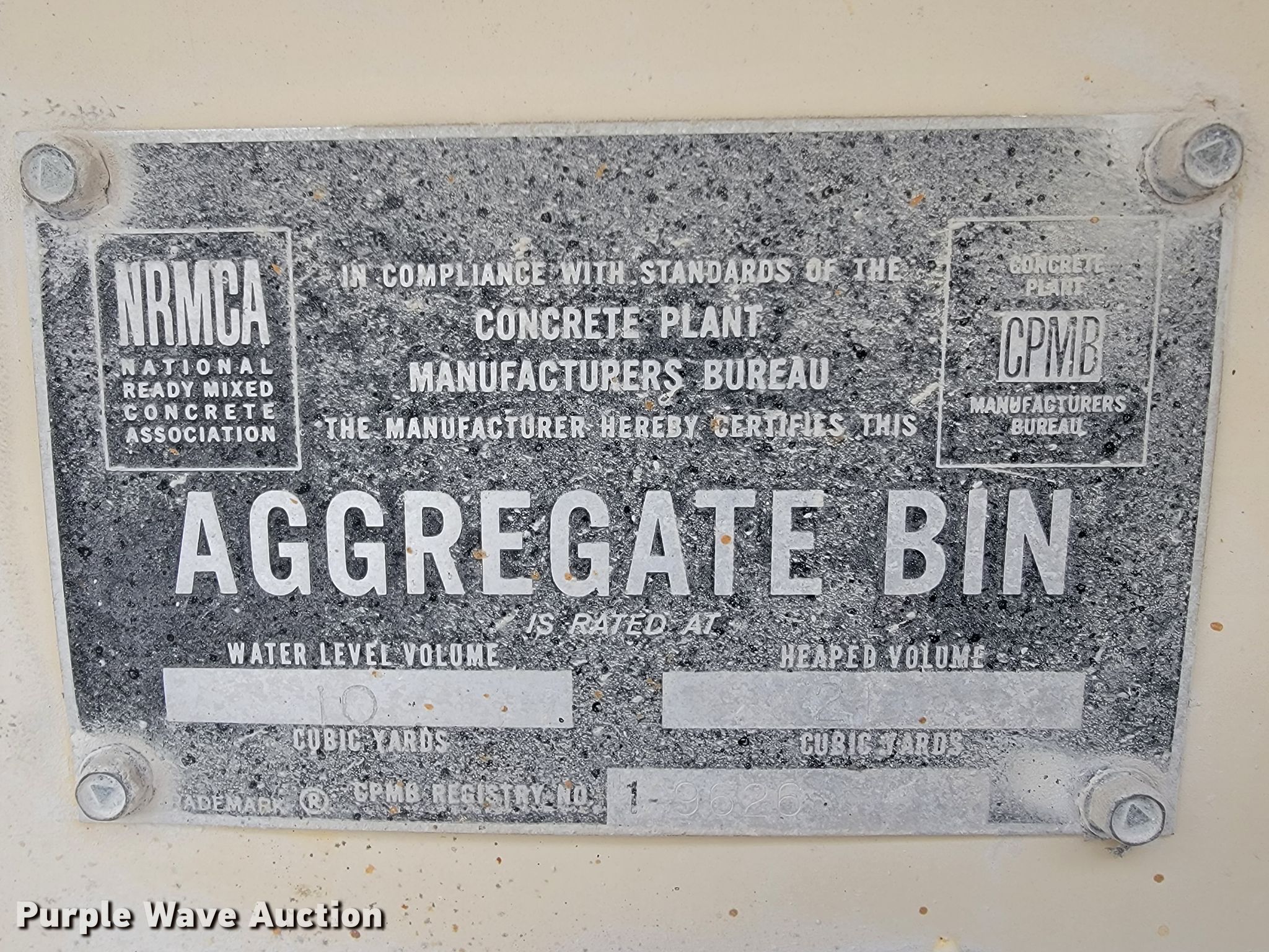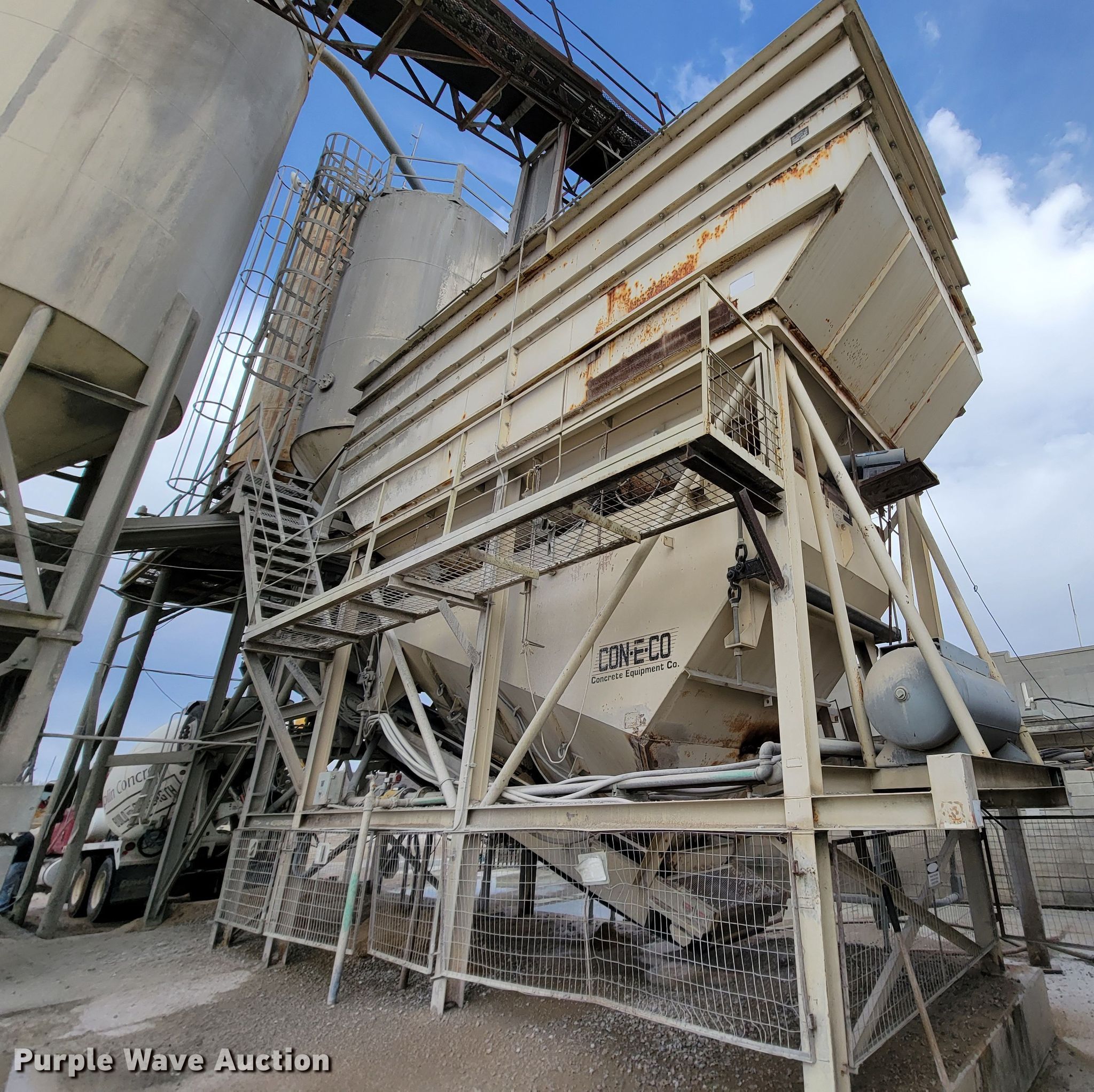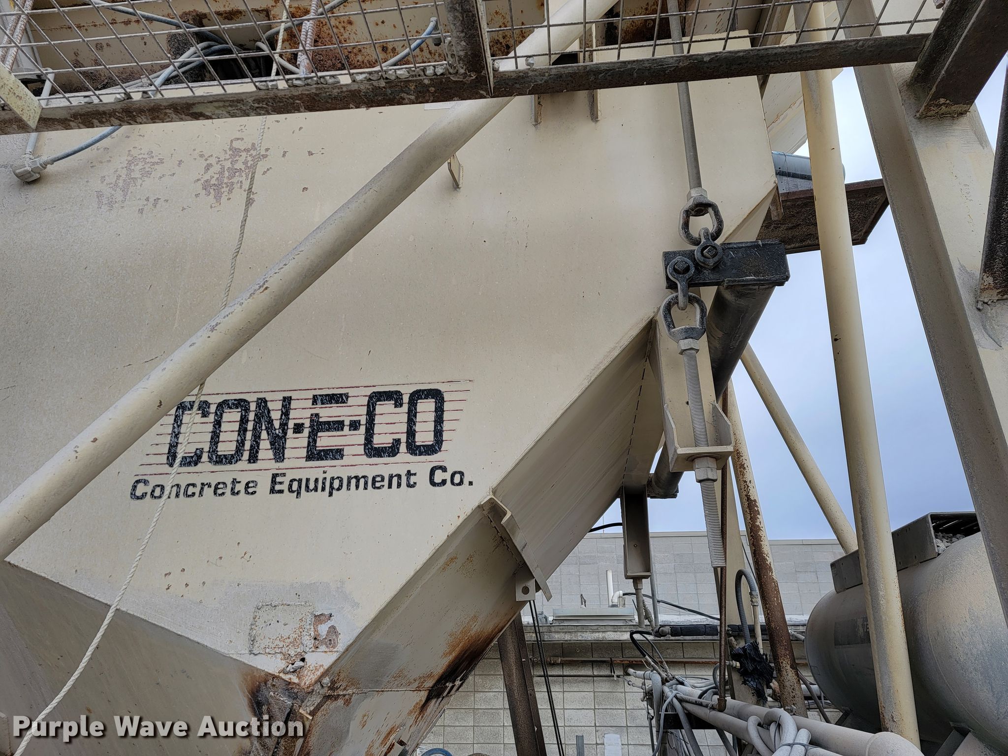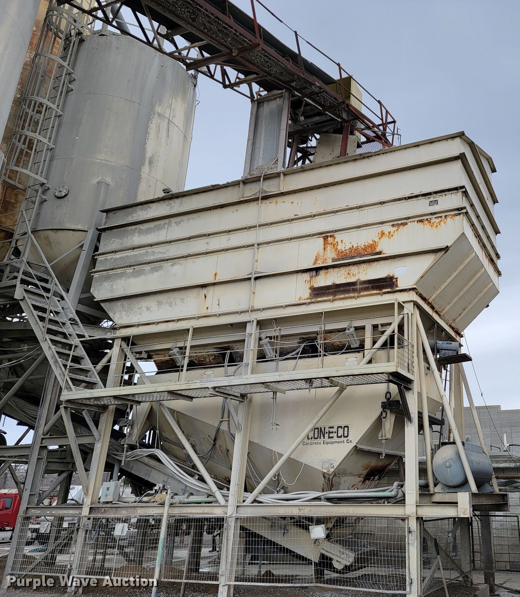 Purple Wave is selling a used Batch Plant or Surge Bin in Missouri. This item is a Con-e-co All Pro 10 aggregate bins with the following: Batcher, Capacity: 10 cu. yds., Water capacity: 10 cu. yds., Heaped volume: 21 cu. yds., Bin, Water capacity: 12 cu. yds, Heaped volume: 27 cu. yds