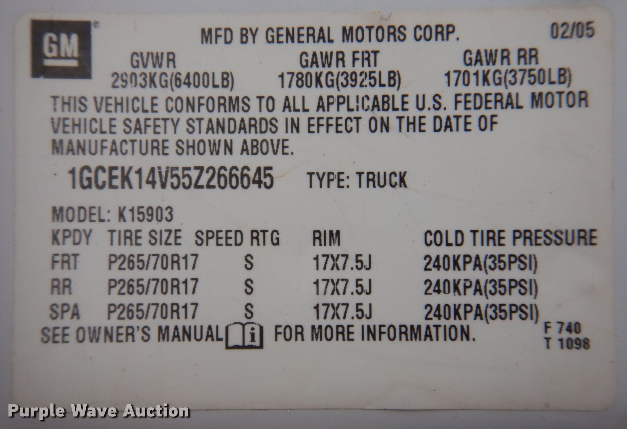- VIN: 1GCEK14V55Z266645