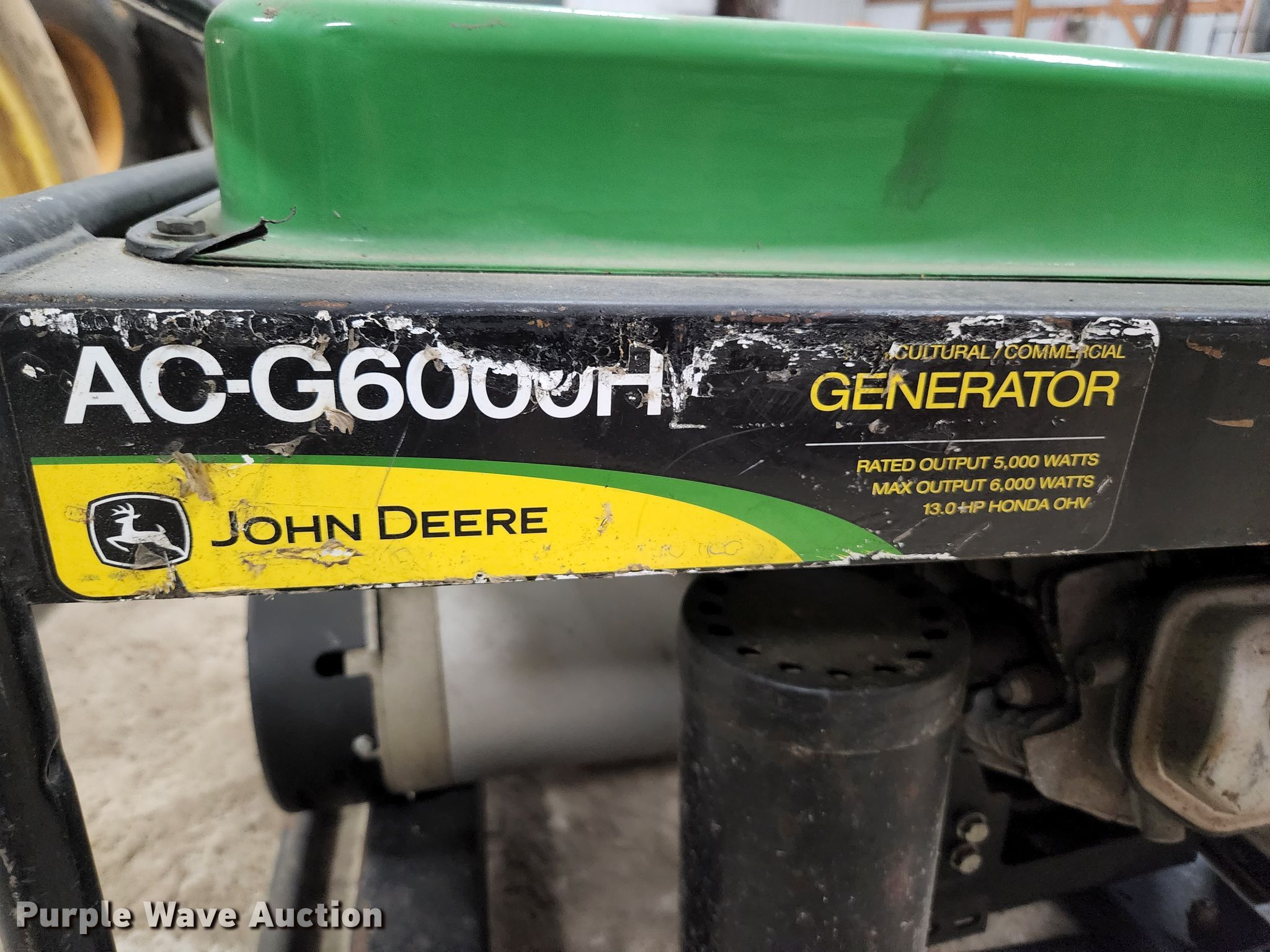 John Deere AC-G6000H generator. Hours: 353 on meter. Engine Honda, Cylinders: 1, Fuel type: Gas, HP: 13. Features Watts: 5,000, kVA: 5.7, Phase: Single. Notes Motor mount issues. St Francois County. 1640 Woodlawn Dr. Farmington, MO 63640