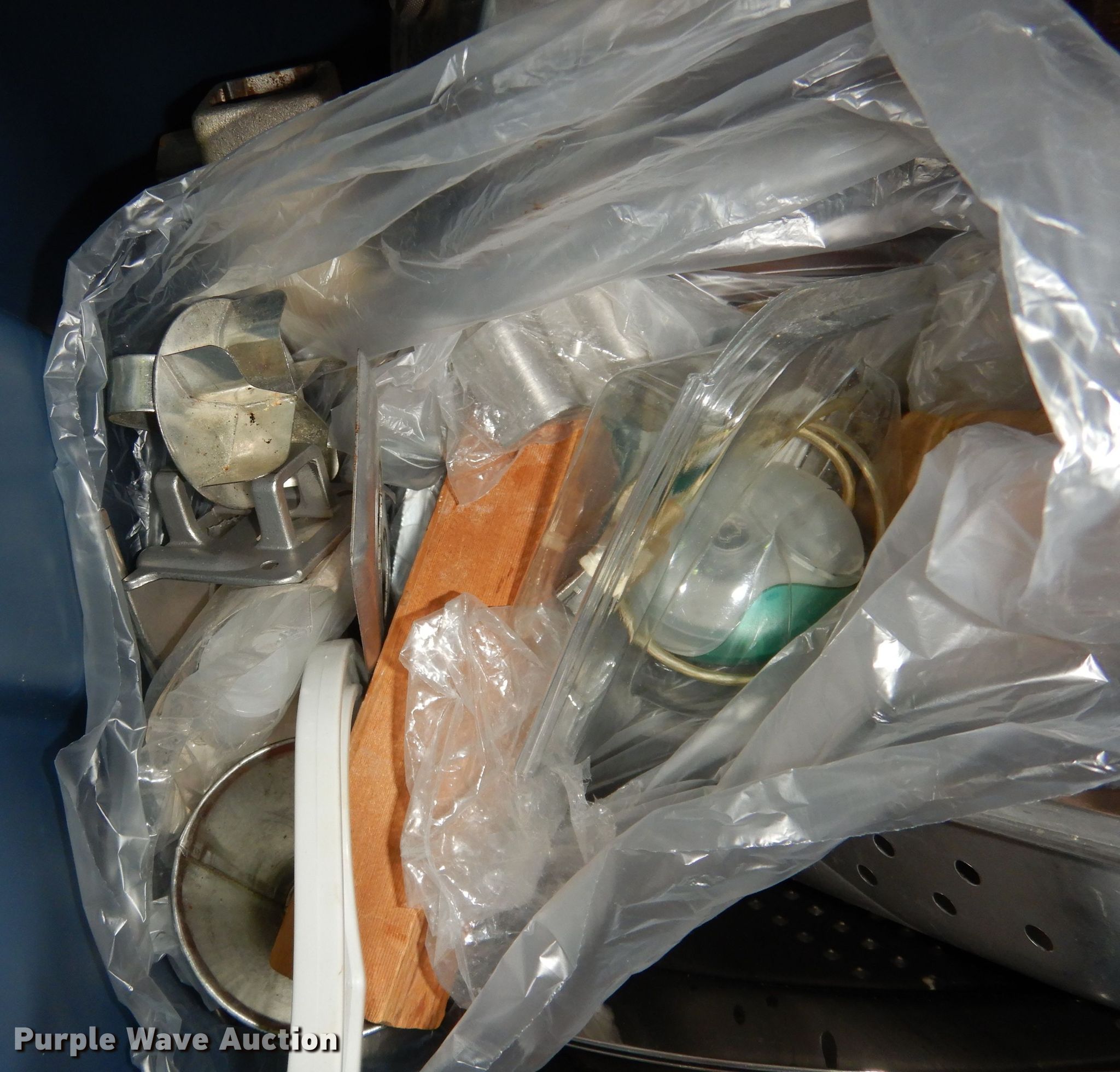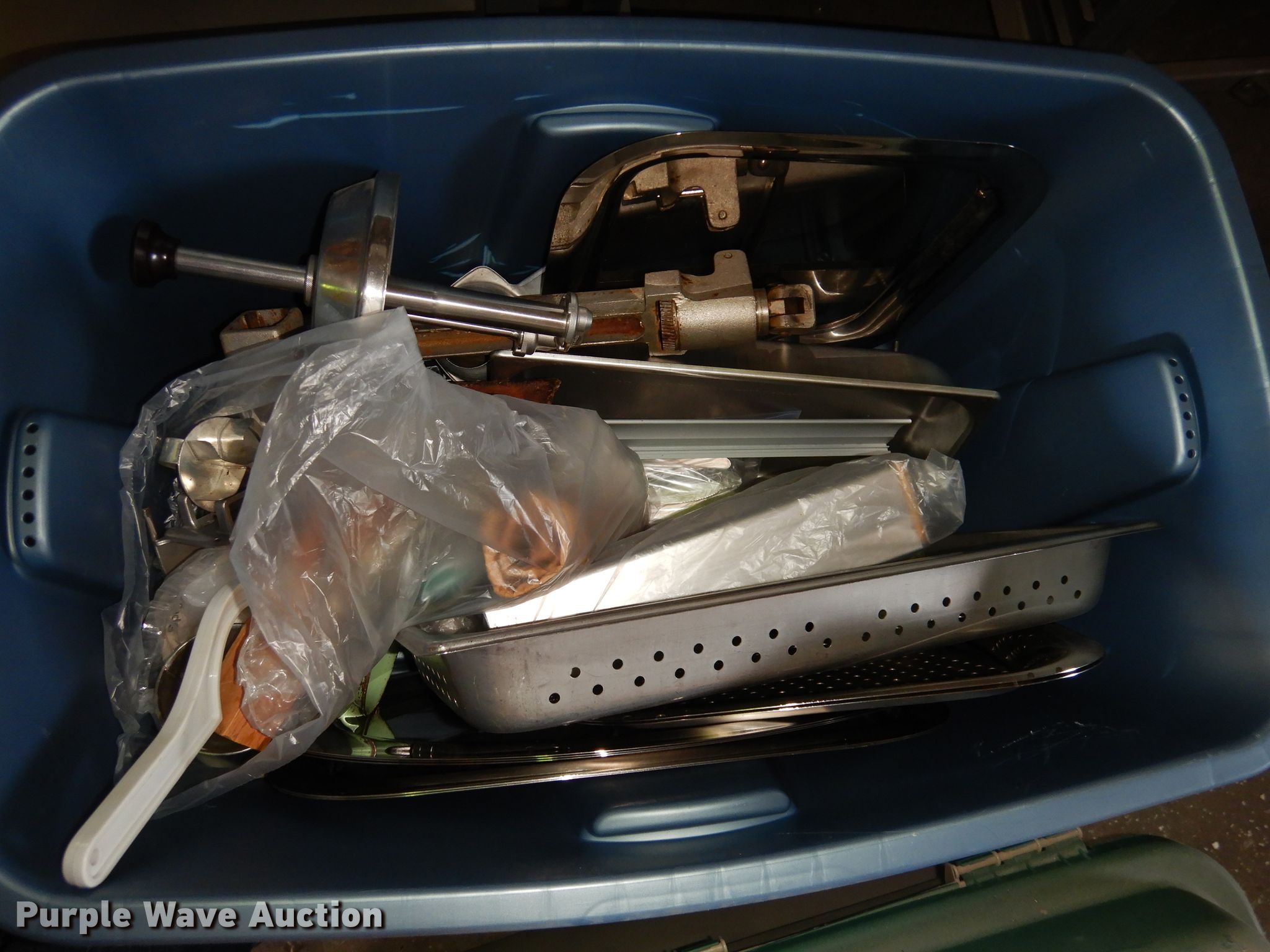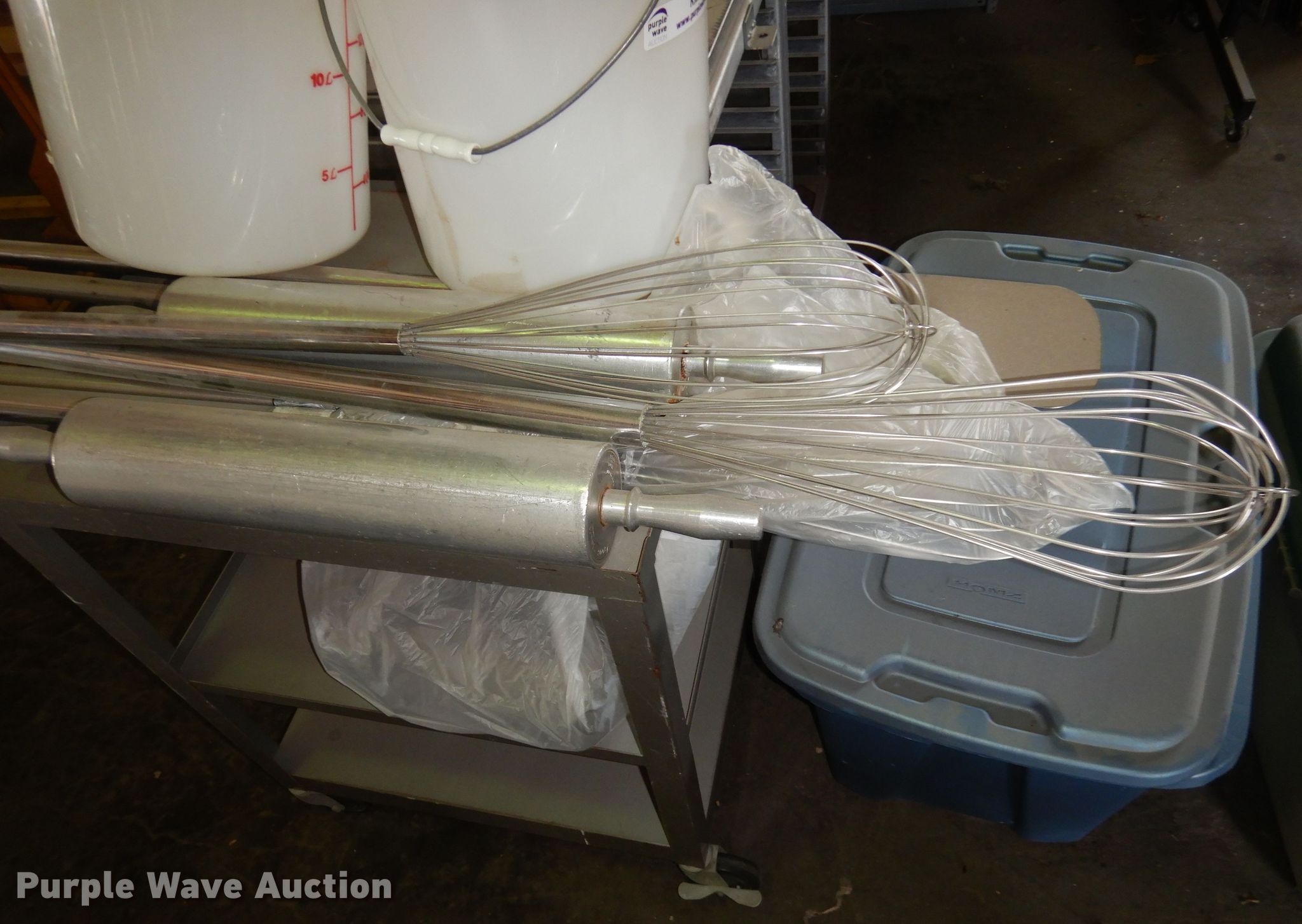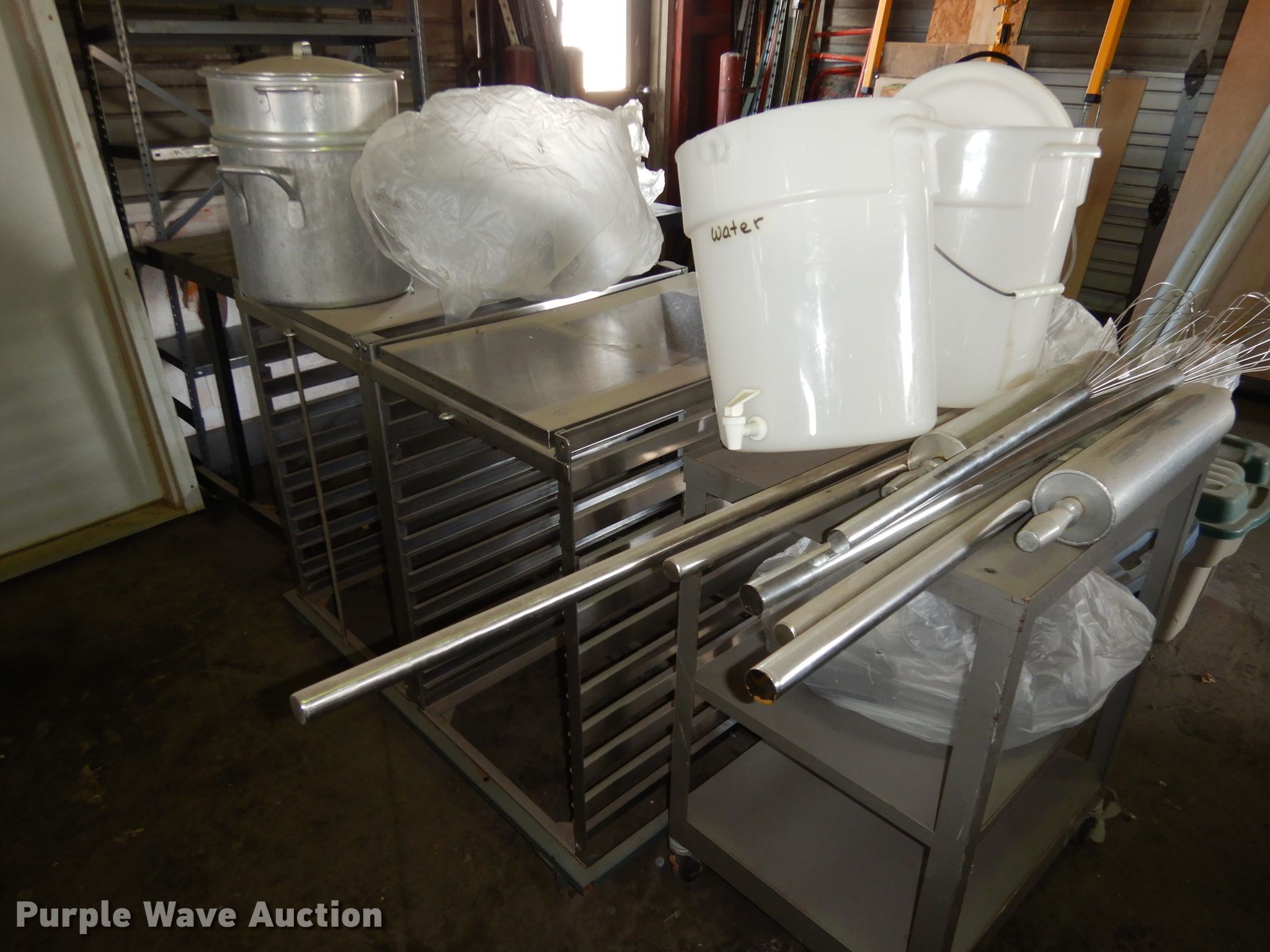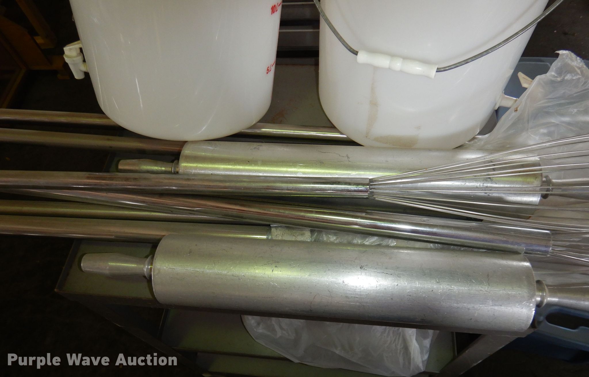 Purple Wave is selling a used Restaurant Equip. in Kansas. This item is a Restaurant equipment with the following: Whisks, Paddles, Mixer whip, Rolling pins, Buckets, Pots, Dry goods scale, Steam pans, Serving trays, Condiment dispenser, Racks and more
